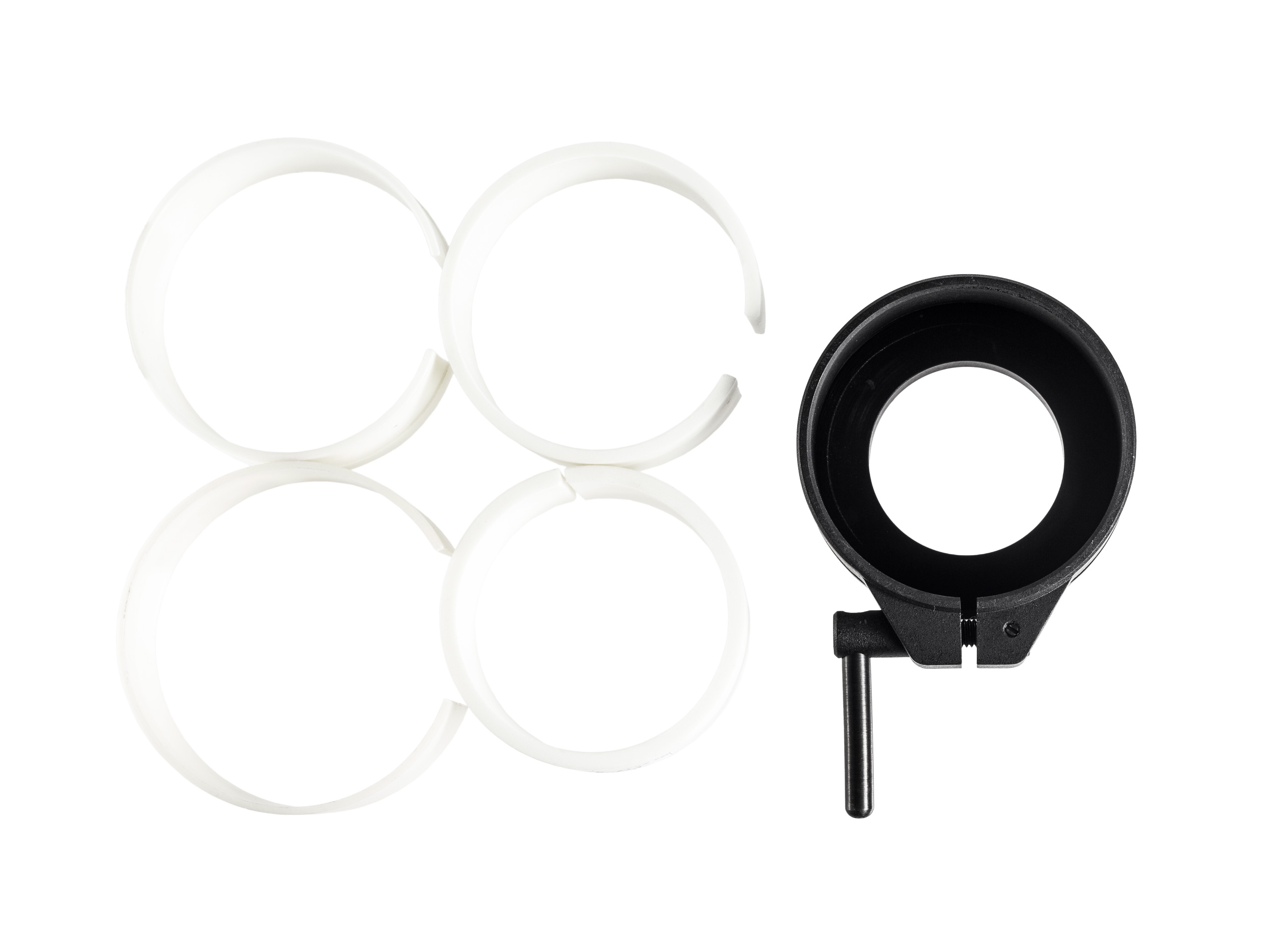Adapter tworzy stabilne połączenie pomiędzy lunetą i nasadką, jego montaż jest prosty i szybki i wymaga jedynie dokręcenia jednej śruby. W komplecie znajdują się 4 polimerowe adaptery, dzięki którym adapter może być stosowany do optyki o różnej średnicy.