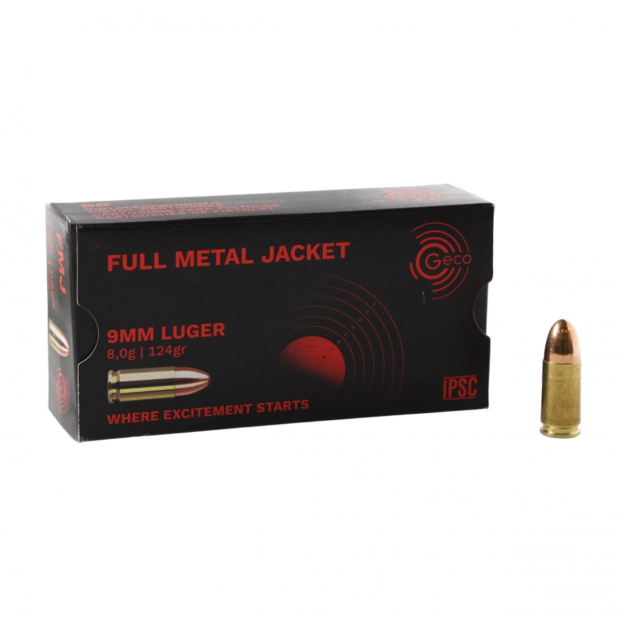 Amunicja w kalibrze 9mm 8g/124grs, typ pocisku FMJ.