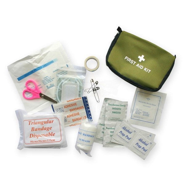 Elementy wyposażenia apteczki: 5 × plastrów, 4 × gaziki sterylne, 4 × gaziki z alkoholem do odkażania, gaza z włókniny, sterylny opatrunek, bandaż 5 cm x 4,5 m, chusta trójkątna 96 × 96 × 135 cm, 4 × agrafka, maseczka do resuscytacji, rolka taśmy, nożyczki