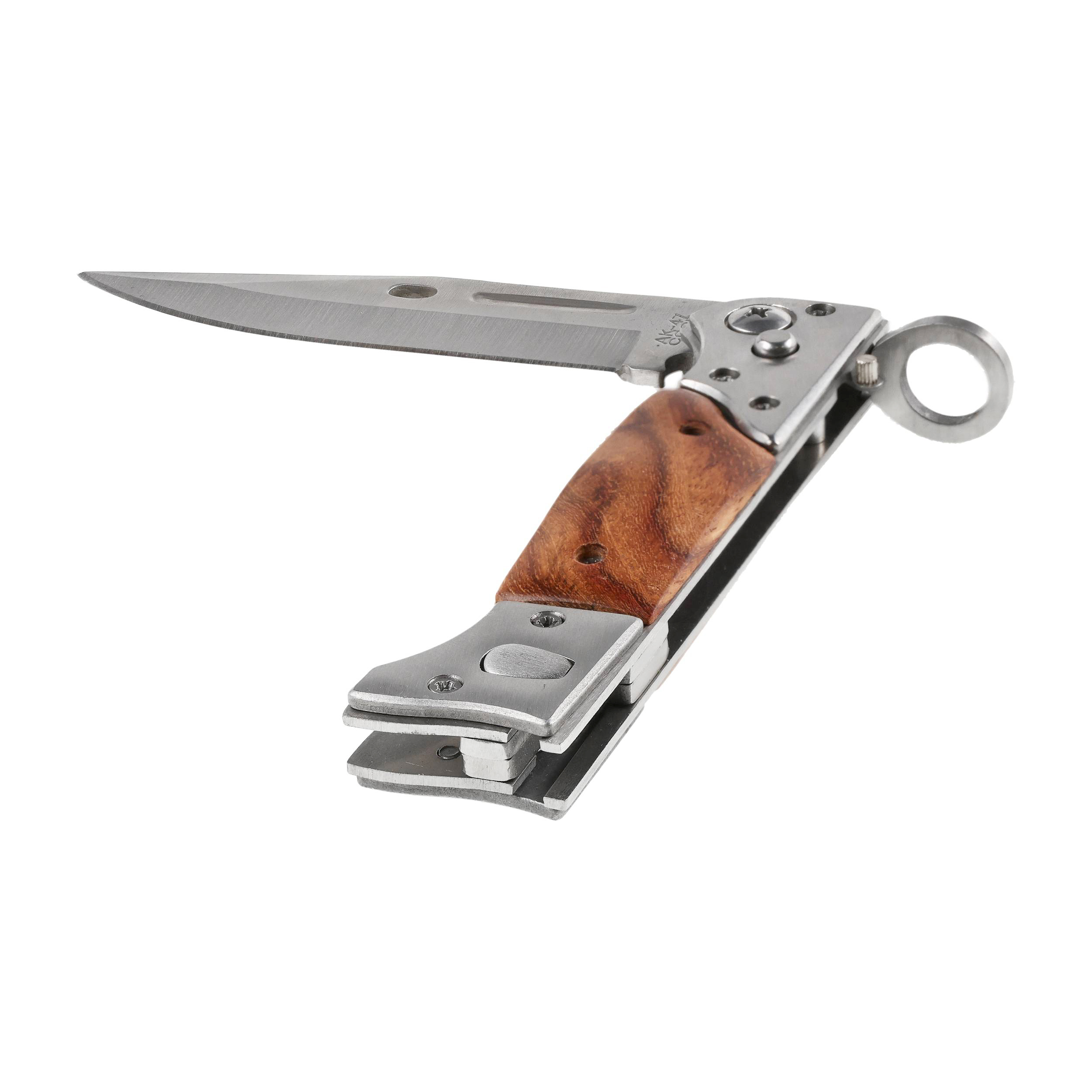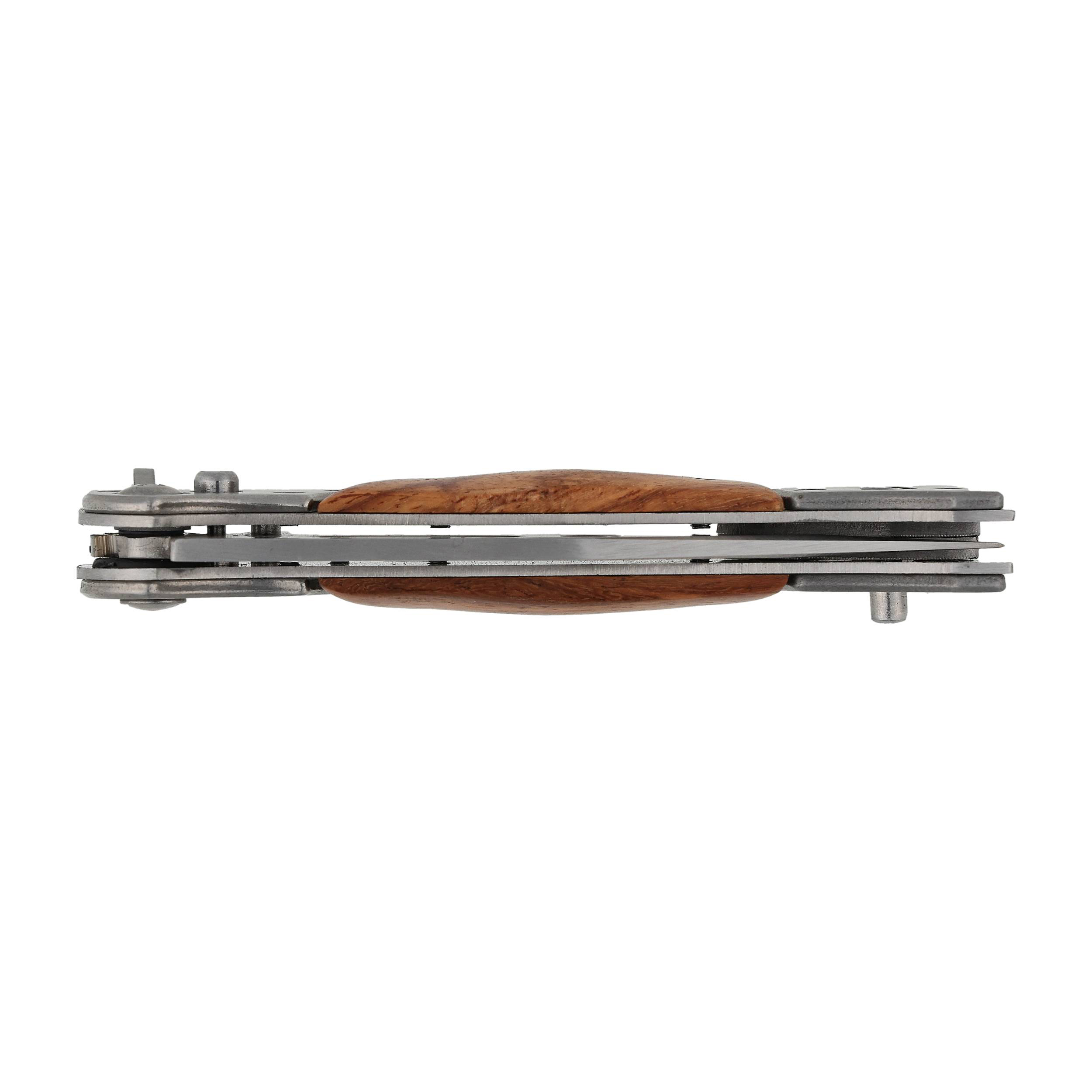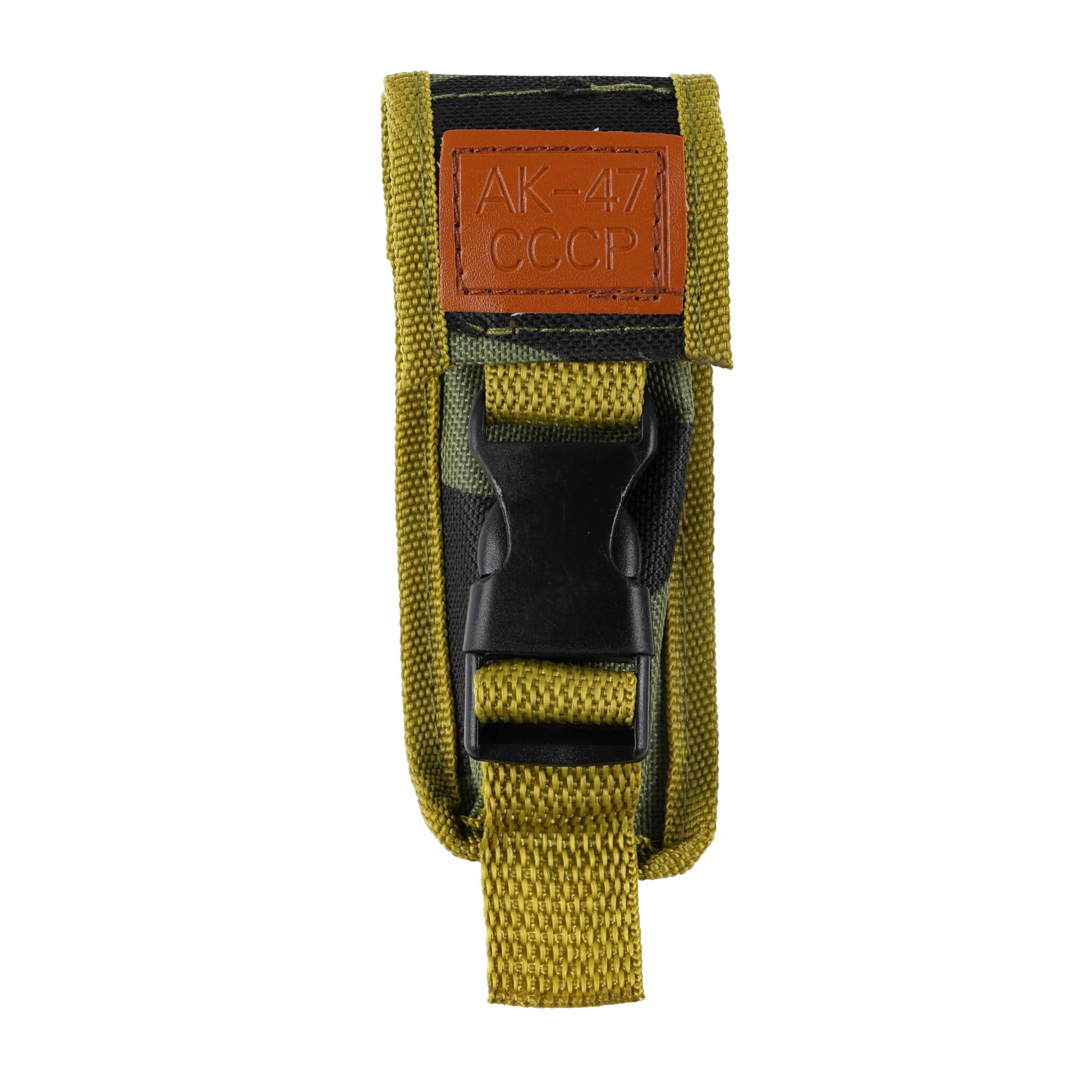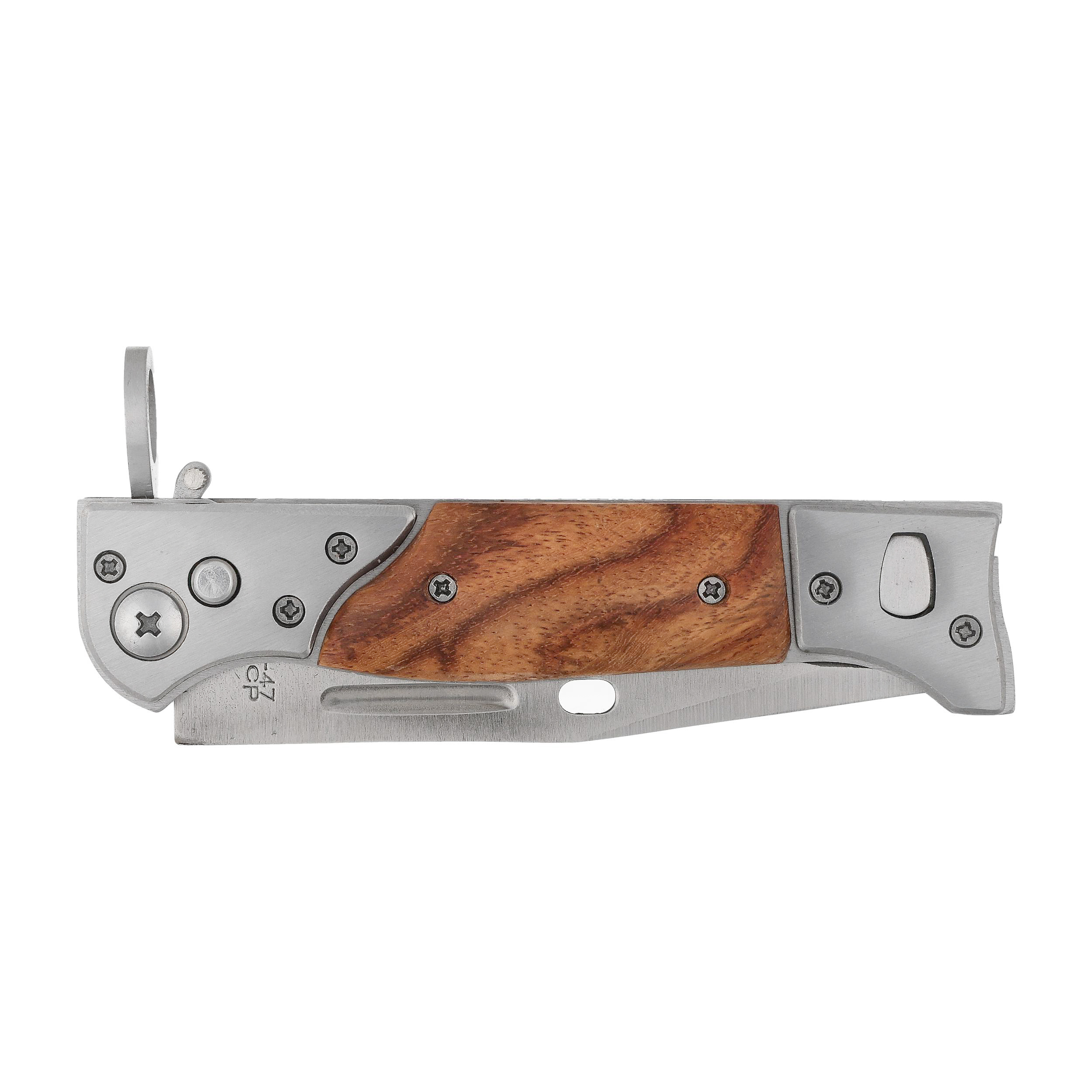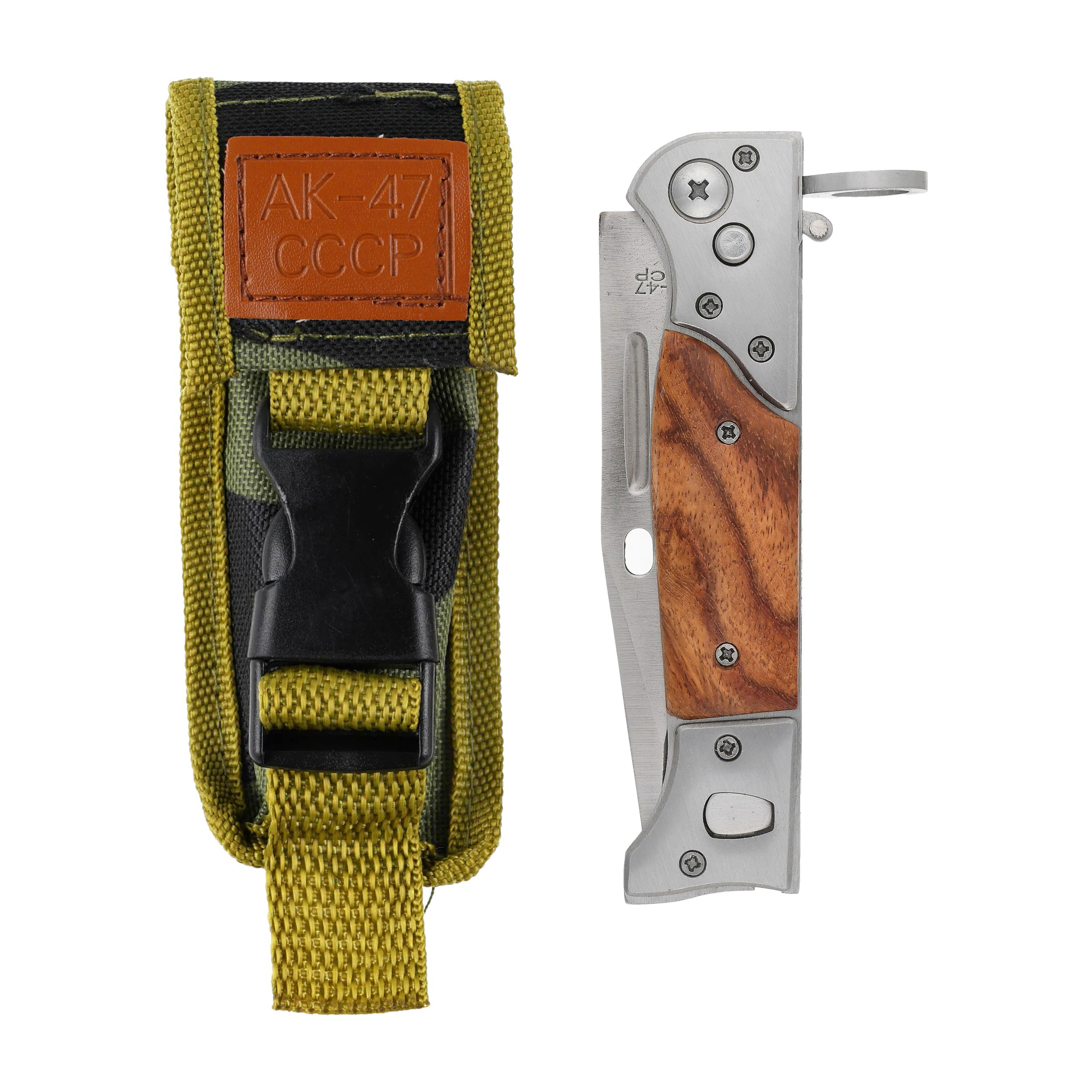 Ostrze noża wykonano ze stali nierdzewnej 440, cechującej się długim dobrą twardością oraz łatwą do wyostrzenia w warunkach terenowych. Smukła klinga rozkładana jest automatycznie po naciśnięciu bocznego przycisku, co zapewnia wygodę obsługi i natychmiastową gotowość noża do pracy. Przed przypadkowym złożeniem ostrza chroni wewnętrzna blokada. Okładziny rękojeści wykonano z drewna, co dodatkowo akcentuje militarny charakter noża. W nawiązaniu do oryginalnego bagnetu AK 47, nóż ma stalowy pierścień służący pierwotnie do osadzania bagnetu na broni. Do przenoszenia noża na pasie otrzymujemy nylonowe etui zapinane na klamrę typu fastex.