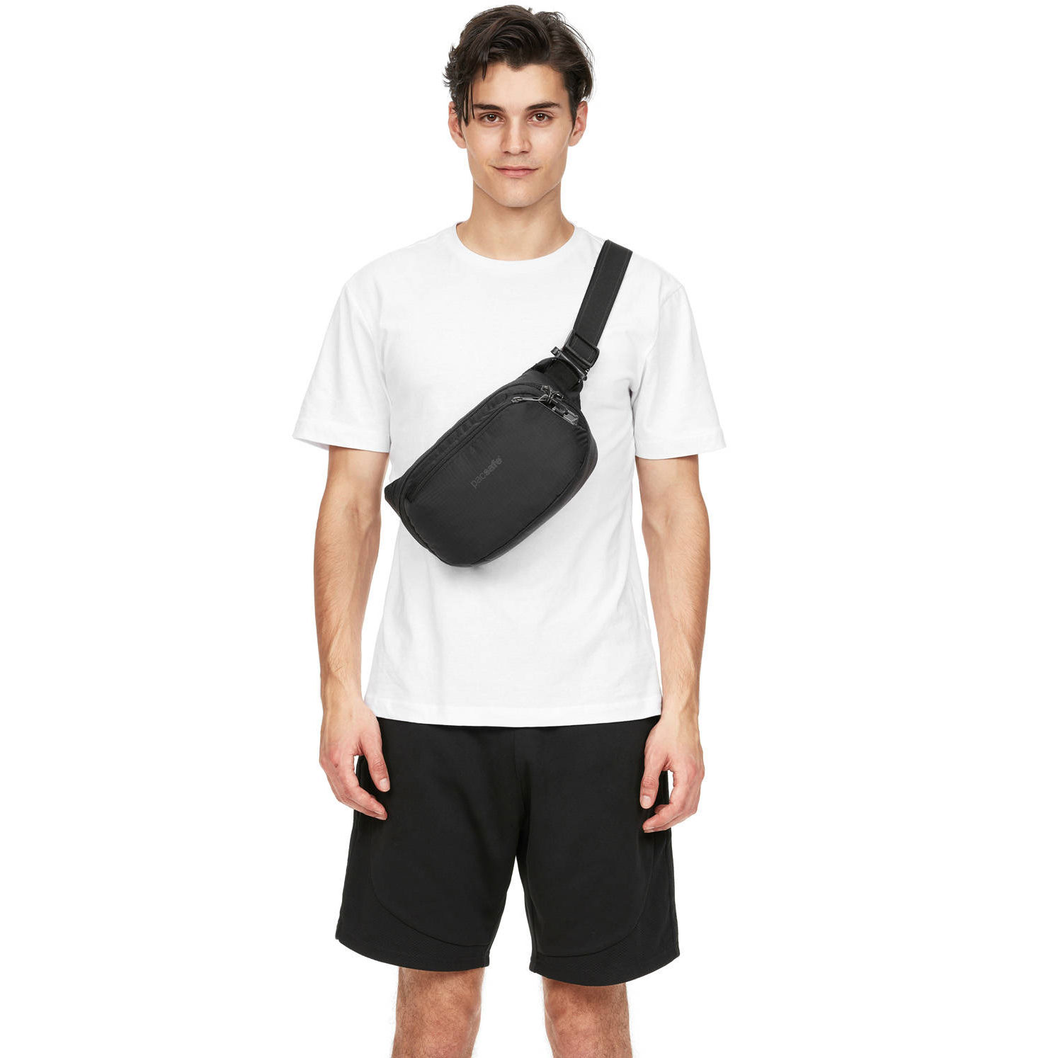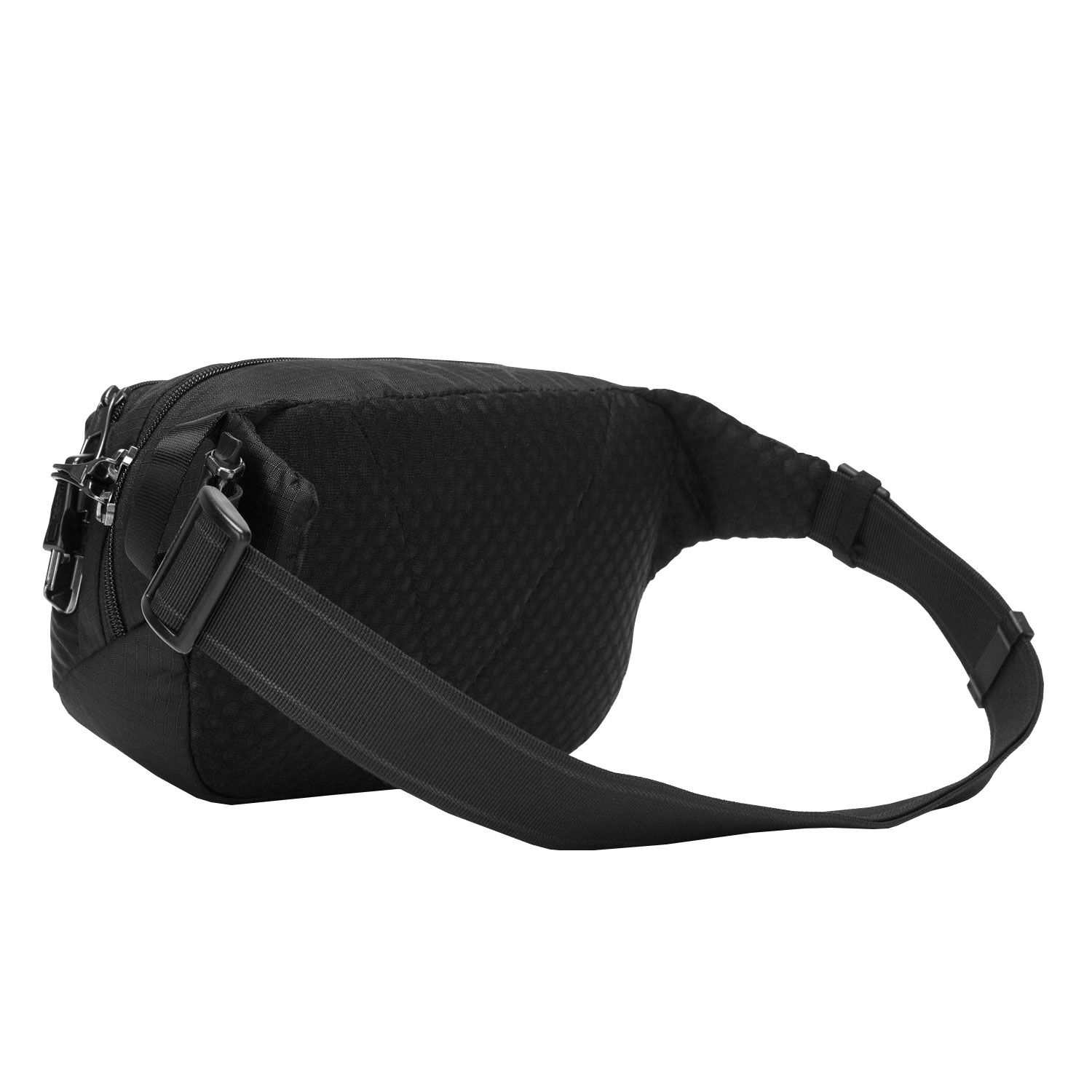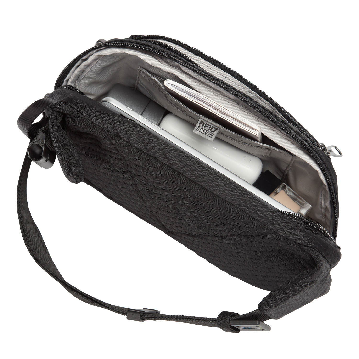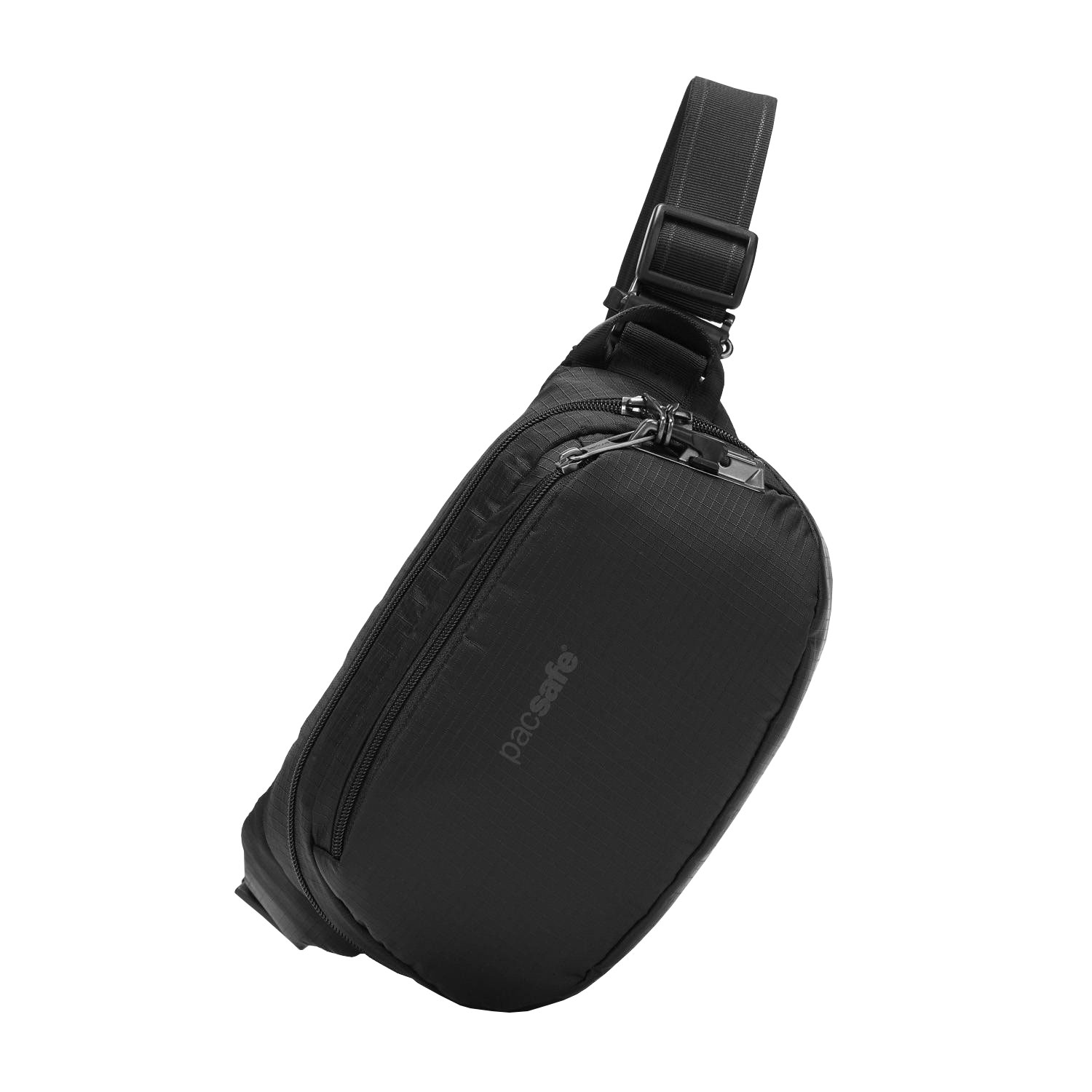 Pacsafe Vibe 100 to pojemna biodrówka saszetka antykradzieżowa, z membraną blokującą fale radiowe RFID, panelami Exomesh, paskiem odpornym na przecięcie oraz samoblokującymi się suwakami z zabezpieczeniem Robbar V.