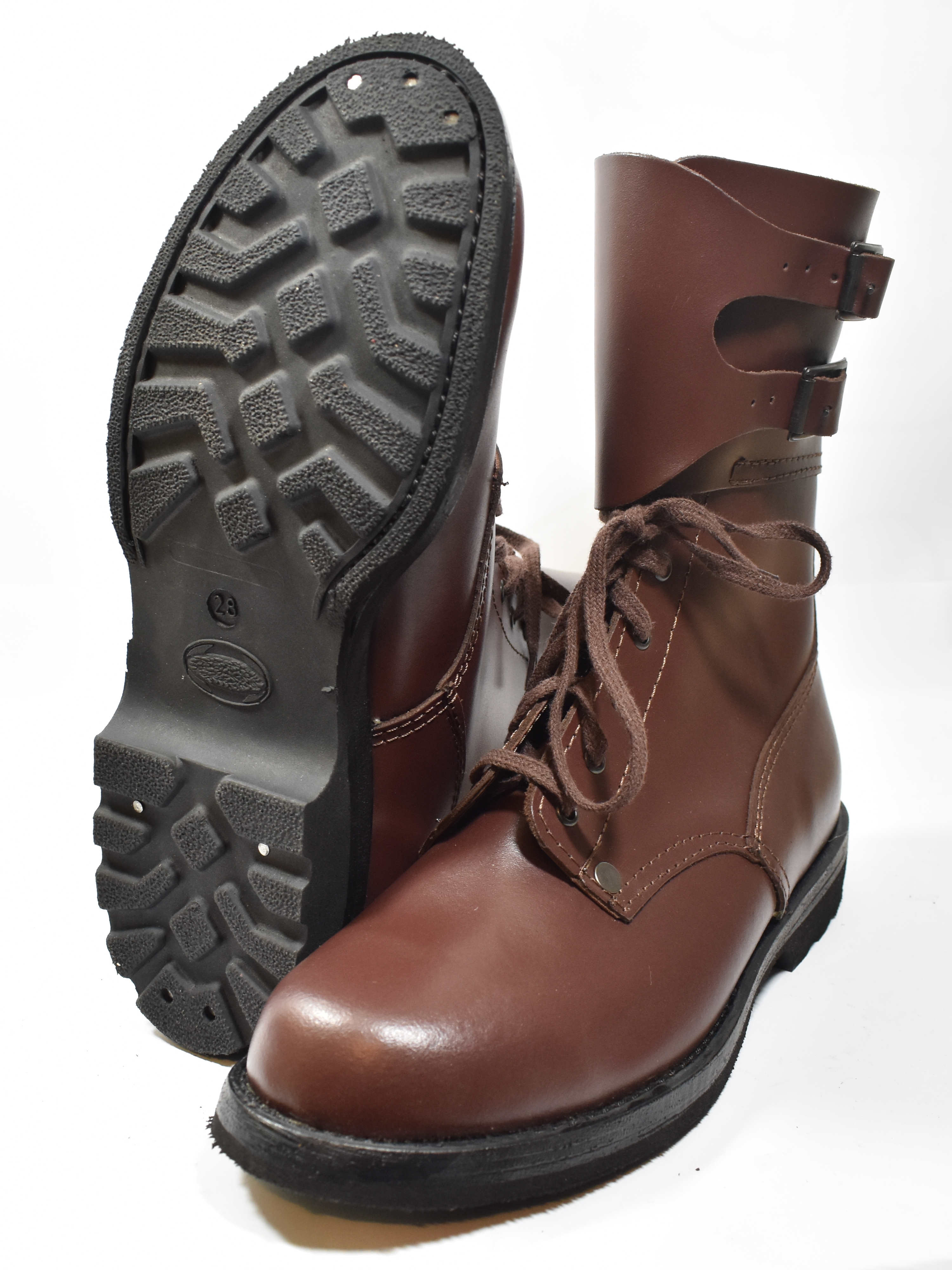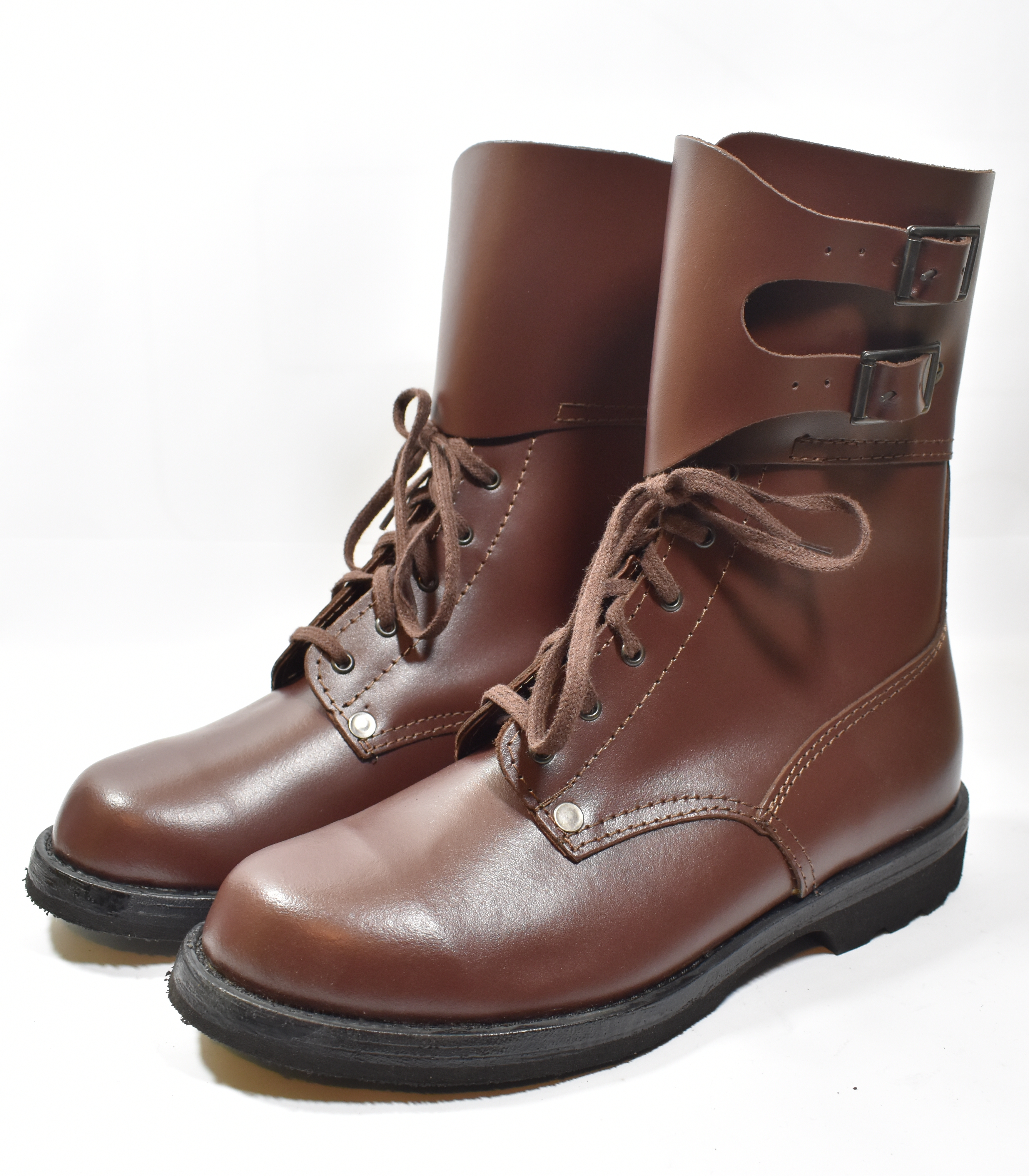 Klasyczne opinacze wykonane na wzór modelu wojskowego z brązowej skóry.