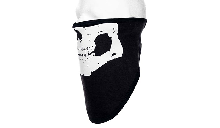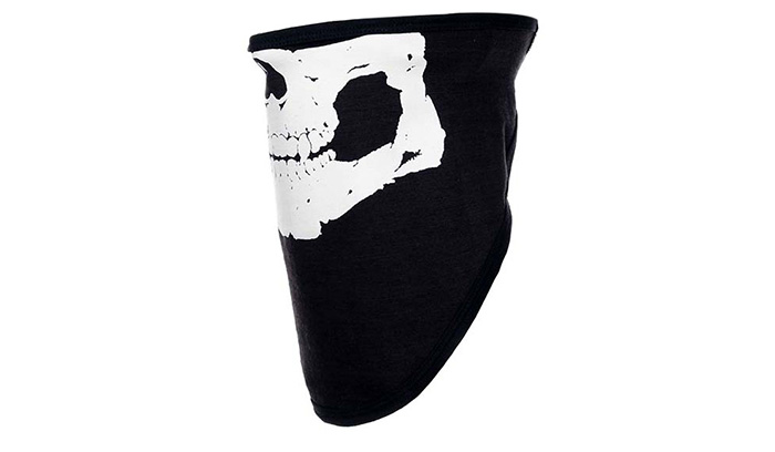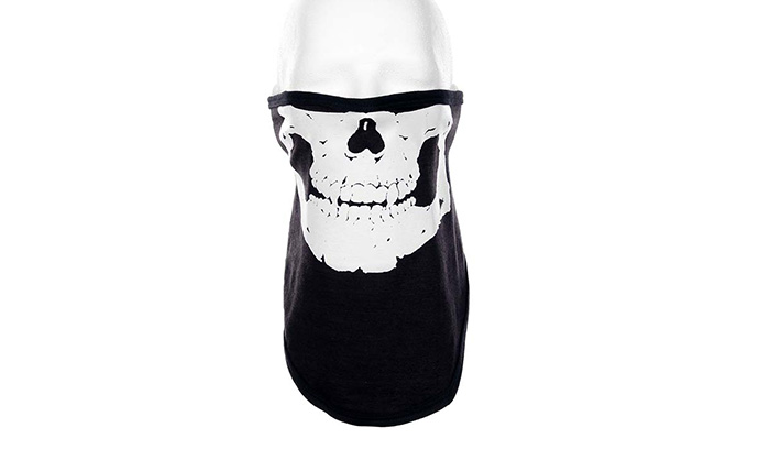 Długa czarna chusta na twarz, z zapięciem na rzep i białym nadrukiem z motywem czaszki.