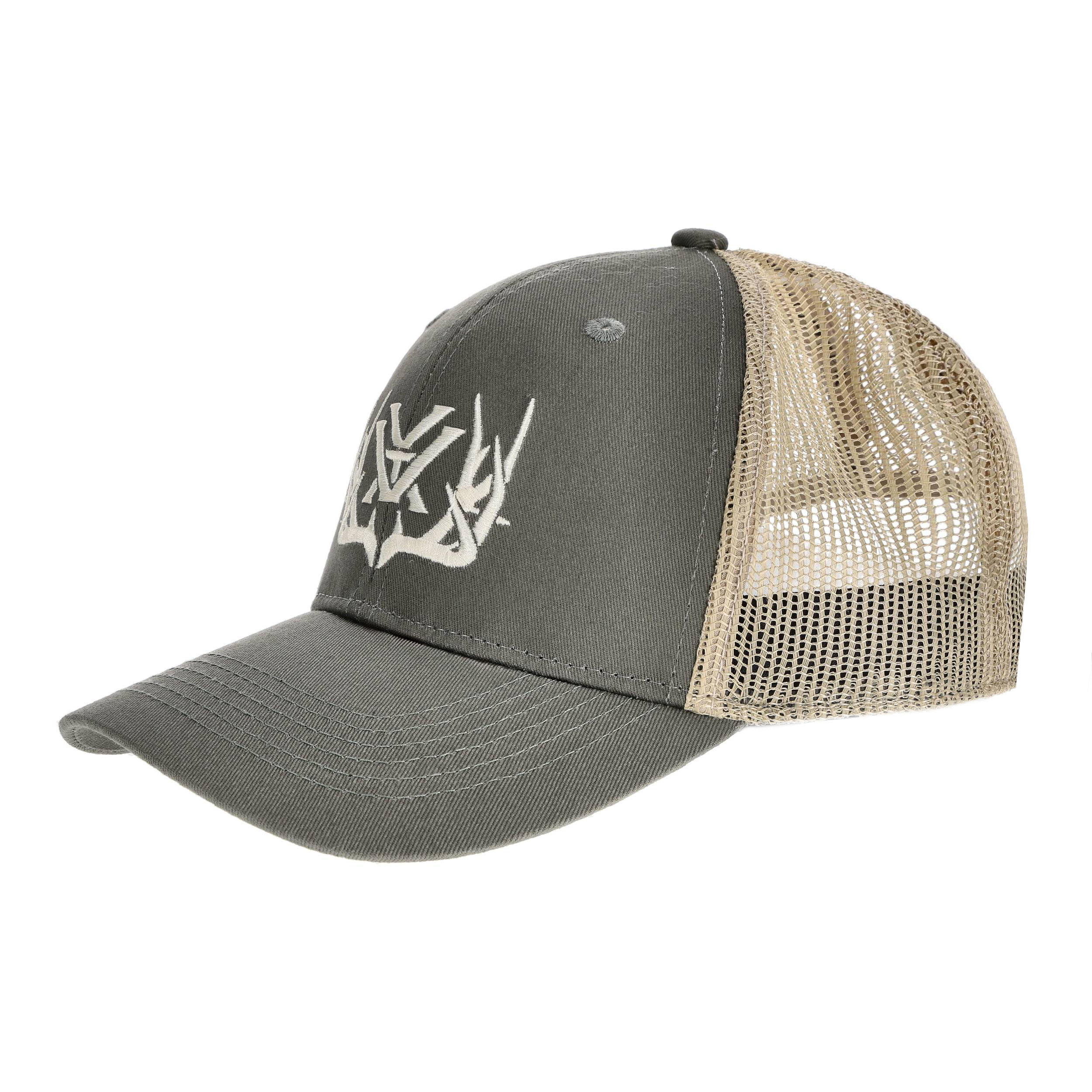 Vortex Full-Tine Job oliwkowa to baseballówka myśliwska z przewiewną siatką, utrzymana w czarno-szarej kolorystyce.