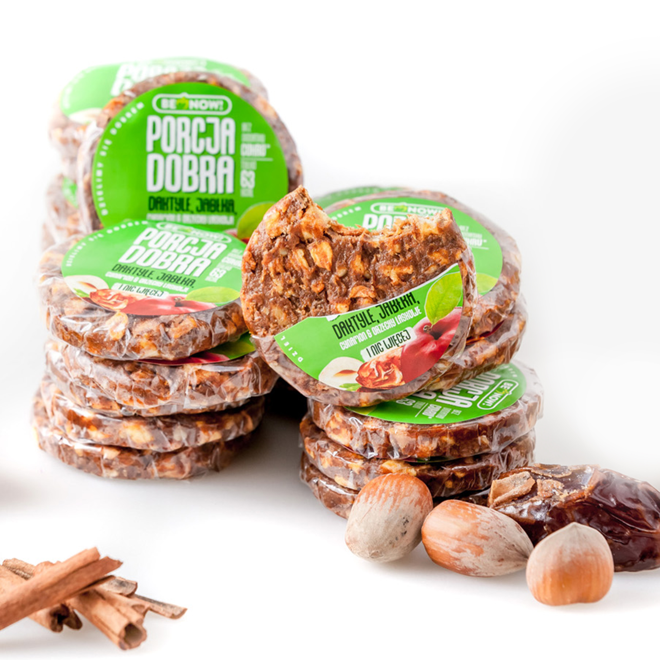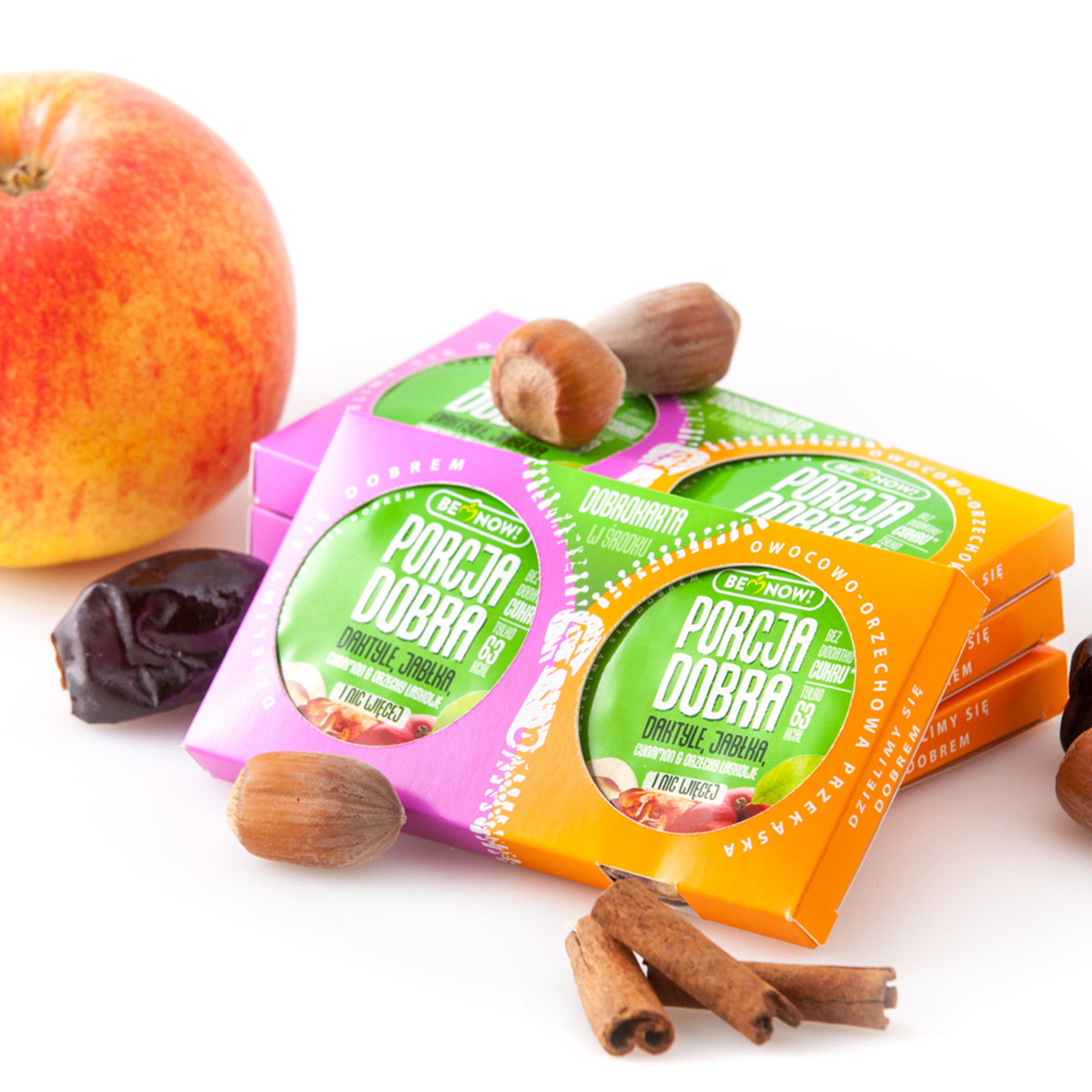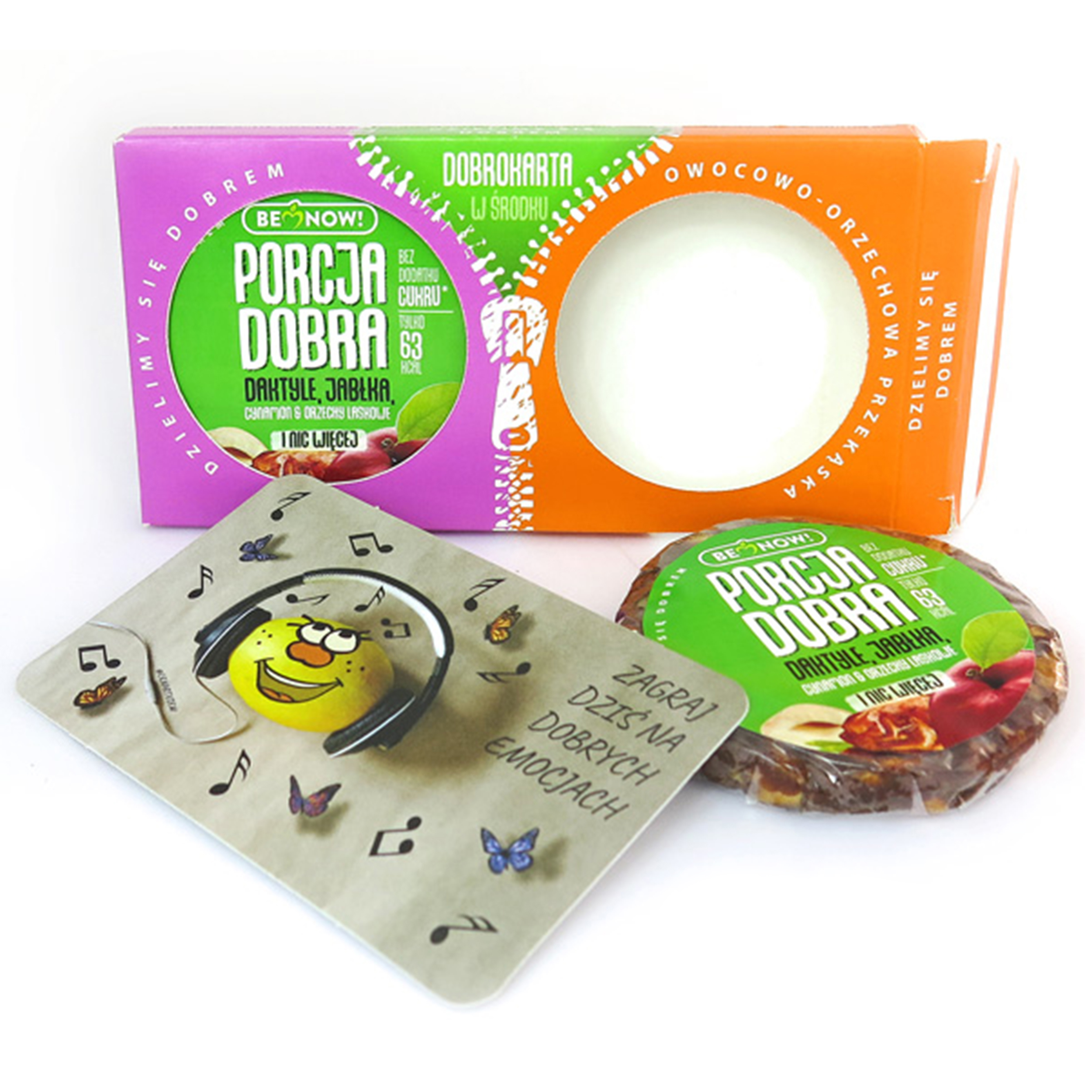 Dwupak kostka z niespodzianką od firmy Porcja Dnia jest najlepszą odpowiedzią na potrzeby dziecka. Łączy w sobie zdrową przekąską oraz zabawę w postaci dobrokarty. Smak owocowo-orzechowy z cynamonem.