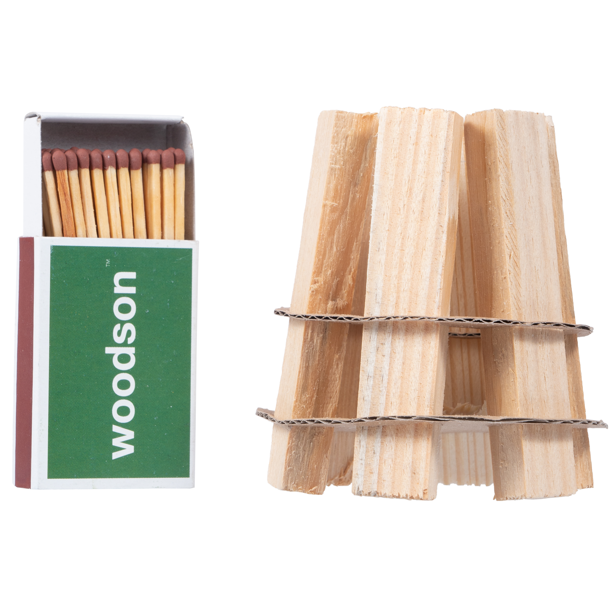 Elementy zestawu: pudełko zapałek, 6 sztuk ekologicznej rozpałki