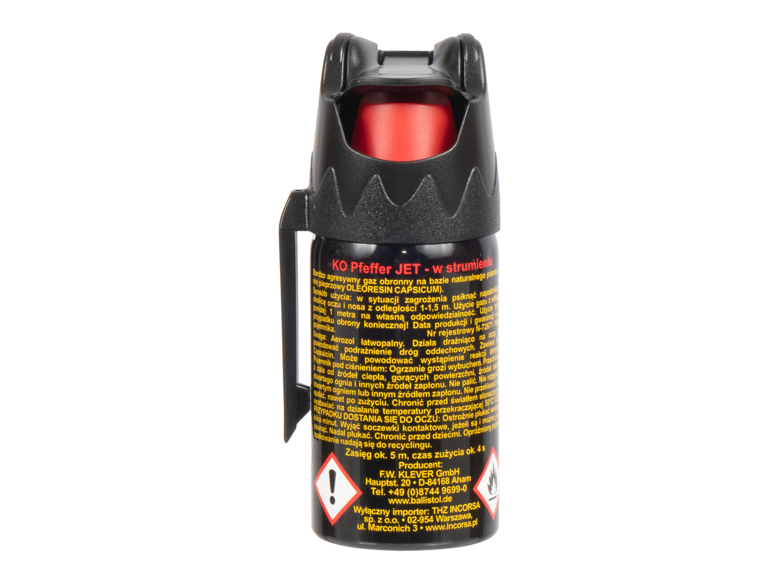 Ręczny miotacz gazu pieprzowego KO STRUMIEŃ 40 ml jest ławy w użyciu, dzięki czemu bez konieczności długiego szkolenia możemy się nim posługiwać. Wystarczy wymierzyć i nacisnąć by ukierunkowany strumień gazu unieszkodliwił potencjalnego agresora. Ręczny miotacz gazu KO Pfeffer JET posiada zabezpieczenie przed przypadkowym jego użyciem. Czas działania jest uzależniony od ilości użytego gazu i może sięgać do kilku godzin, dając nam czas na to, by wezwać policję.