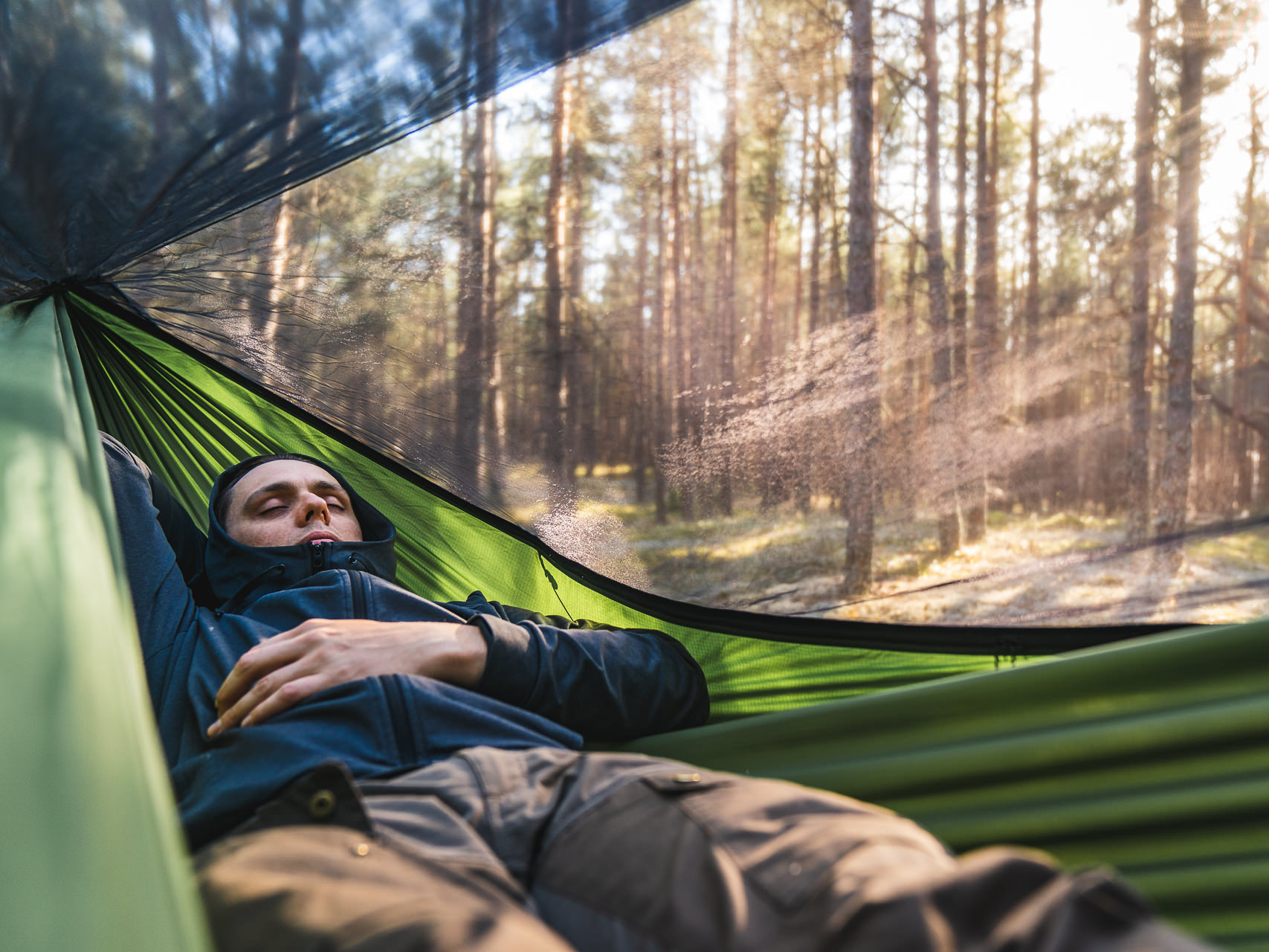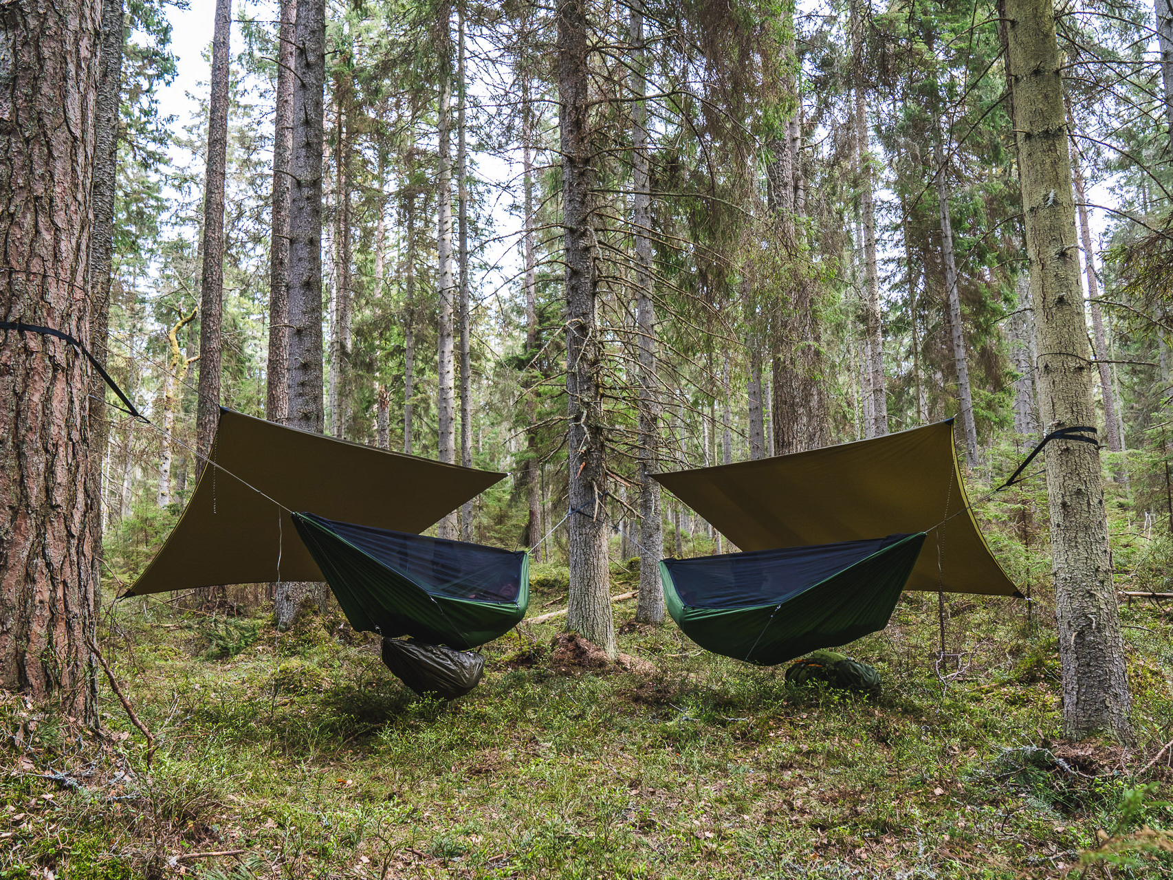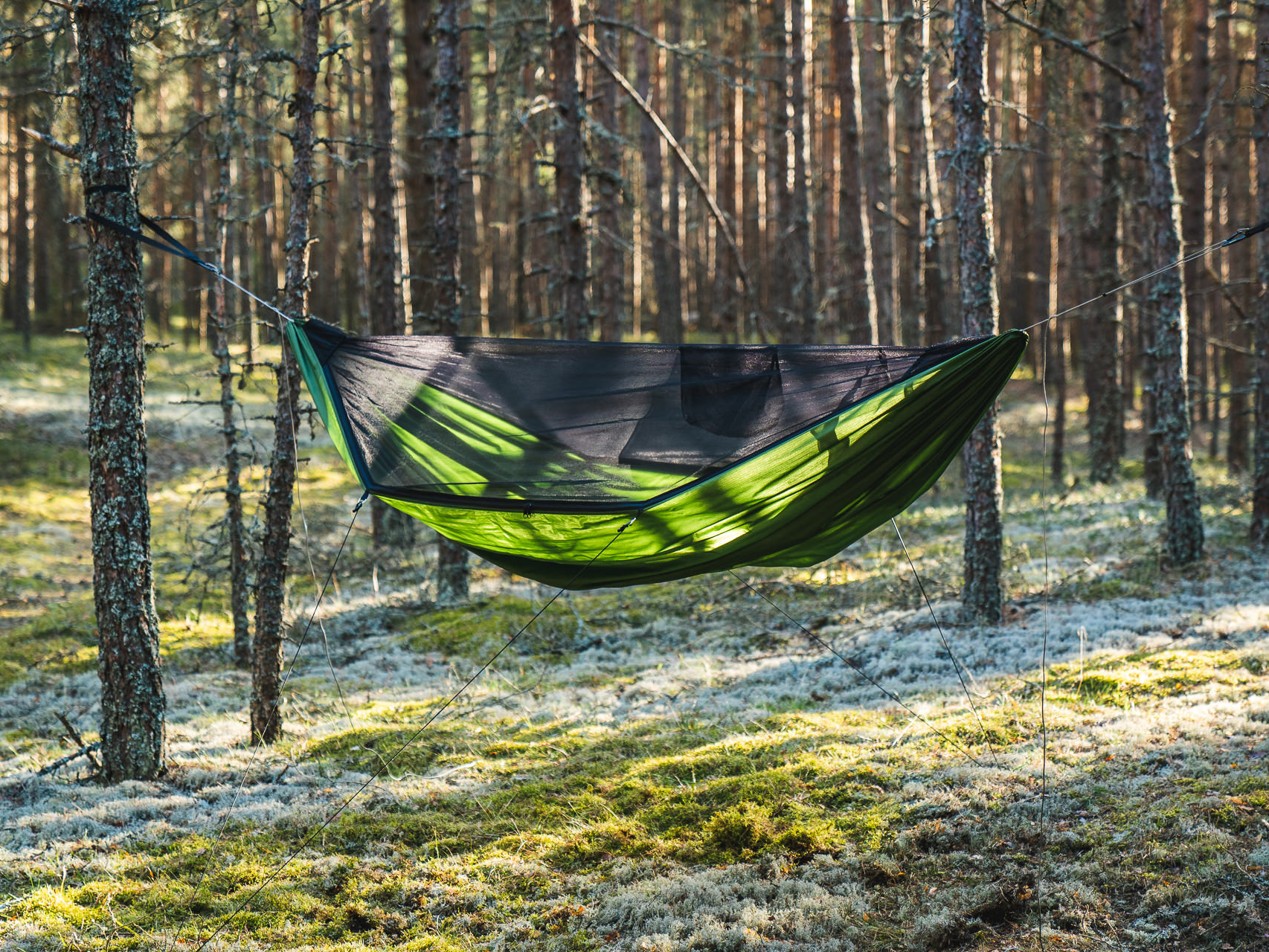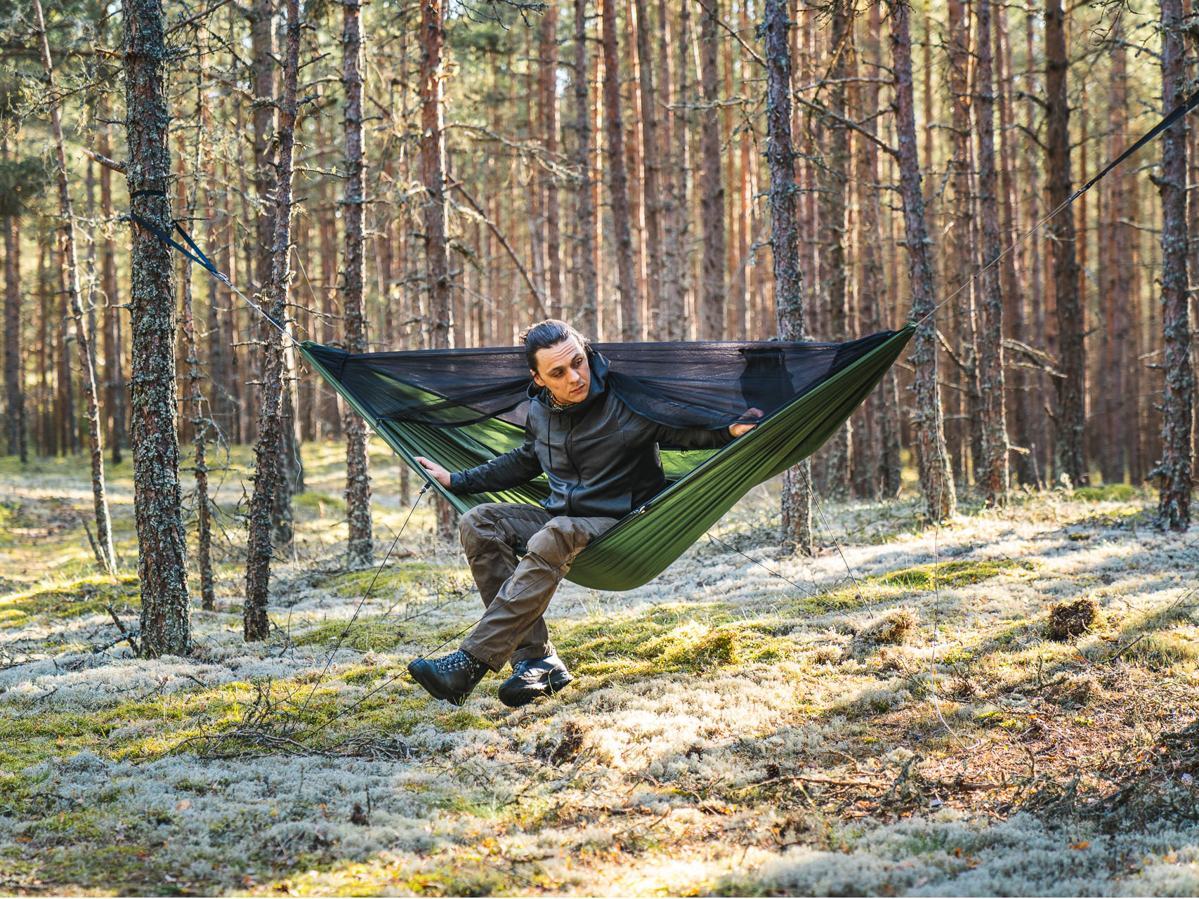 Do budowy hamaka zastosowano wytrzymały nylon o splocie rip-stop, ultralekki materiał odporny na uszkodzenia mechaniczne stosowany do produkcji wyposażenia wojskowego. Tkanina ze wplecioną siatką wytrzymuje obciążenie nawet kilkuset kilogramów, zachowując przy tym lekkość i wysoką oddychalność.
