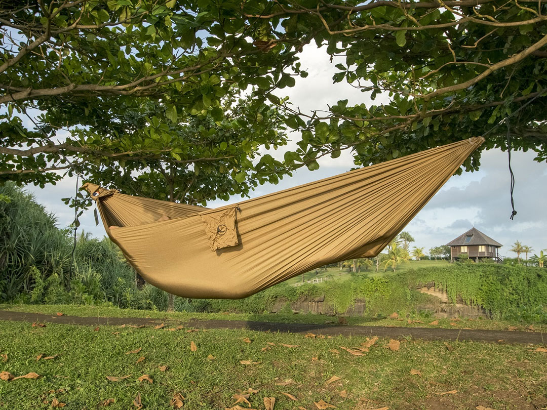 Hamak został wykonany ręcznie przez zespół wykwalifikowanych szwaczy. Do produkcji wykorzystano ultralekki nylon spadochronowy, tkaninę o dużej wytrzymałości mechanicznej, odporną na wilgoć, zabrudzenie oraz utratę koloru.