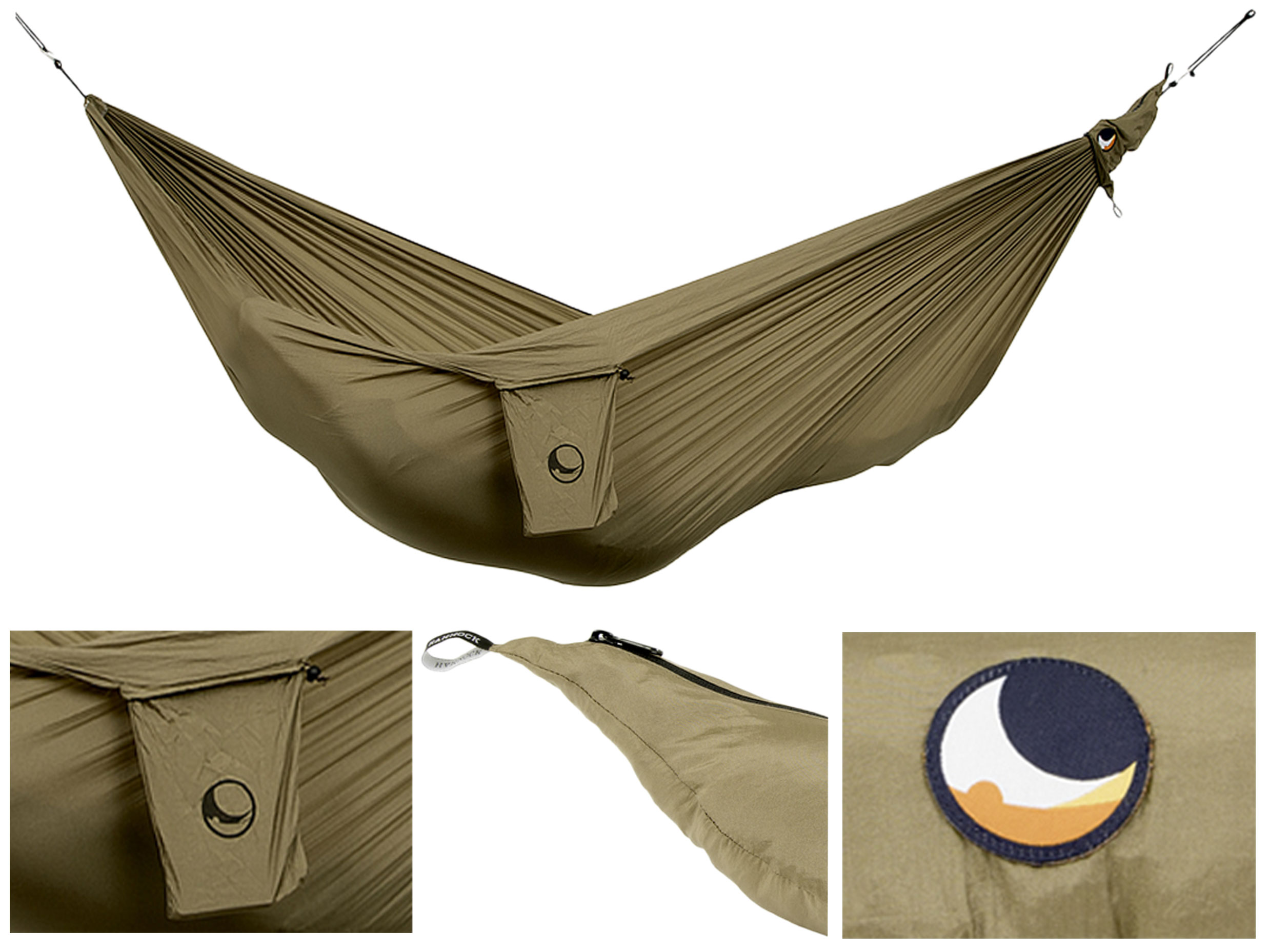 Hamak Ticket To The Moon jednoosobowy brązowy to lekki hamak turystyczny wykonany z szybkoschnącej tkaniny nylonowej gwarantującej wytrzymałość oraz komfort wypoczynku.