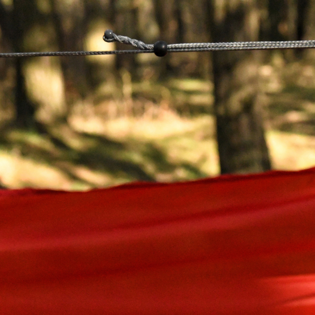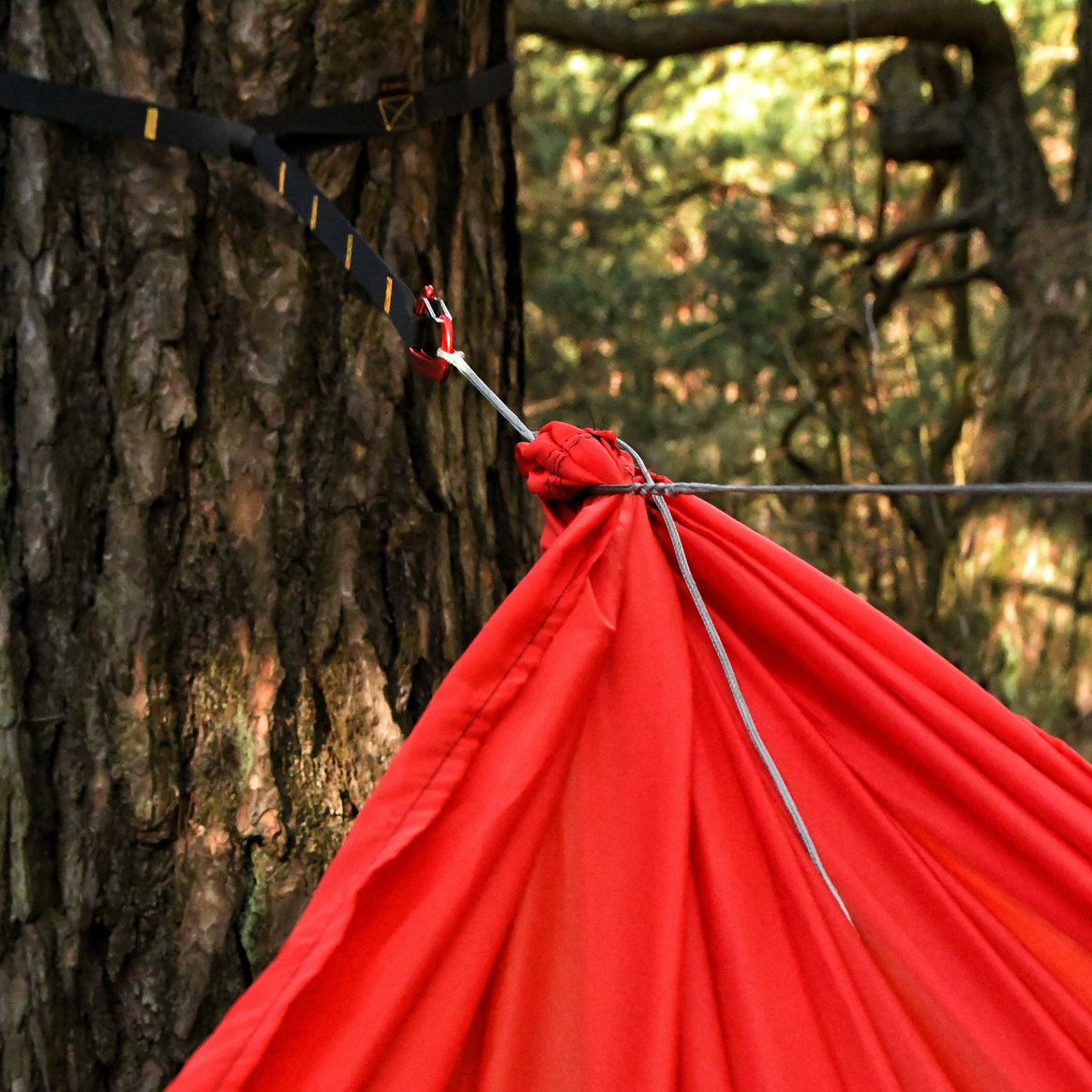 Sky Version to jednak nie tylko hamak, ale również wiele akcesoriów niezbędnych do jego wygodnego i szybkiego rozwieszenia. W ramach zestawu znajdziemy taśmy, które dzięki linii pętli gwarantują możliwość bezwęzłowego rozwieszenia oraz regulacji pozycji hamaka. Dołączone karabińczyki wykonane są z aluminium, a ich konstrukcja sprawia, że są w stanie utrzymać do 300 kg obciążenia – przewyższają zatem odpornością materiał hamaka, gwarantując tym bezpieczeństwo podczas snu. Umieszczone w zestawie linki whoopie sling umożliwią precyzyjną regulację naciągu oraz kąta nachylenia hamaka, natomiast cięciwa pozwoli na odpowiedni rozkład napięcia, sprawiając, że wypoczynek będzie jeszcze bardziej komfortowy.