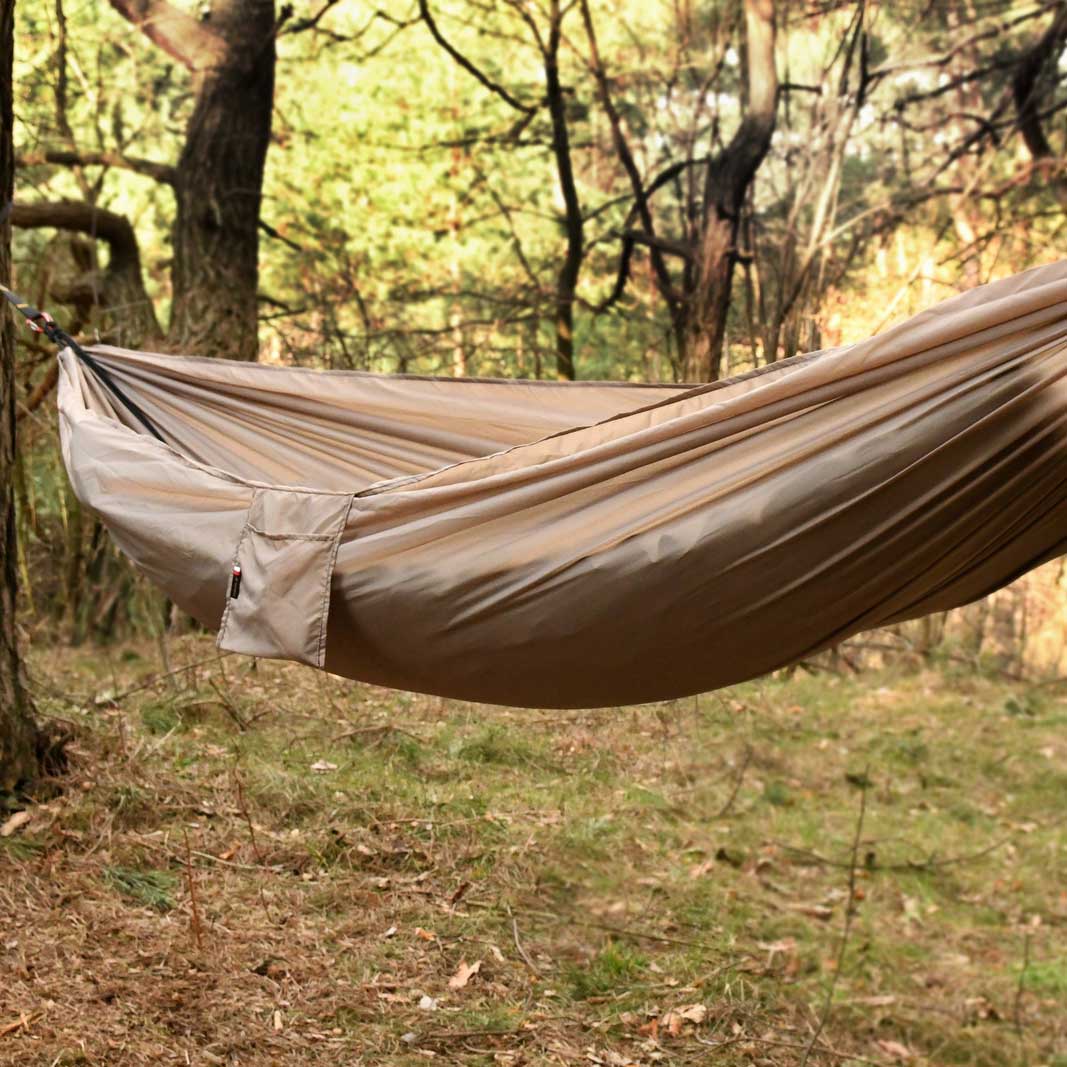 Hamak TigerWood Ważka V2 wykorzystuje wzmocnioną siatką ripstop tkaninę nylonową, gwarantującą te same korzyści wsparte zwiększoną odpornością na uszkodzenia. Materiał charakteryzuje się wysoką odpornością na rozciąganie, dzięki czemu bez problemu utrzyma ciężar do 275 kg. Charakteryzuje się przy tym niską masą oraz dobrą oddychalnością, dzięki czemu będzie komfortowy zarówno w transporcie jak i podczas użytkowania. Umieszczona na boku hamaka kieszonka umożliwi natomiast przechowanie pod ręką kluczowych akcesoriów.
