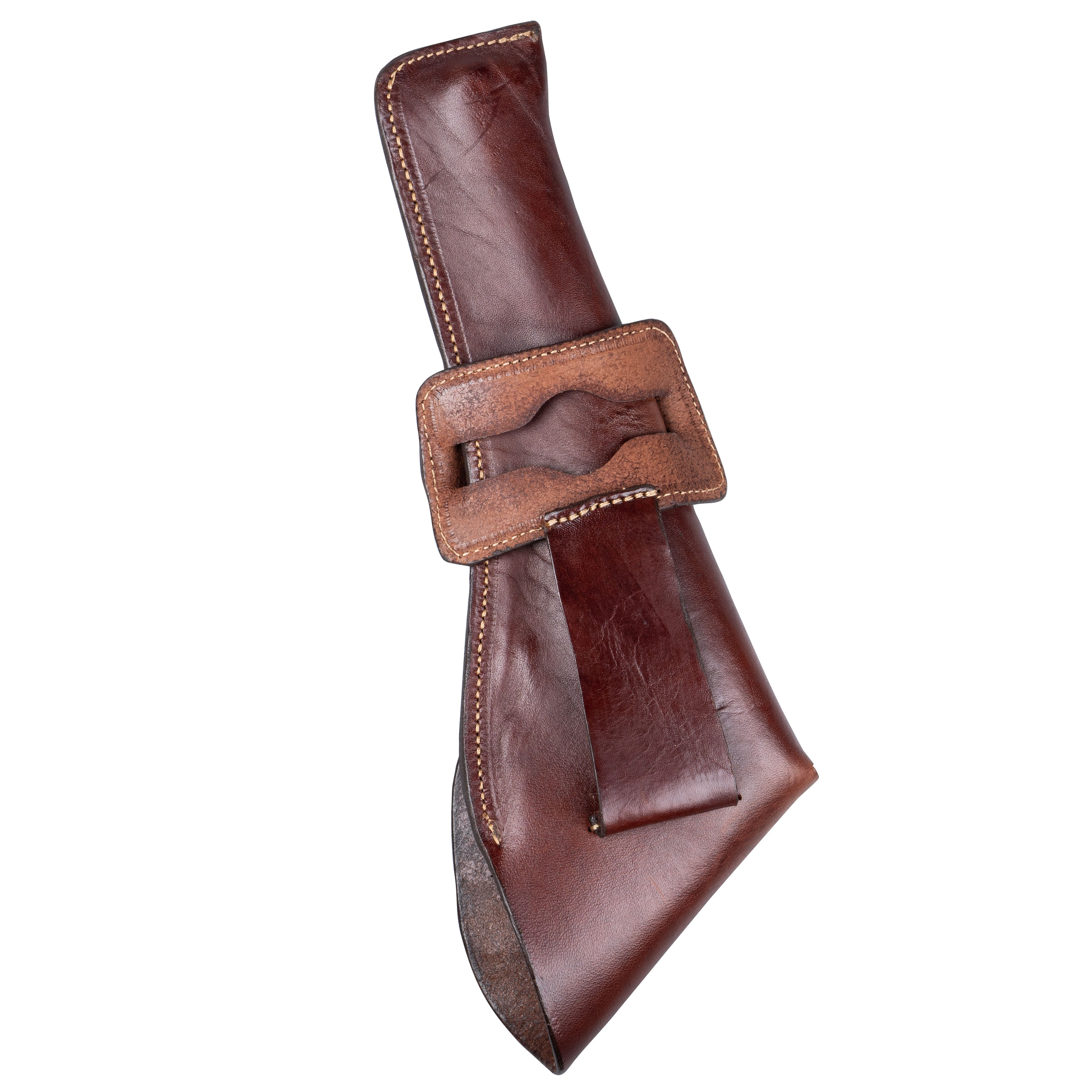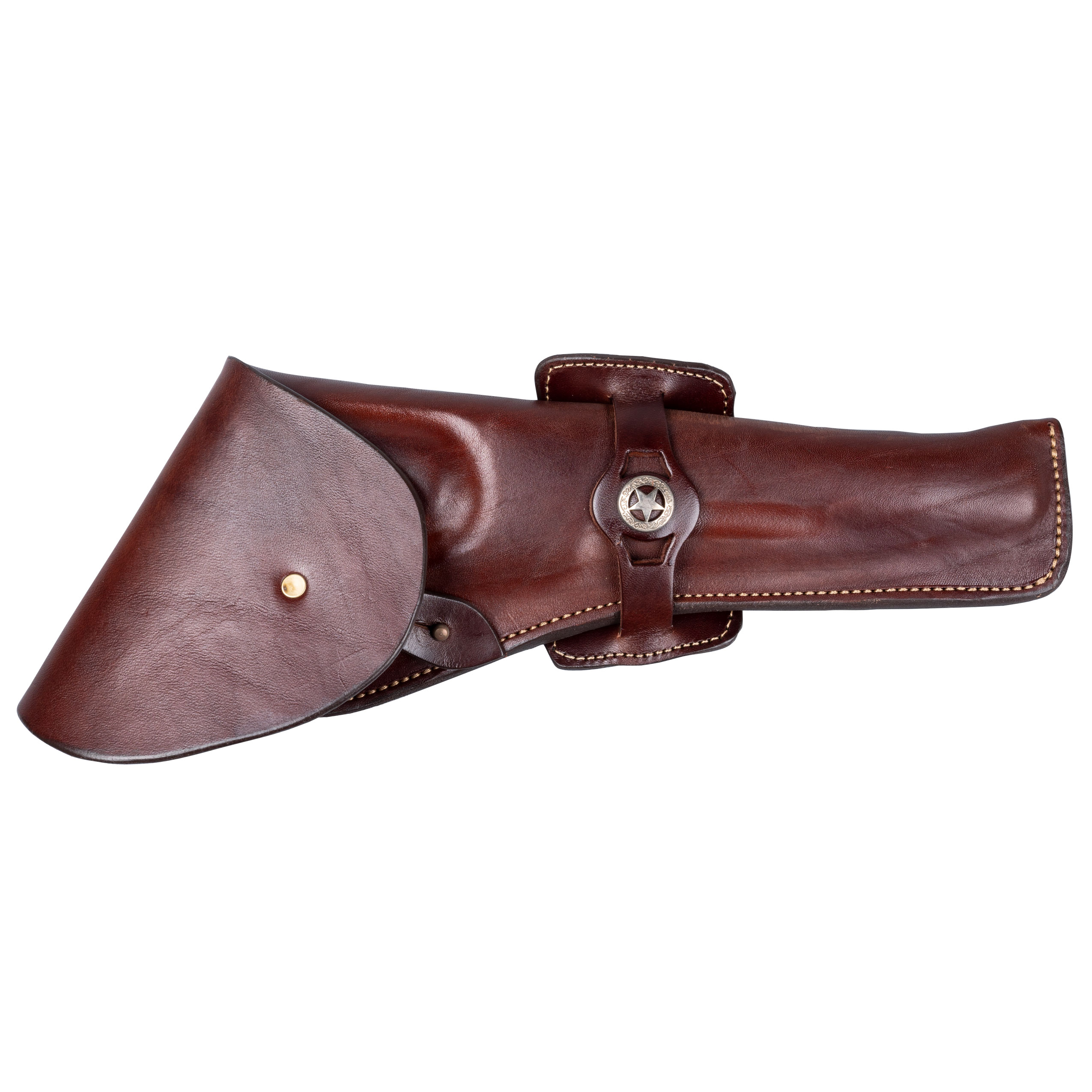 Kabura do rewolweru czarnoprochowego 8" w wojskowym stylu z klapką zamykaną na mosiężny knopik oraz szeroką szlufką na pas. Kaburę uszyto ręcznie z tłoczonej skóry bydlęcej o grubości 4 mm poddanej procesowi garbowania roślinnego. W tej westernowej kaburze możemy przenosić rewolwer Remington z lufą o długości 8". Kabury wytwarzane są z kruponu — najmocniejszej i jednocześnie najdroższej części skóry. Krupon to zaledwie 45% powierzchni całej skóry wołu, znajdująca się wzdłuż pleców po obu stronach kręgosłupa. W odróżnieniu od mniej wytrzymałej skóry na bokach skóra na karku jest rozciągliwa i pokryta jarzmami (pręgami). Dzięki procesowi roślinnego garbowania skóra ma intensywną głębię koloru oraz fakturę przyjemną w dotyku.