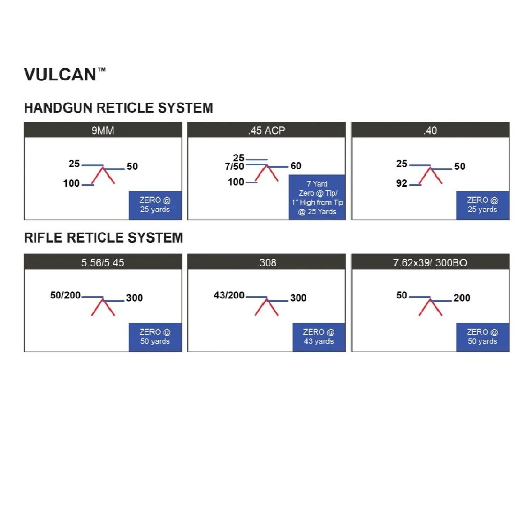 ACSS Vulcan rewolucjonizuje system celowania z wykorzystaniem kolimatora. Zamiast standardowej czerwonej kropki zastosowano znak w postaci szewronu (odwróconej litery V), który pozwala na szybkie wejście w cel oraz precyzyjne strzelanie na większym dystansie. Znak celowniczy wspierany jest przez duży okrąg (z opcją wyłączenia), który pomaga w szybkim ustawieniu szewronu idealnie na środku celu. Jeśli zgubimy punkt celowania, na brzegach soczewki widzimy zarys okręgu, który pomaga w instynktownym naniesieniu korekt i powrocie na obrany cel. Kolimator z siatką ACSS Vulcan zapewnia zauważalną przewagę nad mechanicznymi przyrządami celowniczymi podczas szybkiego strzelania do dalekich celów.