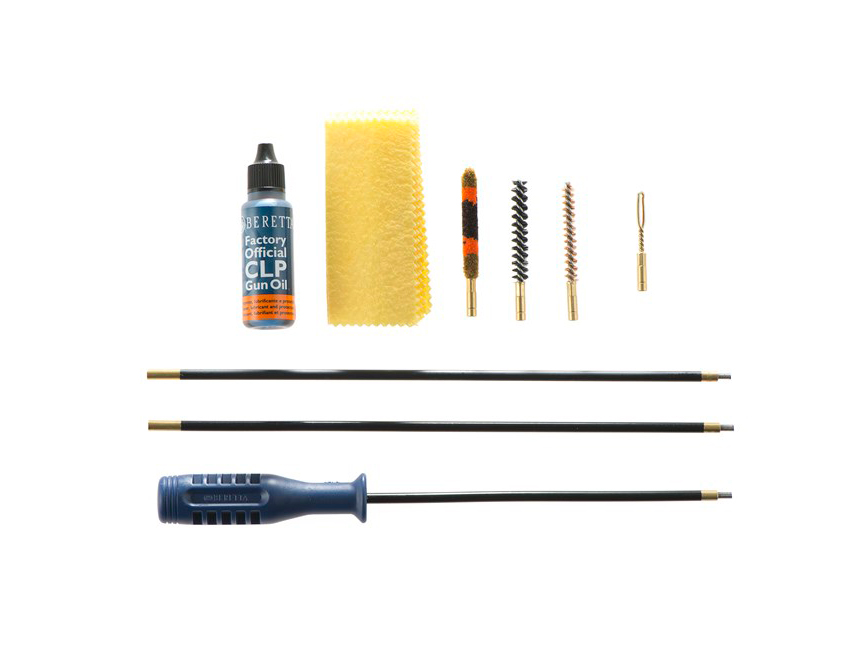 Elementy zestawu do konserwacji broni: trzyczęściowy aluminiowy wycior, bawełnianie czyściowo, końcówka z oczkiem na czyściwo, szczotka metalowa, plastikowe pudełko do przenoszenia, olej CLP Beretta do czyszczenia i konserwacji 25 ml, szczotka bawełniana, szczotka nylonowa