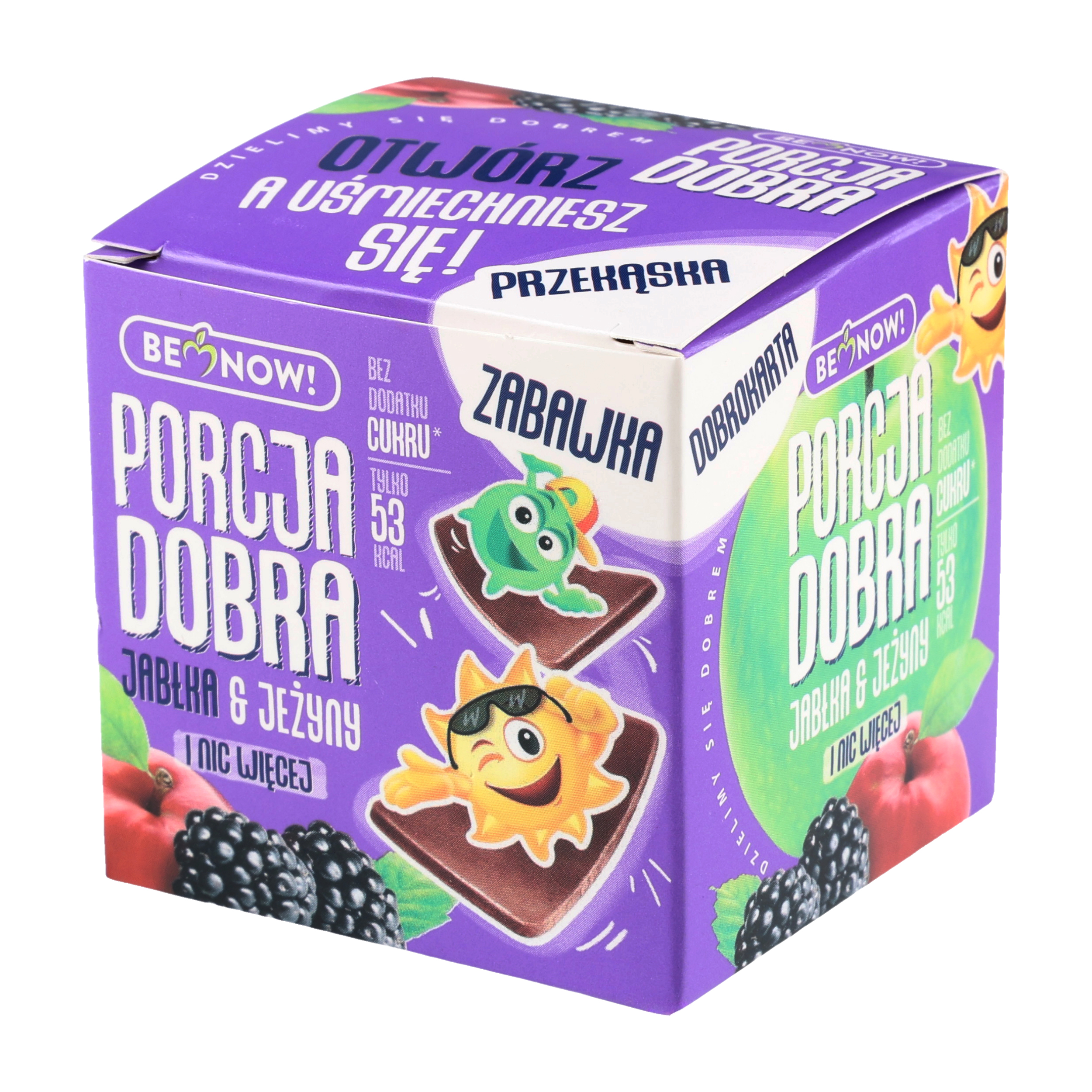 Kostka z niespodzianką od firmy Porcja Dnia jest najlepszą odpowiedzią na potrzeby dziecka. Łączy w sobie zdrową przekąską oraz zabawę w postaci dobrokarty. Smak jabłkowo-jeżynowy.