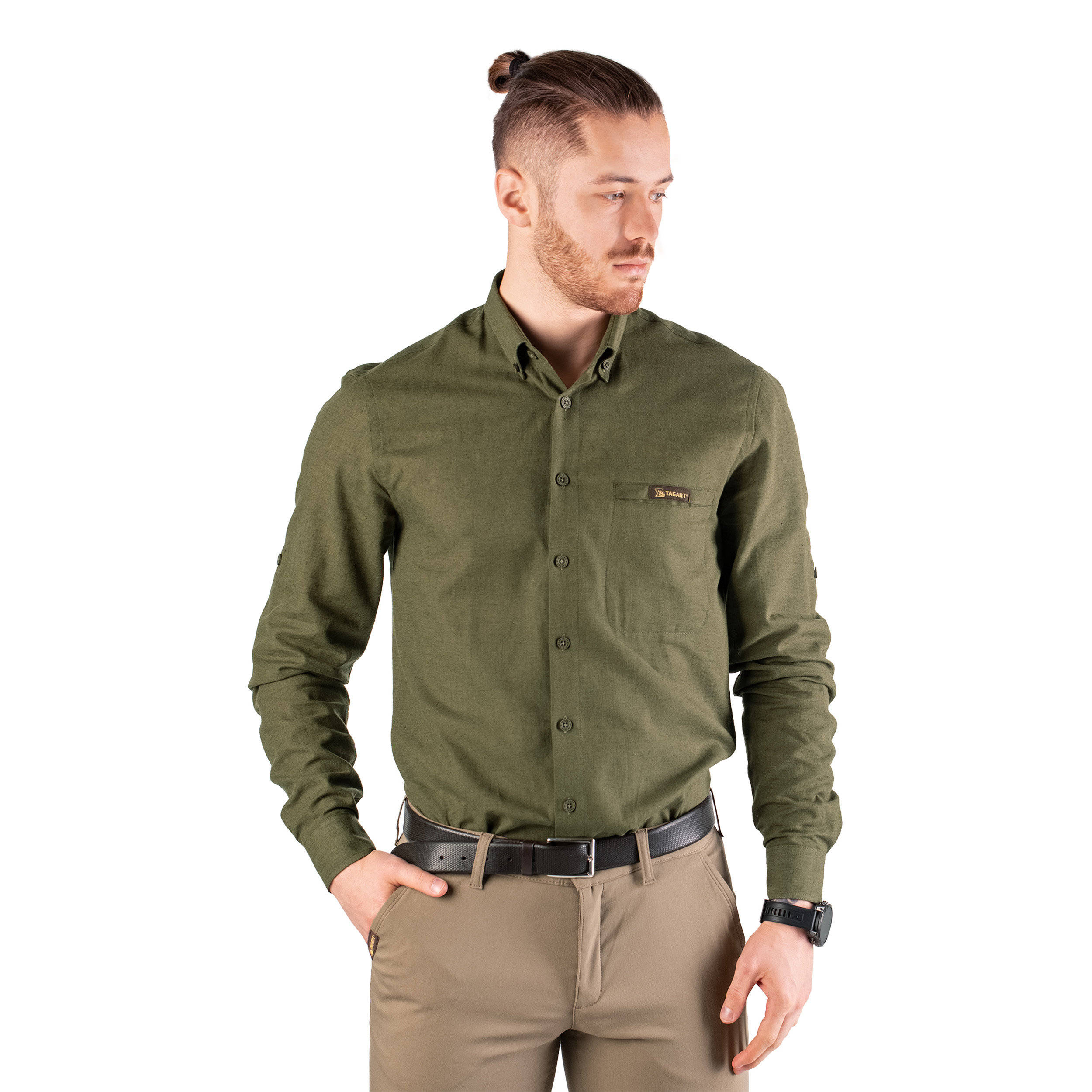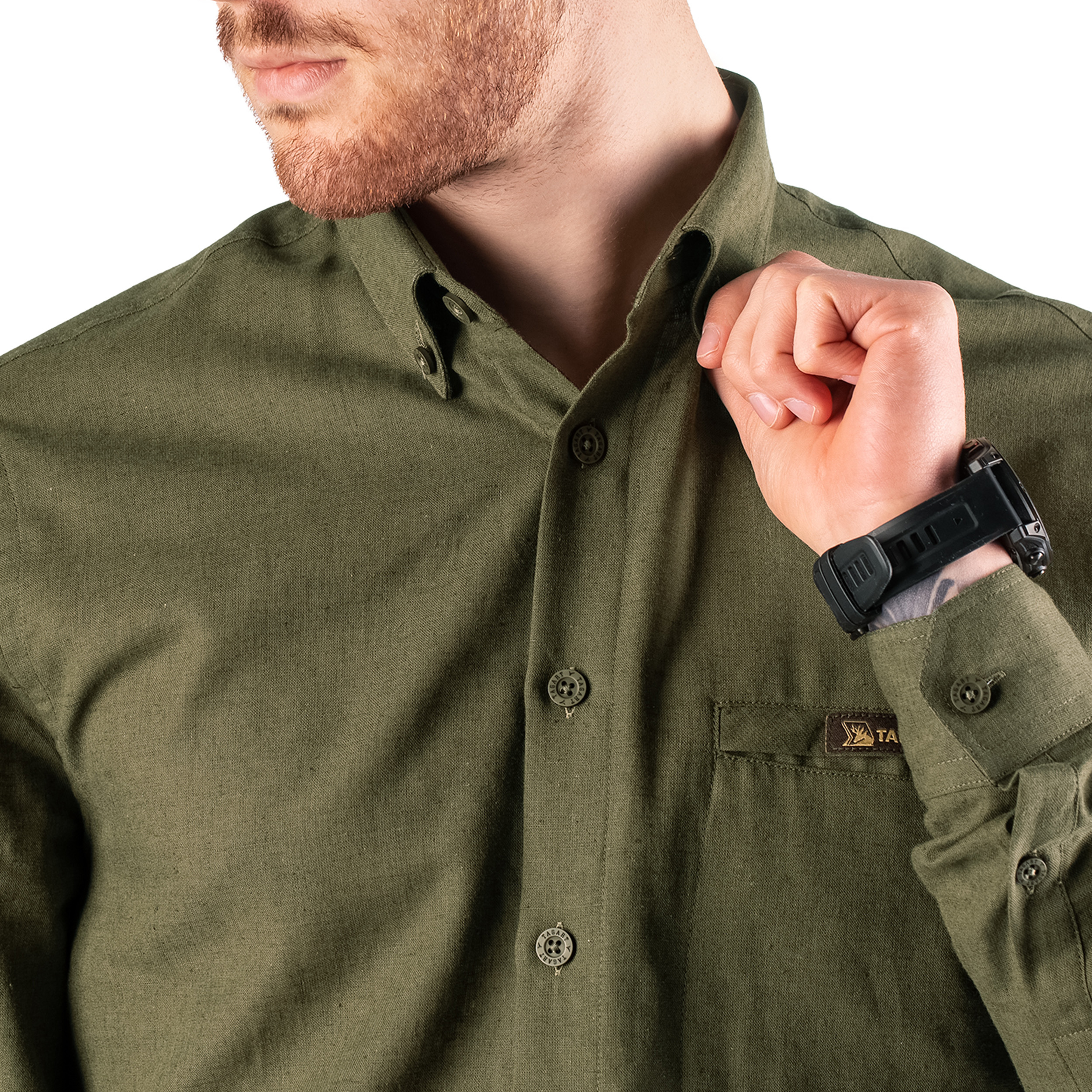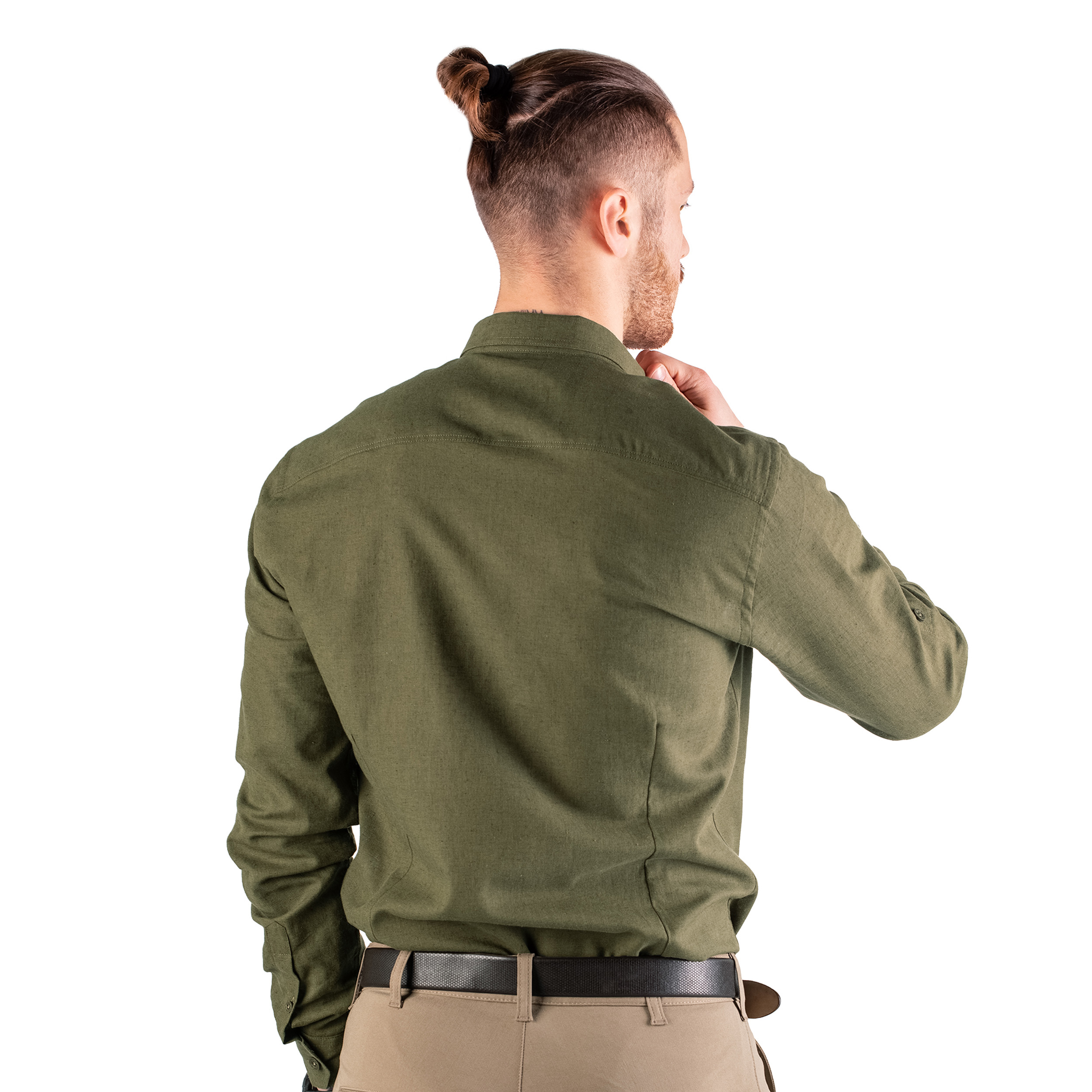 Uszyta z 30% lnu i 70% wysokiej jakości bawełny, łączy w sobie atrakcyjny wygląd z funkcjonalnością i komfortem noszenia. Lniana część materiału nadaje koszuli unikalną, naturalną teksturę. Len jest przyjazny dla skóry i zapewnia cyrkulację powietrza – niezbędną podczas aktywności fizycznej. Koszula charakteryzuje się też doskonałą zdolnością odprowadzania wilgoci, a występująca w składzie bawełna gwarantuje miękkość i przyjemność noszenia. Materiały te nie tylko oferują trwałość, ale także odporność na zużycie, co jest niezbędne podczas aktywności w plenerze.