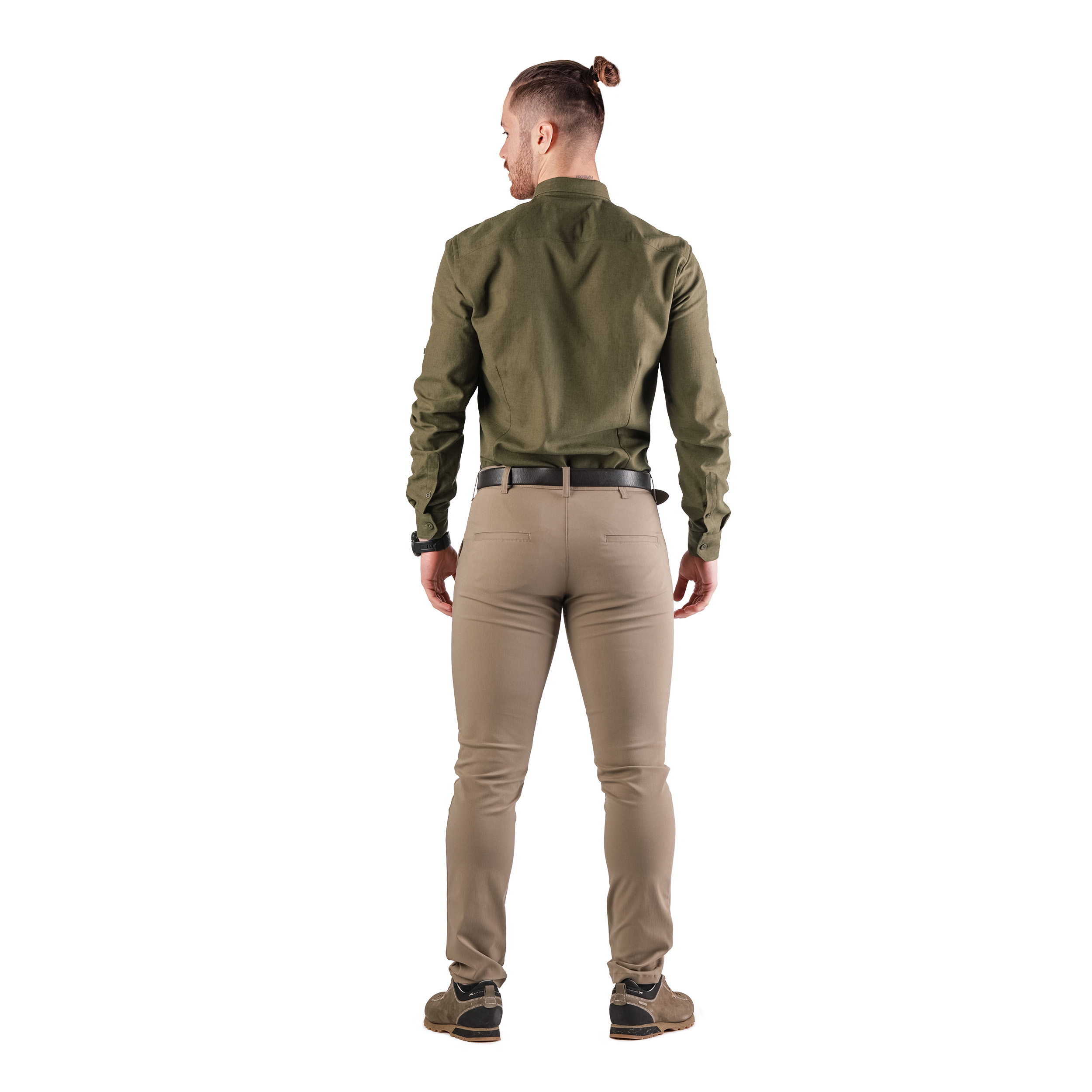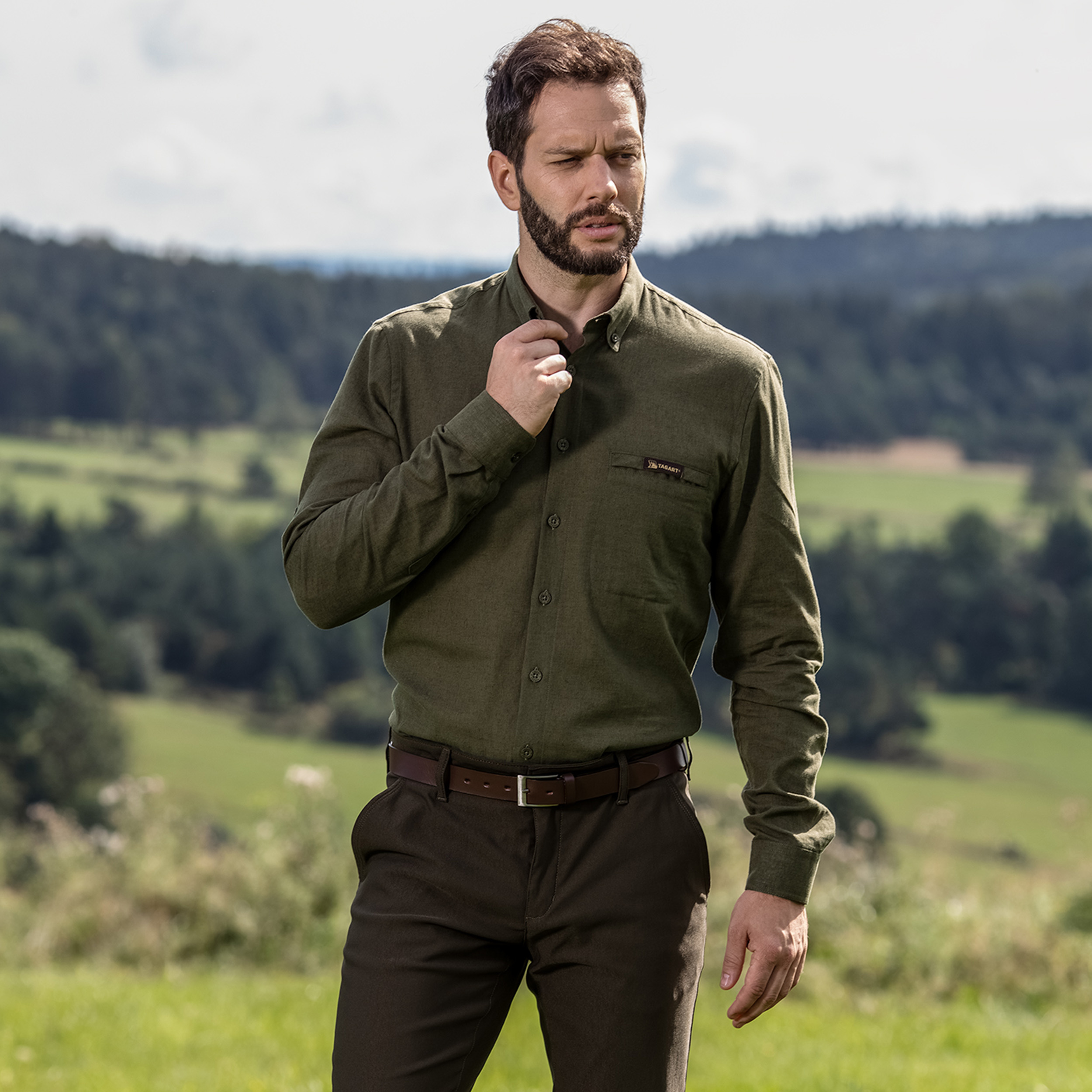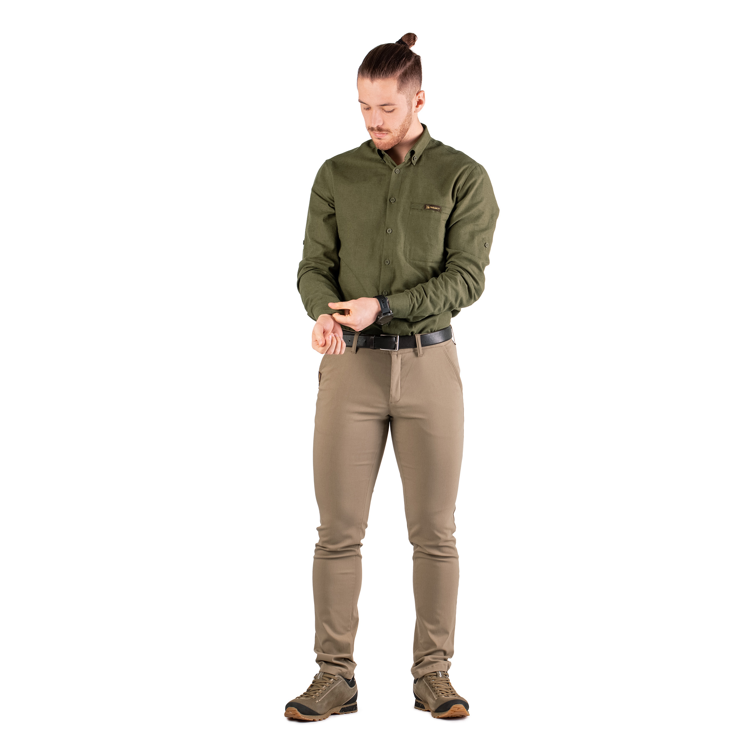 Uszyta z 30% lnu i 70% wysokiej jakości bawełny, łączy w sobie atrakcyjny wygląd z funkcjonalnością i komfortem noszenia. Lniana część materiału nadaje koszuli unikalną, naturalną teksturę. Len jest przyjazny dla skóry i zapewnia cyrkulację powietrza – niezbędną podczas aktywności fizycznej. Koszula charakteryzuje się też doskonałą zdolnością odprowadzania wilgoci, a występująca w składzie bawełna gwarantuje miękkość i przyjemność noszenia. Materiały te nie tylko oferują trwałość, ale także odporność na zużycie, co jest niezbędne podczas aktywności w plenerze.