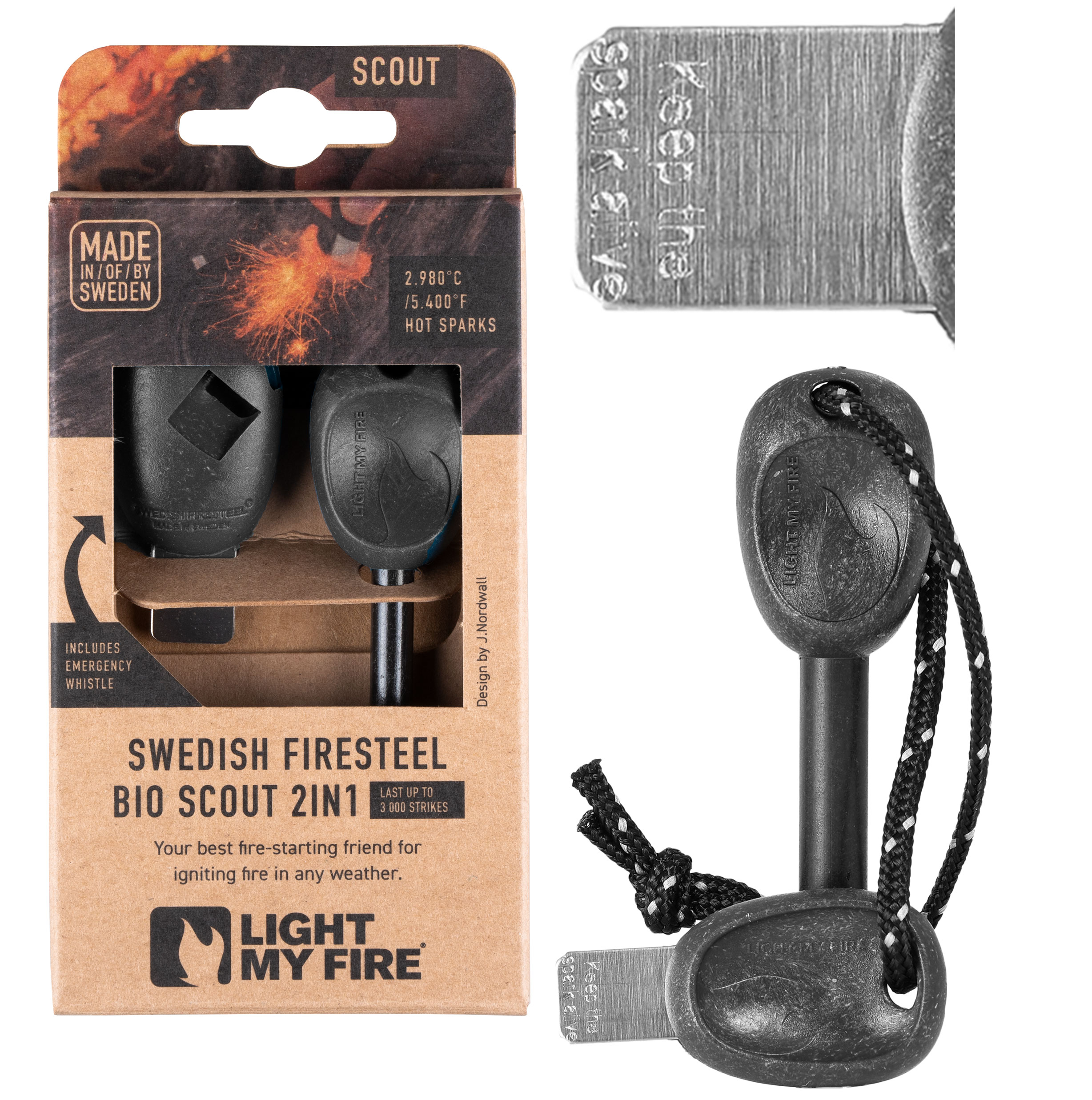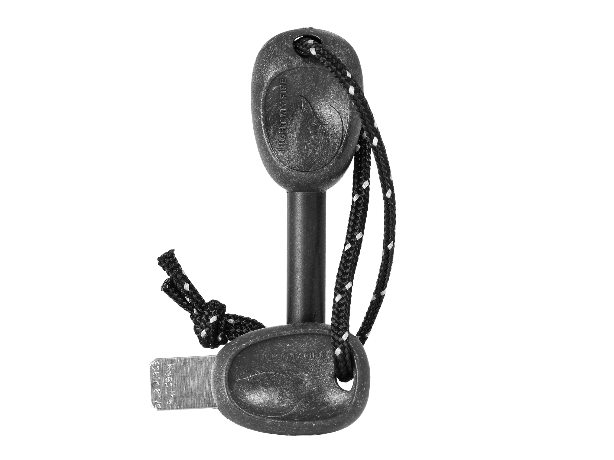 Do krzesania iskier służy udoskonalona stalowa draska, której chwyt wyposażony jest w zintegrowany gwizdek ratunkowy. W zależności od umiejętności użytkownika oraz intensywności użytkowania, producent określa żywotność krzesiwa aż do 12 000 krzesań.