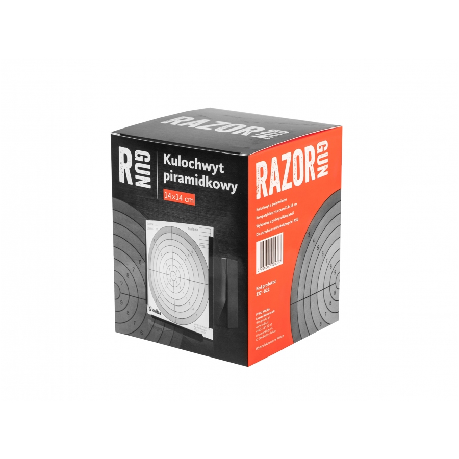 Kulochwyt piramidkowy RazorGun piramidkowy 14×14 jest przeznaczony do standardowych tarcz strzeleckich o wymiarach 14x14 cm. Zwiększ bezpieczeństwo podczas weekendowego strzelanie z przyjaciółmi i rodziną. Ścianki kulochwytu zostały ustawione pod kątem co skutecznie eliminuje ryzyko wystąpienia rykoszetu w kierunku strzelca lub osób towarzyszących. Kulochwyt został wykonany z wytrzymałej stali zabezpieczonej odpornym, czarnym lakierem.