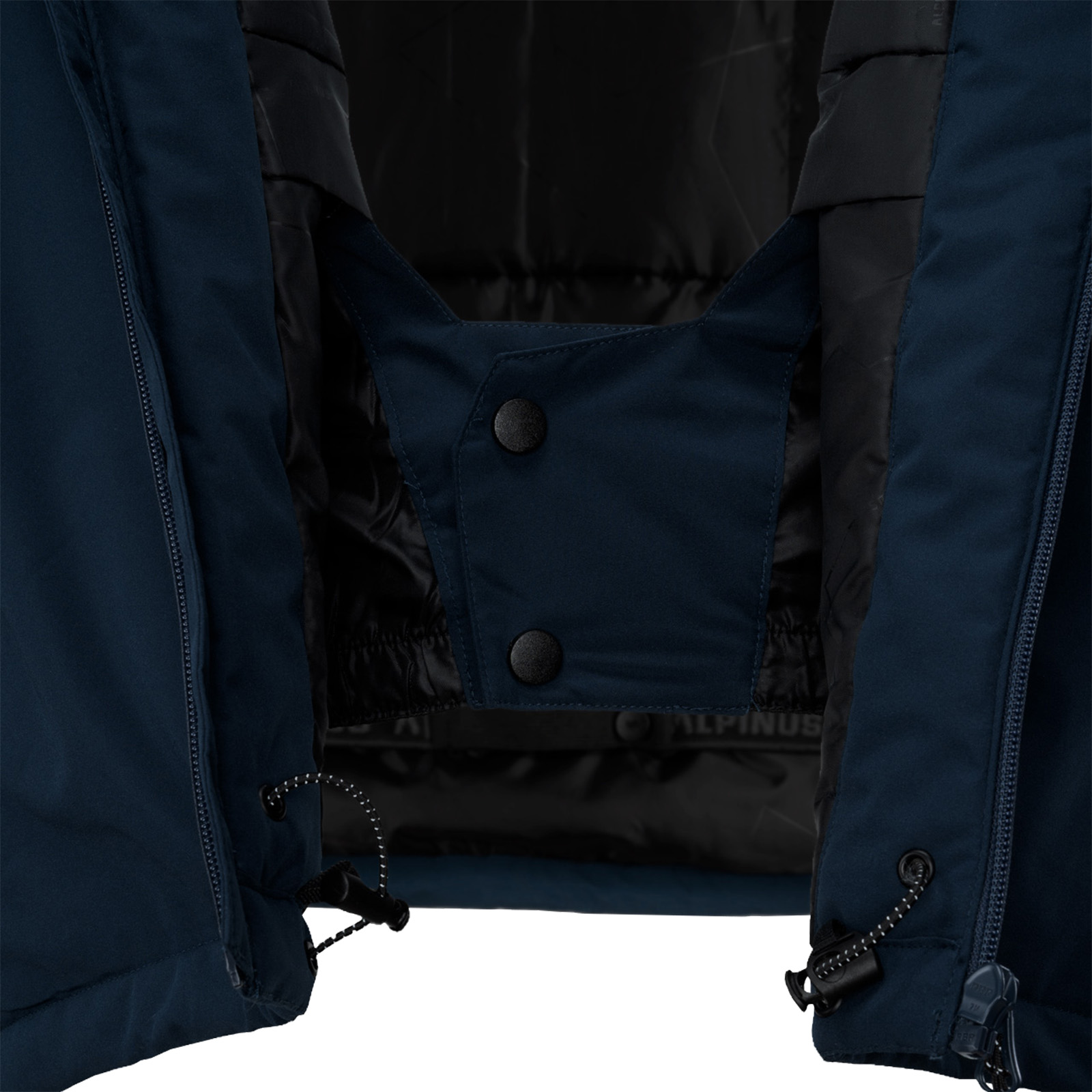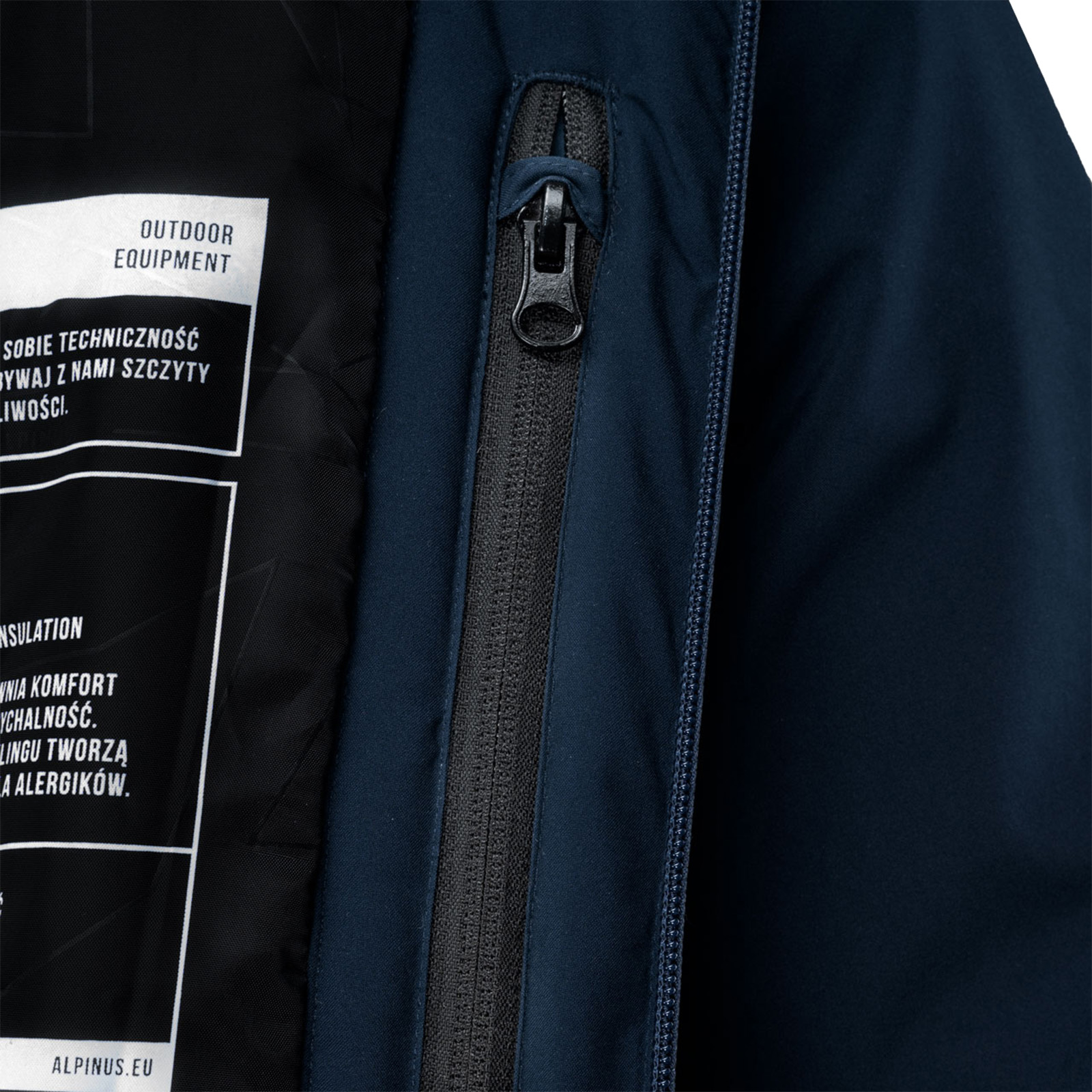 Regulowany kaptur z wysokim kołnierzem chroni głowę przed niekorzystnymi warunkami atmosferycznymi, a ocieplany mikropolarem kołnierz zapewnia dodatkową ochronę przed zimnym powietrzem. Rękawy wyposażone są w elastyczną wstawkę, która chroni dłonie przed niskimi temperaturami. Mankiety kurtki można dodatkowo regulować za pomocą rzepów z logo Alpinus. Kurtka ma również praktyczną tasiemkę, ułatwiającą jej wygodne zawieszenie.