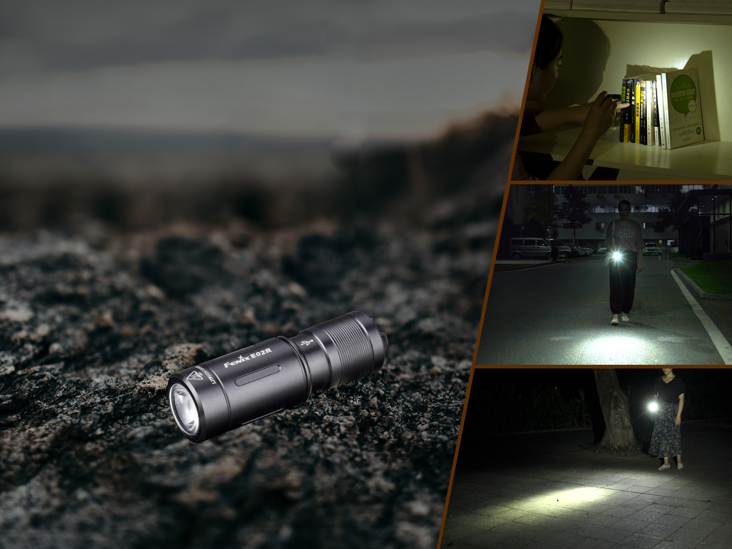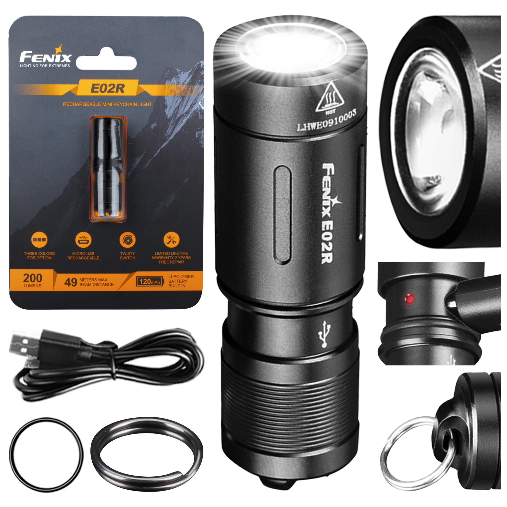 Fenix E02R to kieszonkowa latarka EDC w formie breloka, która emituje strumień 200 lumenów o zasięgu do 49 m, wyposażona w zintegrowany akumulator oraz port ładowania micro-USB.