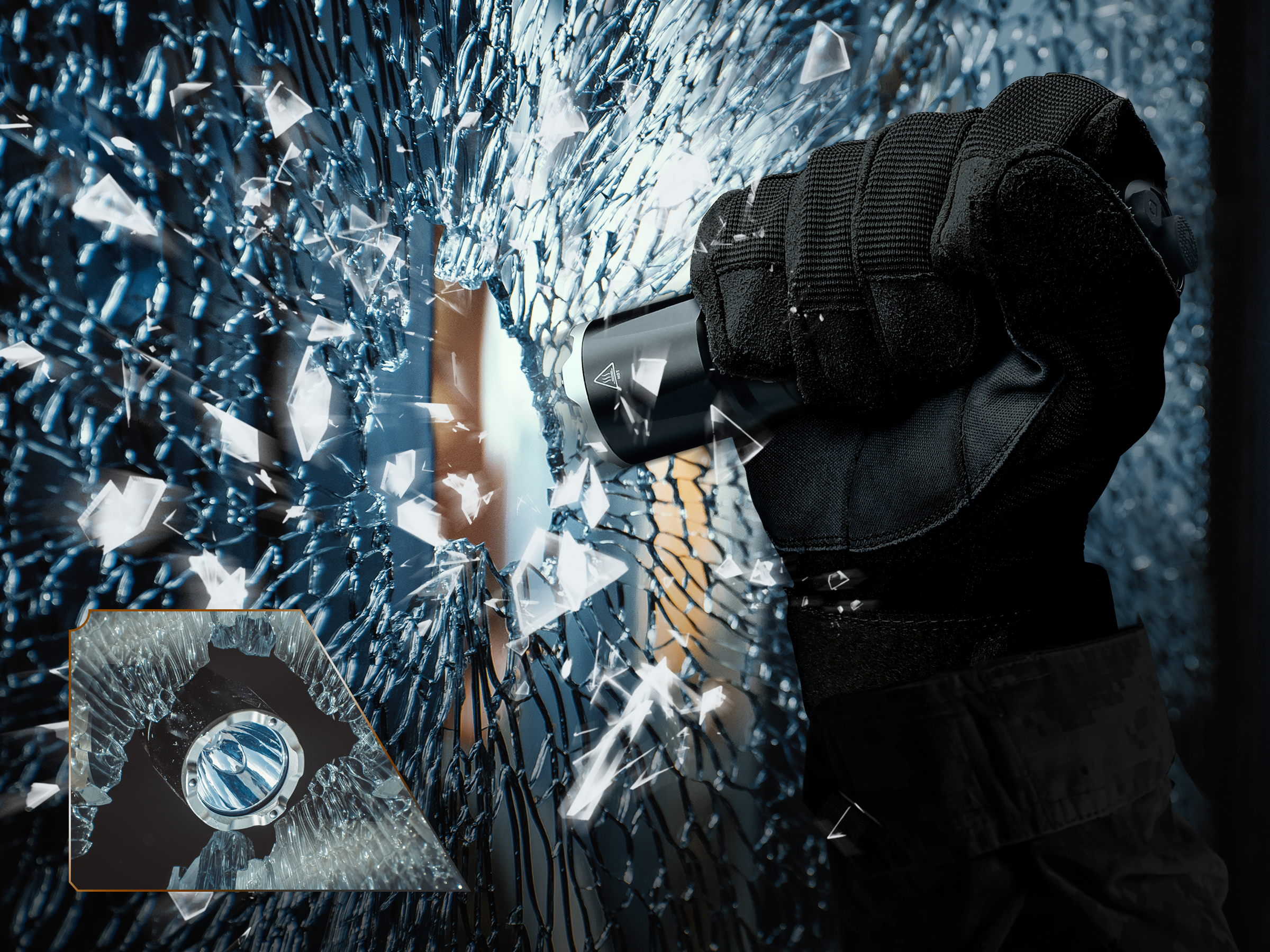 Układ optyczny zabezpiecza stalowa koronka (podwyższone elementy głowicy), chroniąca szkło w razie upadku lub ustawienia na nierównej powierzchni. Funkcjonalność tego elementu zwiększają 3 wolframowe trzpienie, dzięki którym latarka może być wykorzystywana do samoobrony lub narzędzie ratunkowe np. do wybicia szyby w pojeździe.