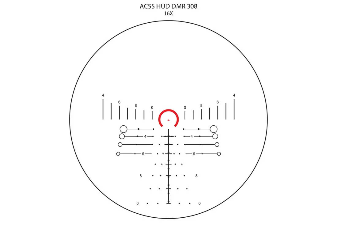 Luneta została wyposażona krzyż umieszczony w pierwszym planie optycznym, co jest optymalnym wyborem do przewidzianych dla niej zastosowań. Rozwiązanie tego typu zachowuje realne proporcje znaku celowniczego podczas zmiany powiększenia, dzięki czemu umożliwia wiarygodną ocenę odległości do celu. Ponadto w przypadku powiększeń z dołu zakresu krzyż pozostaje niewielki, nie rozpraszając nas ilością detali i pozwalając na szybkie przenoszenie pomiędzy celami. Omawiany model oferuje wyjątkowo rozbudowany krzyż ACSS HUD DMR, stworzony z myślą o zastosowaniach taktycznych. Siatka obejmuje centralny szewron otoczony kontrastową, czerwoną podkową znacząco usprawniającą szybkie namierzanie celu na bliskich dystansach oraz podziałkę do kompensacji opadu pocisku BDC. Ponadto znajdziemy tu również punkty pozwalające na wprowadzanie korekt kompensujących działanie wiatru, analogowy dalmierz, podziałkę wyskalowaną w miliradianach, oraz odnośniki pomagające podczas wodzenia za ruchomym celem.