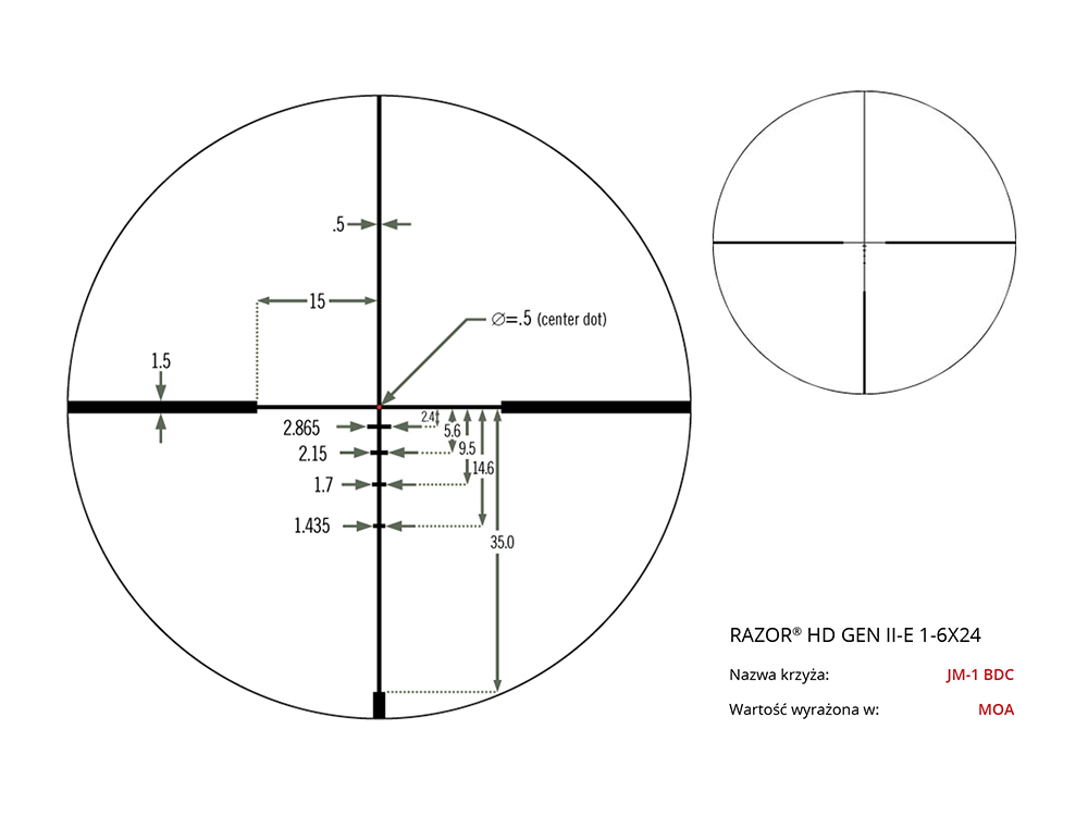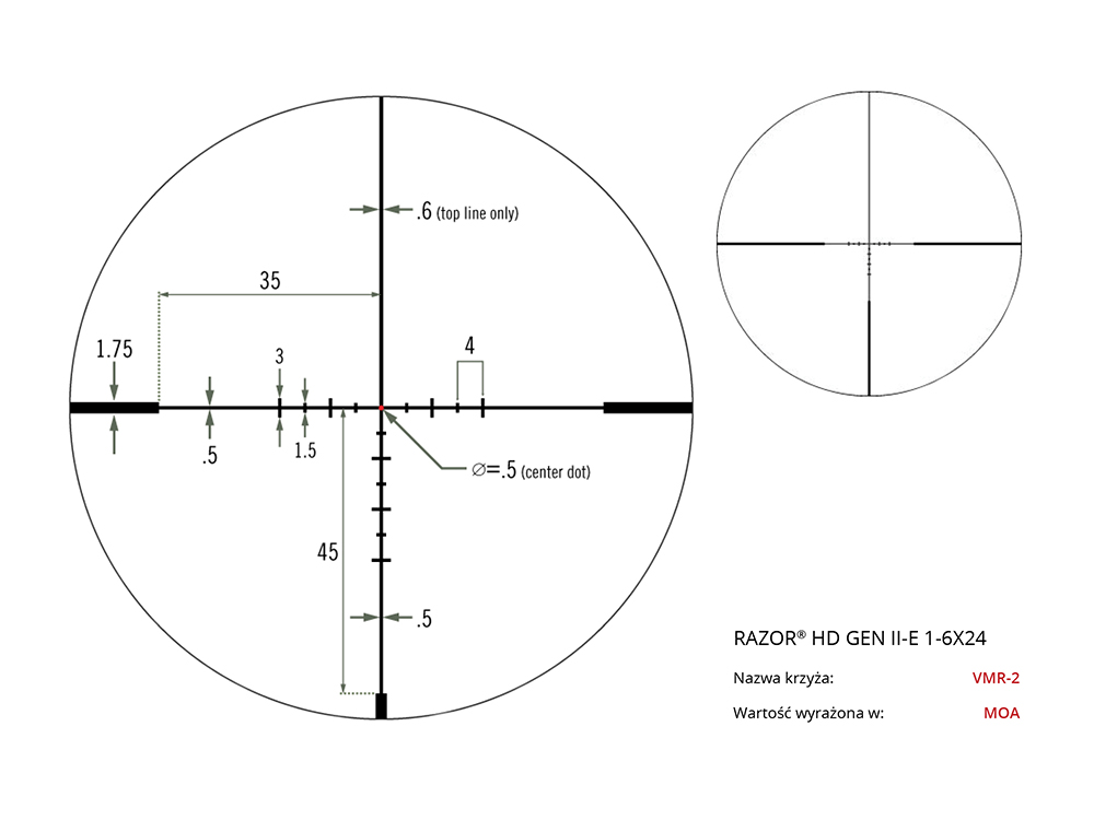 Typ krzyża celowniczego (siatki): VMR-2 MOA, VMR-2 MRAD, JM-1 MOA