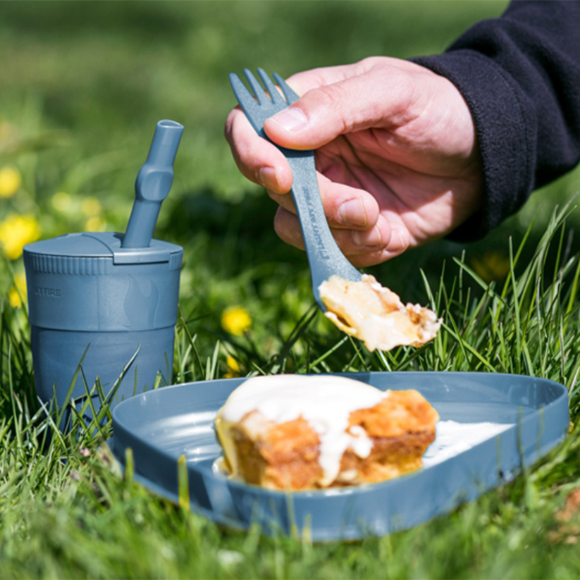 Łyżykowidelec wykonano z biodegradowalnego tworzywa sztucznego na bazie kukurydzy, wolnego od bisfenolu i odpornego na wysoką temperaturę oraz mycie w zmywarkach. Długość 17 cm pozwala także na wygodne spożywanie liofilizatu bezpośrednio z torebki.