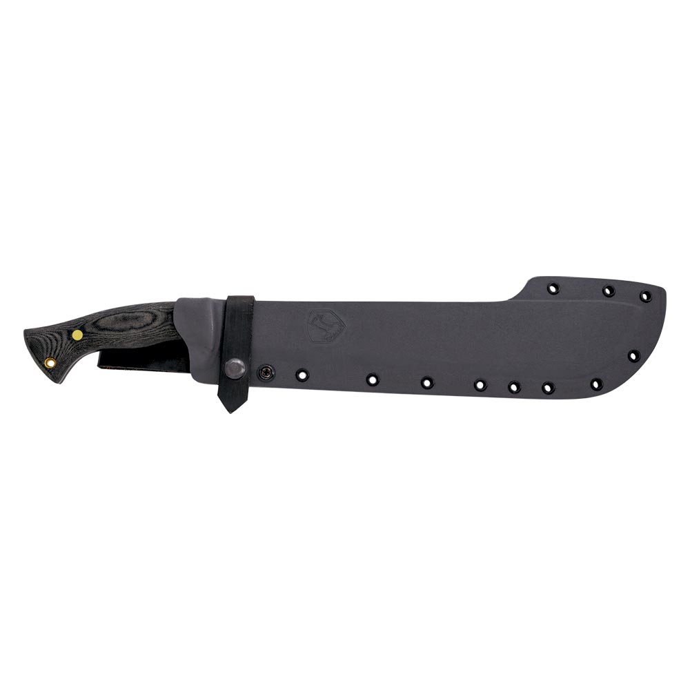 W komplecie z maczetą znajduje się pochwa z Kydexu, którą wyposażono w skórzaną szlufkę umożliwiającą przenoszenie maczety na pasie.