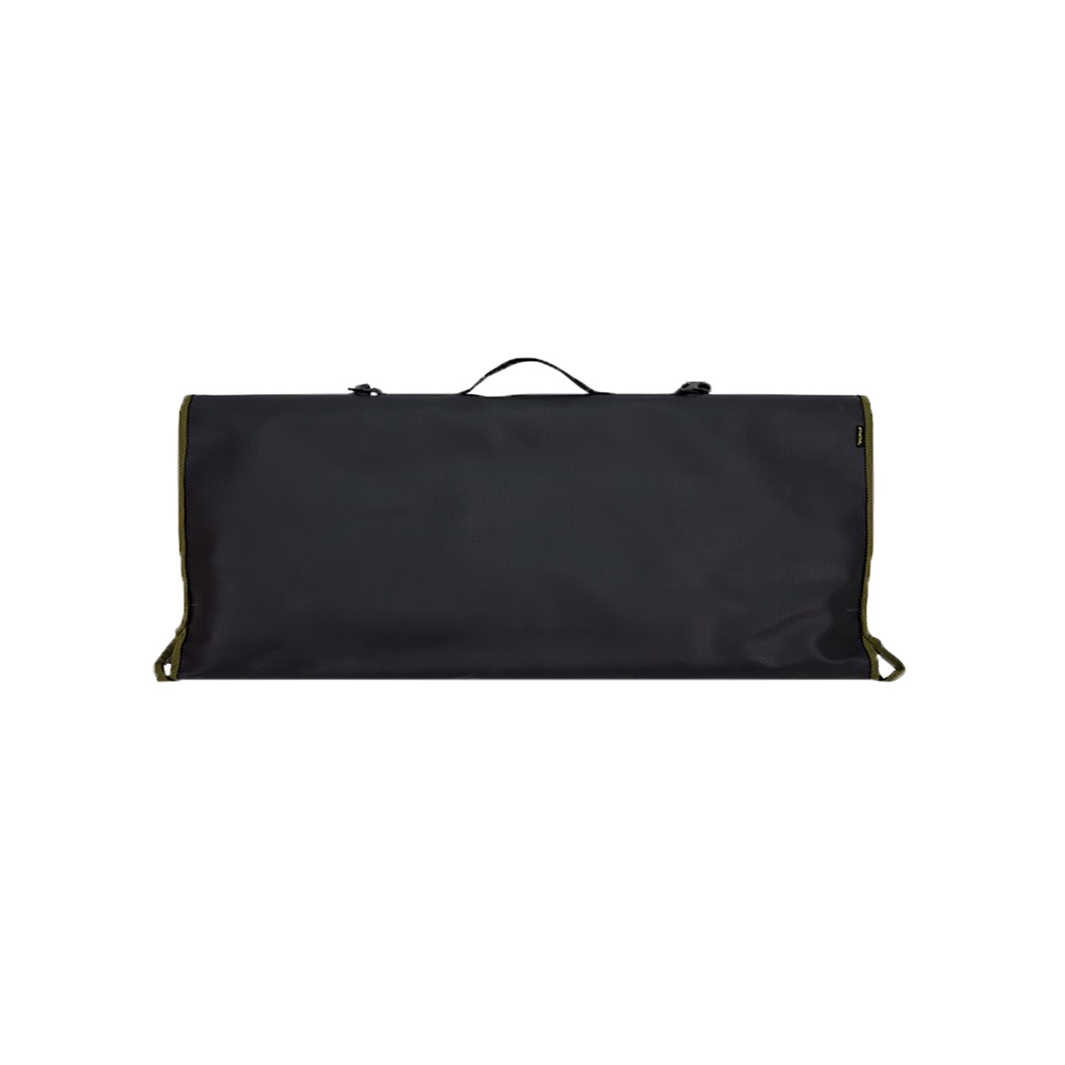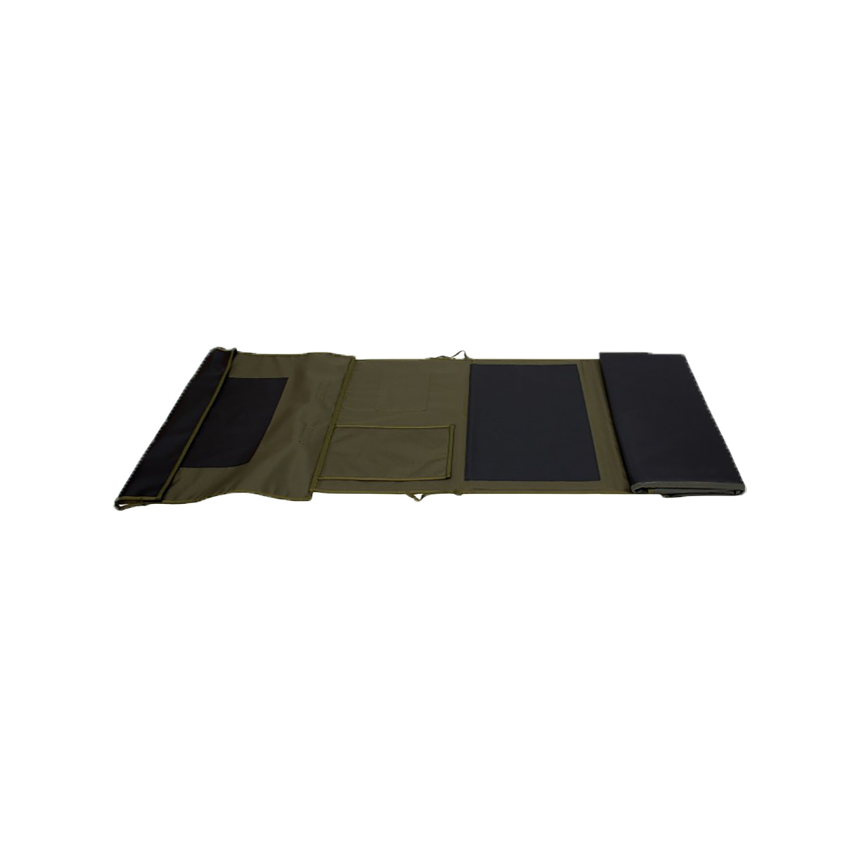 Matę strzelecką Tacti.pl wykonano z wytrzymałej cordury. Spodnią część uszyto z nieczepliwej tkaniny powlekanej. Dodatkowo na matę naszyto gumowaną tkaninę umożliwiającą stabilne ustawienie podstawy dla broni lub oparcie łokci. Po prawej stronie umieszczono zakrywane okienko o wymiarach kartki A4, umożliwiające sporządzanie notatek.