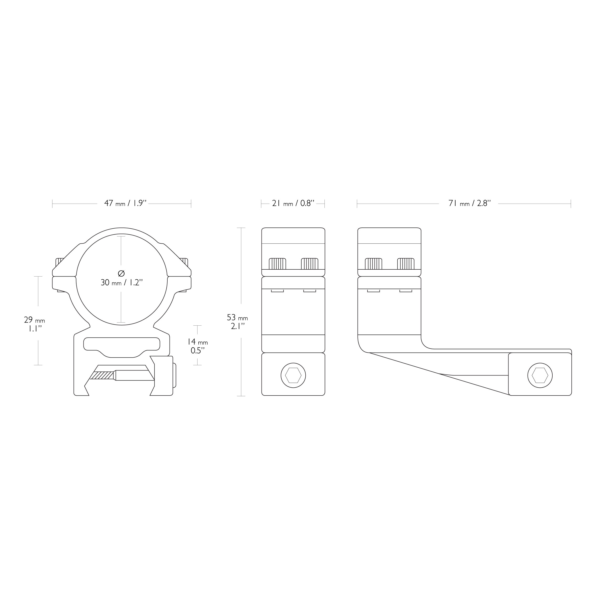 Dwuczęściowy, wysoki (14 mm) montaż lunety Hawke Match pozwoli zamocować lunetę o tubusie ze średnicą 30 mm na szynie Weaver. Montaż z przedłużeniem 50 mm.