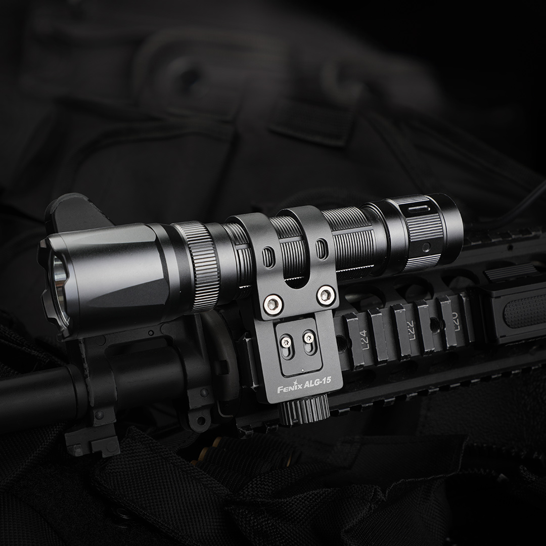 Montaż latarki Fenix ALG-15 zapewnia:Konstrukcja montażu została oparta na frezowanym aluminium pokrytym charakterystyczną dla marki Fenix wysokiej klasy anodowaniem. Gwarantuje nam to wysoką odporność na trudne czynniki, którym poddawany jest montaż - zarówno kwaśne środowisko wywoływane przez pozostałości prochu, jak i uszkodzenia mechaniczne. Sposób osadzenia latarki gwarantuje nam doskonałą stabilność montażu, a gumowe podstawki tłumią wibracje powstające przy strzale, pozytywnie rzutując na trwałość elektroniki. Instalacja na szynie Picatinny odbywa się z kolei na teksturowanym pokrętle, które w prosty, beznarzędziowy sposób pozwoli nam na szybki montaż i demontaż.