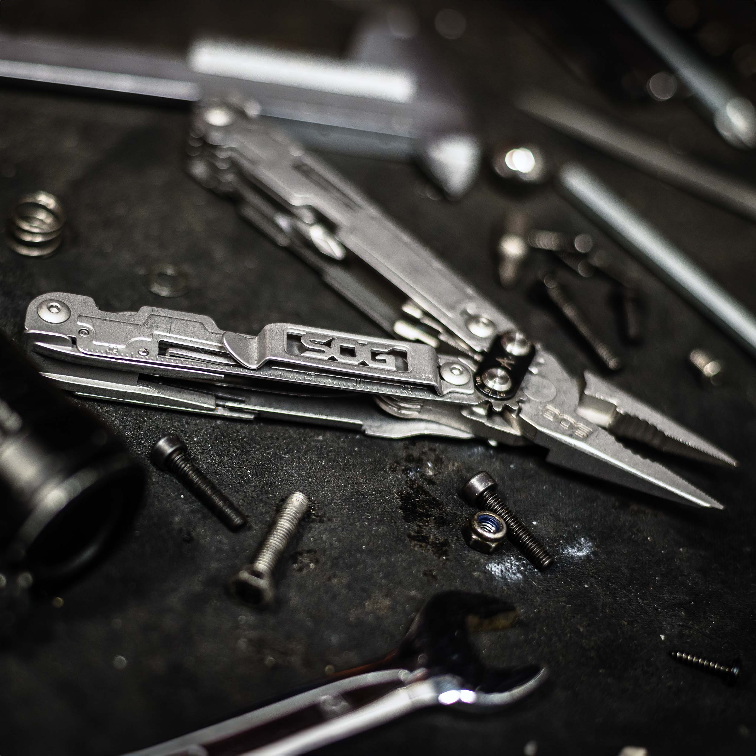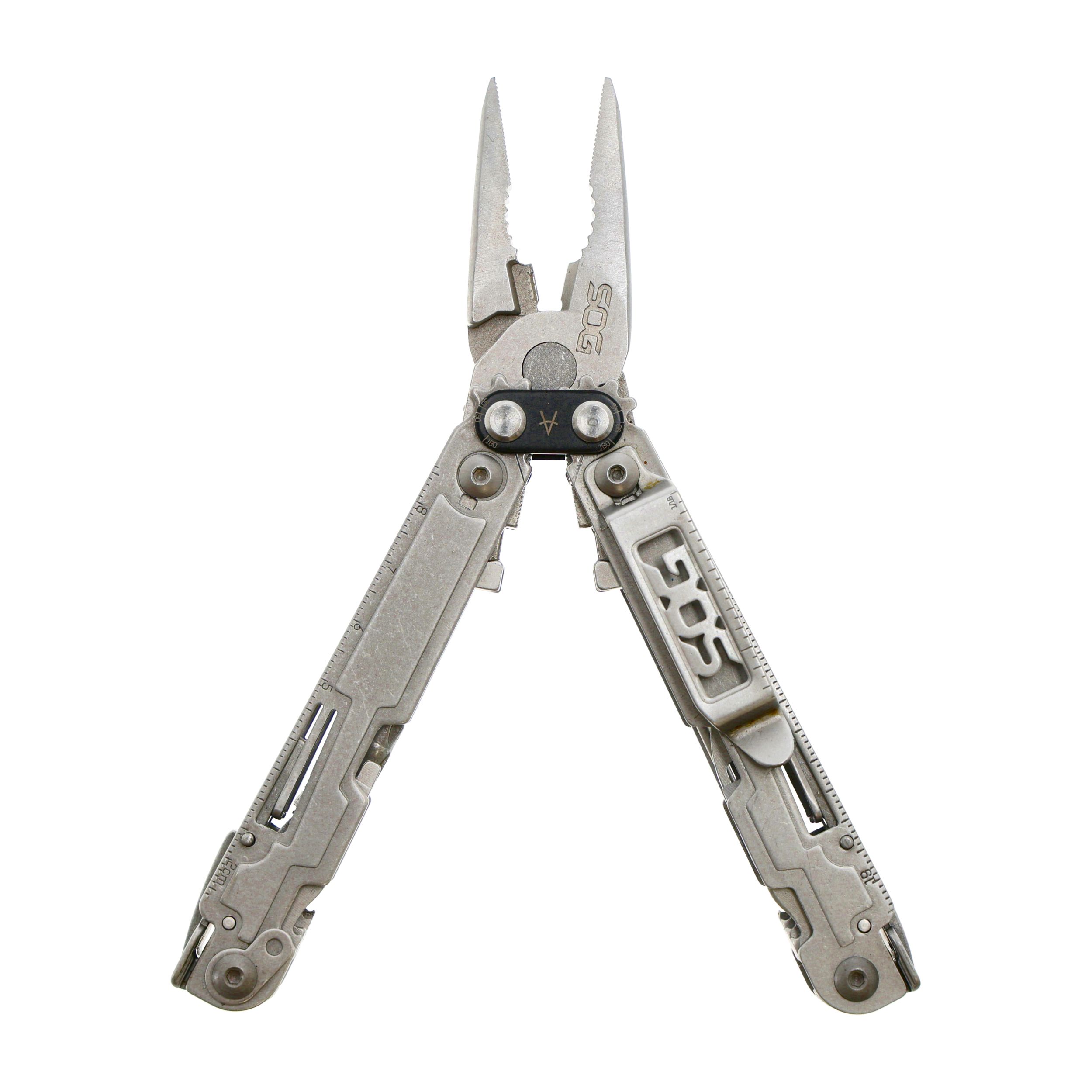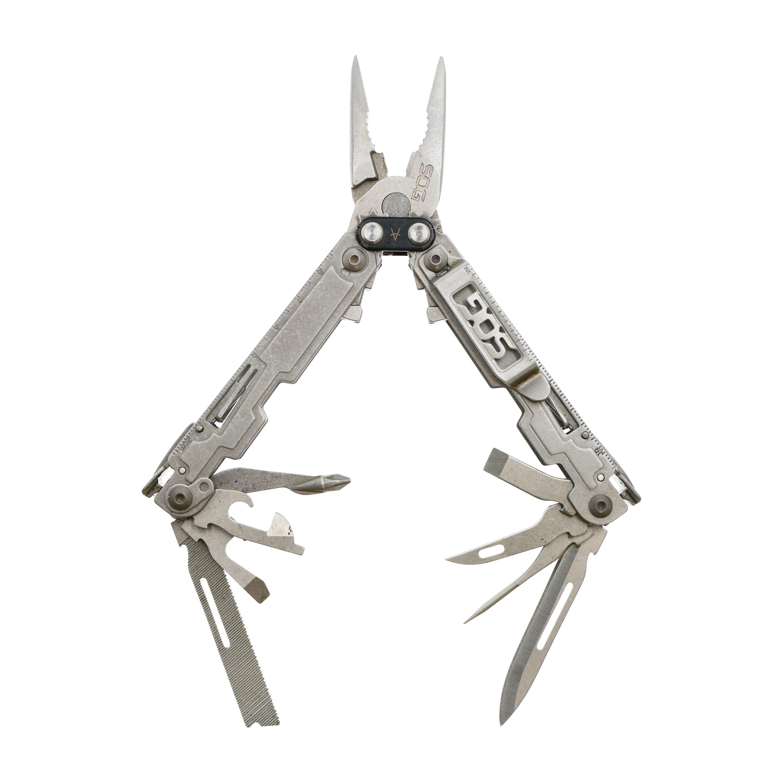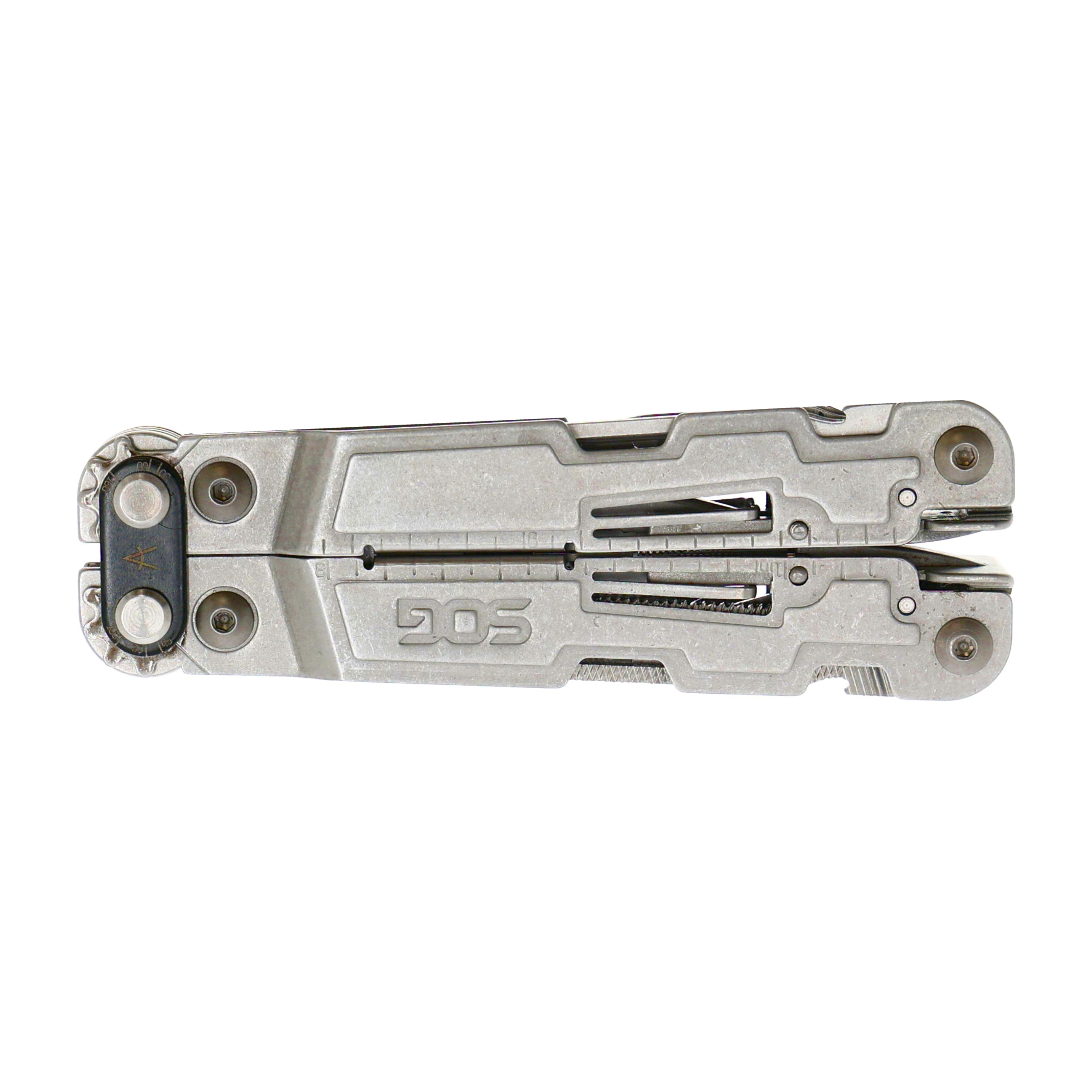 Wbudowane narzędzia: kątomierz, baza do bitów, kombinerki standardowe, linijka cm/in, mini śrubokręt, otwieracz do puszek, otwieracz do butelek, ostrze gładkie, pilnik, przebijak, przecinak do drutu, śrubokręt krzyżakowy, śrubokręt płaski szeroki, śrubokręt płaski wąski, zaci
