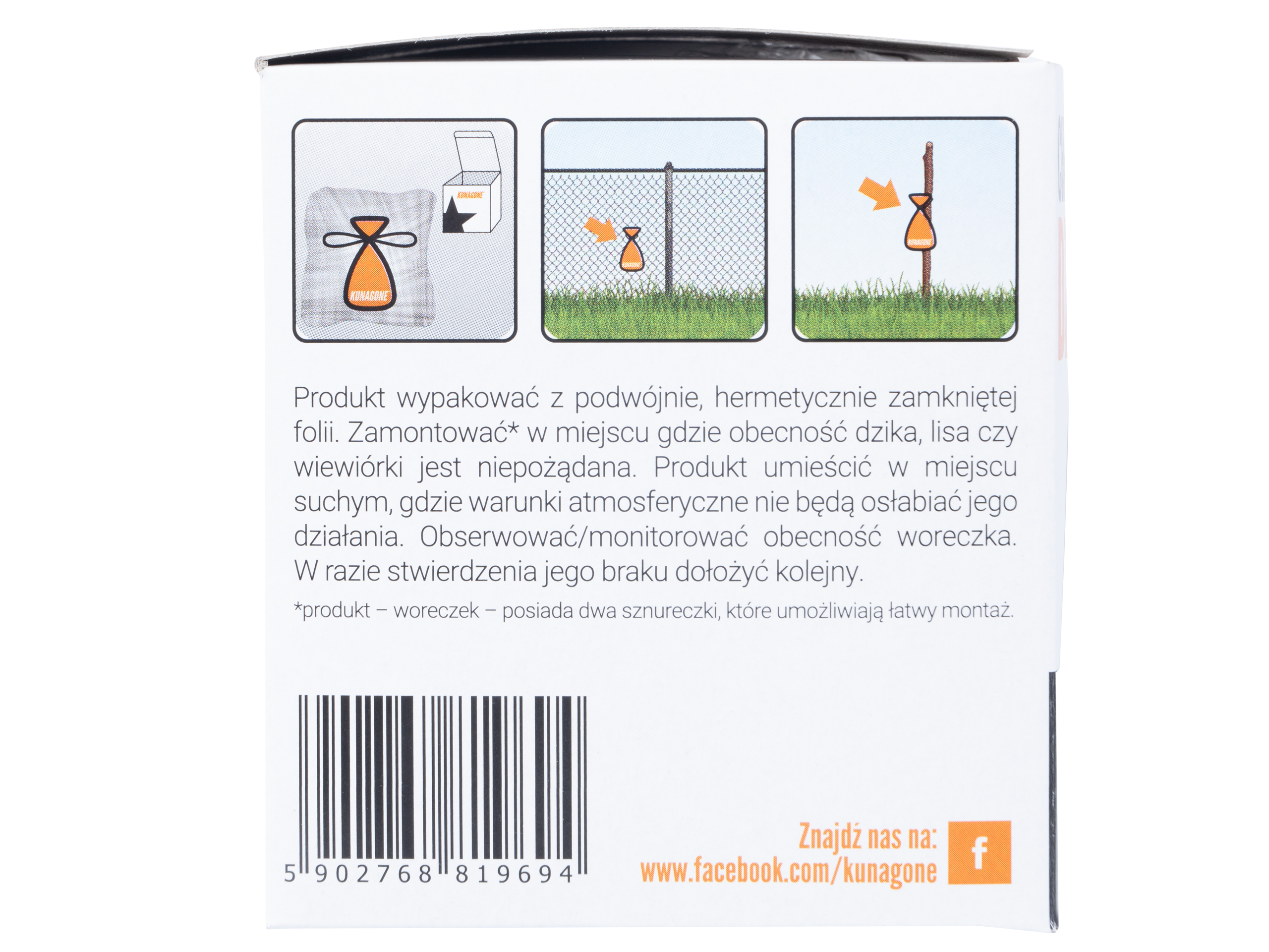 Kunagone nie wymaga zasilania i stosowania żadnych narzędzi, wystarczy umieścić środek na obszarze potencjalnej aktywności zwierząt najlepiej w miejscu, które nie jest narażone na działanie deszczu i wilgoci. Odstraszacz można mocować na ogrodzeniu, tyczkach lub zadaszeniach.