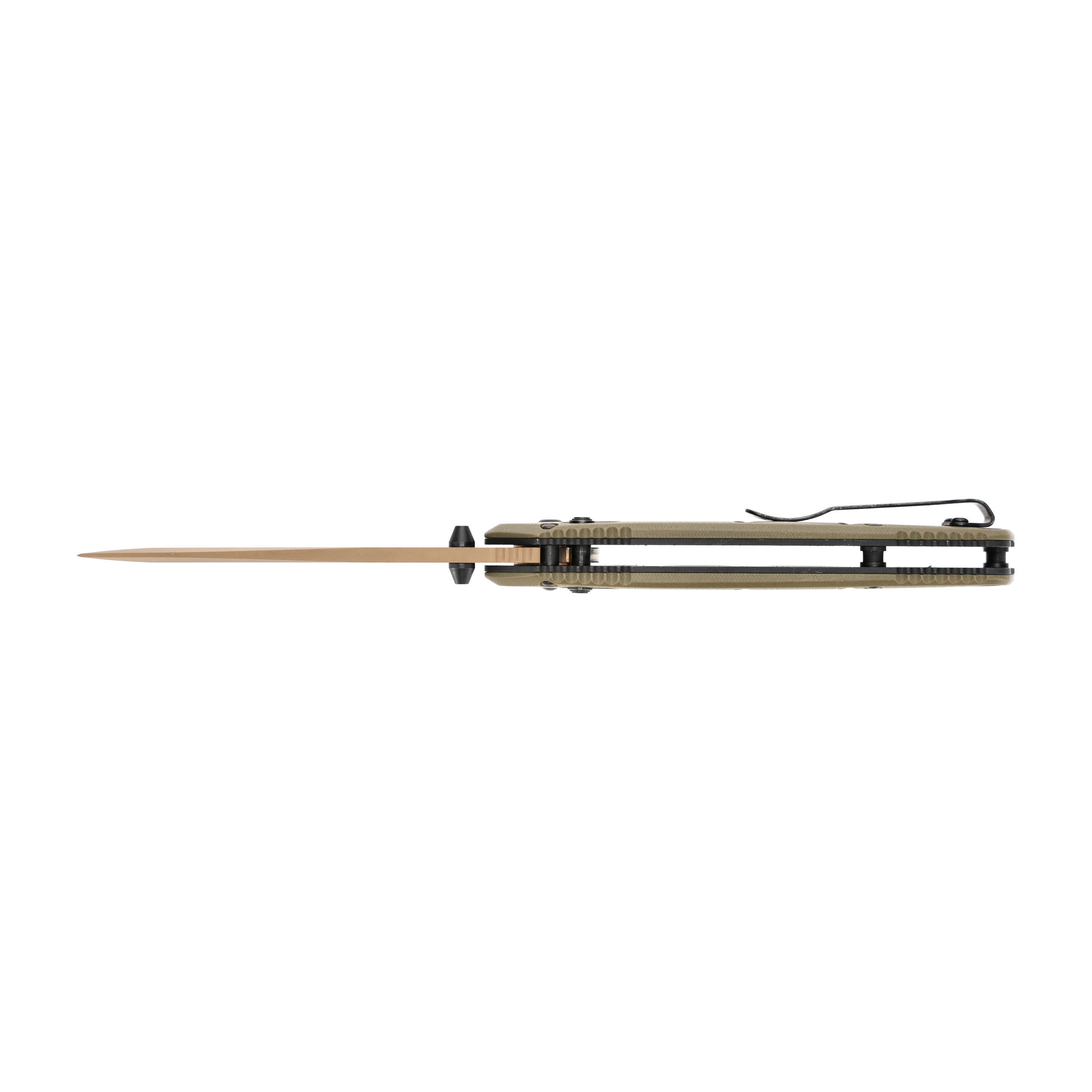 Szeroką klingę drop-point o długości 96 mm, pokryto brązową powłoką cerakote, który chroni przed drobnymi zarysowaniami i podkreśla taktyczny charakter noża. Klinga ma mocny sztych i szlif płaski, co gwarantuje płynne cięcie oraz łatwą penetrację. Głownia w najszerszym miejscu ma aż 3,5 mm grubości. Tylny odcinek grzbietu podniesiono i wykonano na nim poprzeczne frezy, pozwalającą na stabilne oparcie palca podczas pracy. Takie parametry gwarantują funkcjonalność i wytrzymałość noże oraz powodują, że może być wykorzystywany do wymagających zadań. Aby zwiększyć funkcjonalność noża, tylna część krawędzi tnącej jest ząbkowana. Ostrze typu combo jest szczególnie przydatne podczas cięcia twardych i włóknistych materiałów np. pasów, lin i taśm.