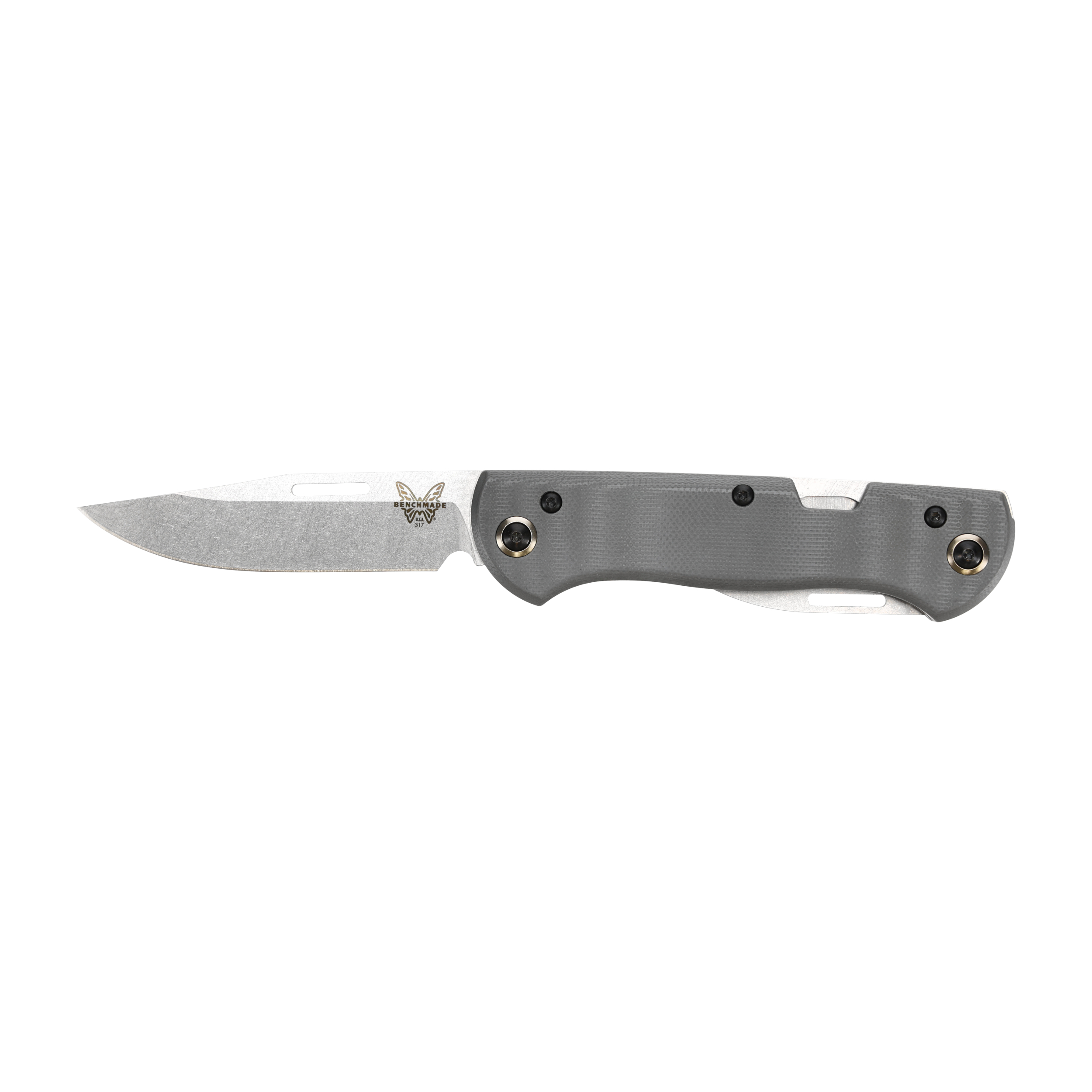 W modelu Benchmade 317 Weekender zastosowano okładziny z G10. Zastosowany laminat szklano-epoksydowy cechuje się niewielką masą, wysoką wytrzymałością mechaniczną, odpornością na wodę, zmianę temperatur, a także działanie wielu kwasów i rozpuszczalników. Minimalistyczne okładziny mają szorstką fakturę, która poprawia chwyt noża. Sztywność oraz wytrzymałość konstrukcji zapewniają stalowe wkładki wzmacniające. Z uwagi na tradycyjny charakter noża, nie posiada on klipsa kieszonkowego.