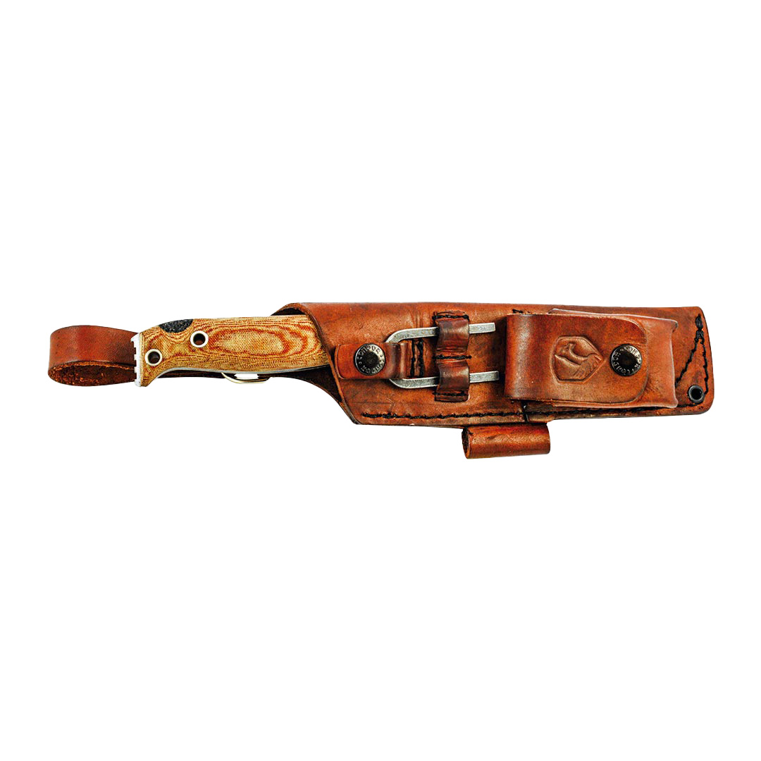 Okładziny rękojeści wykonane z ekstremalnie trwałej i oferującej pewny chwyt Micarty. Zapewniają one komfortową i pewną pracę, nawet w trudnych warunkach atmosferycznych czy przy mokrych dłoniach. Na grzbiecie rękojeści umieszczono podcięcie, które umożliwia sprawne użycie krzesiwa bez konieczności nadwyrężania krawędzi tnącej noża.