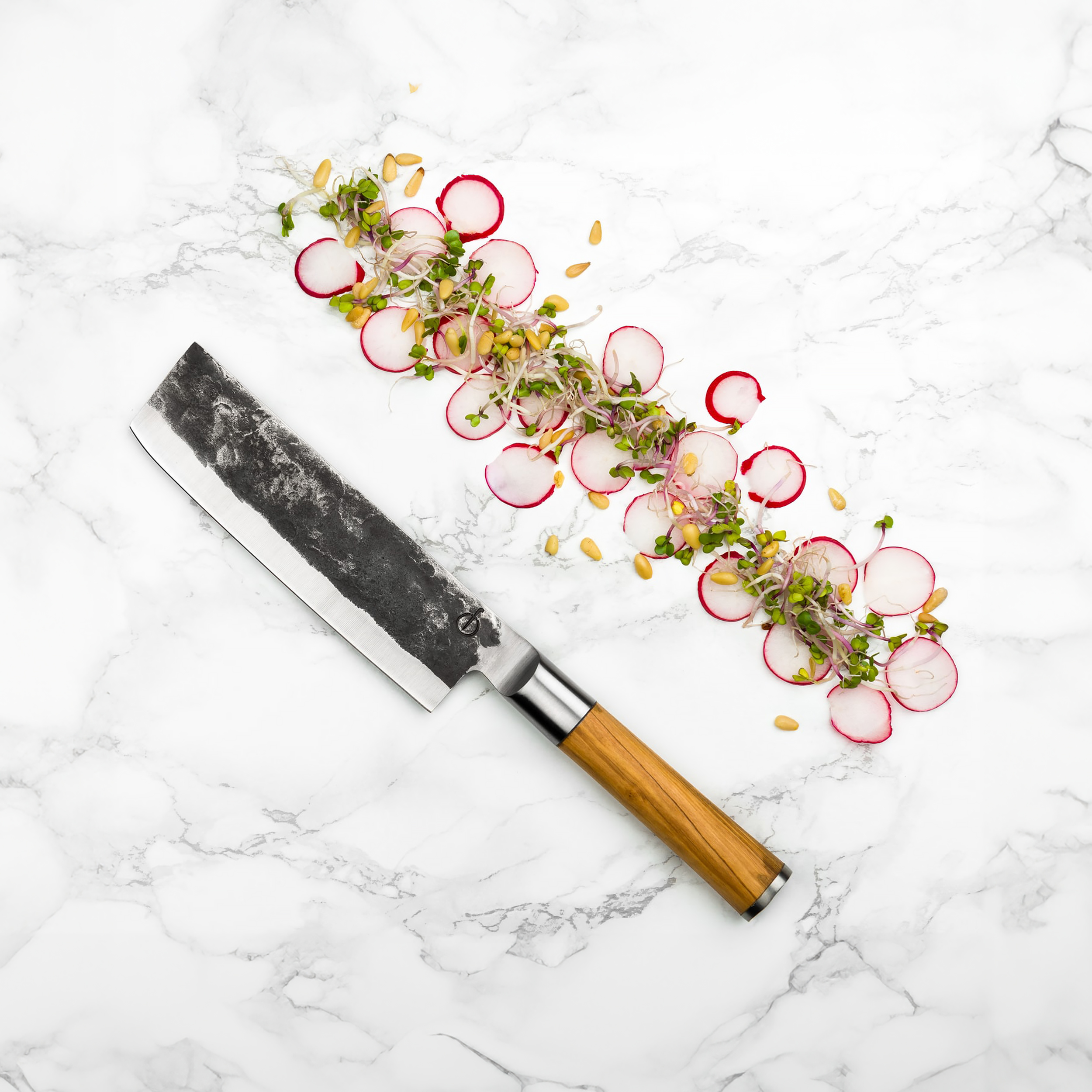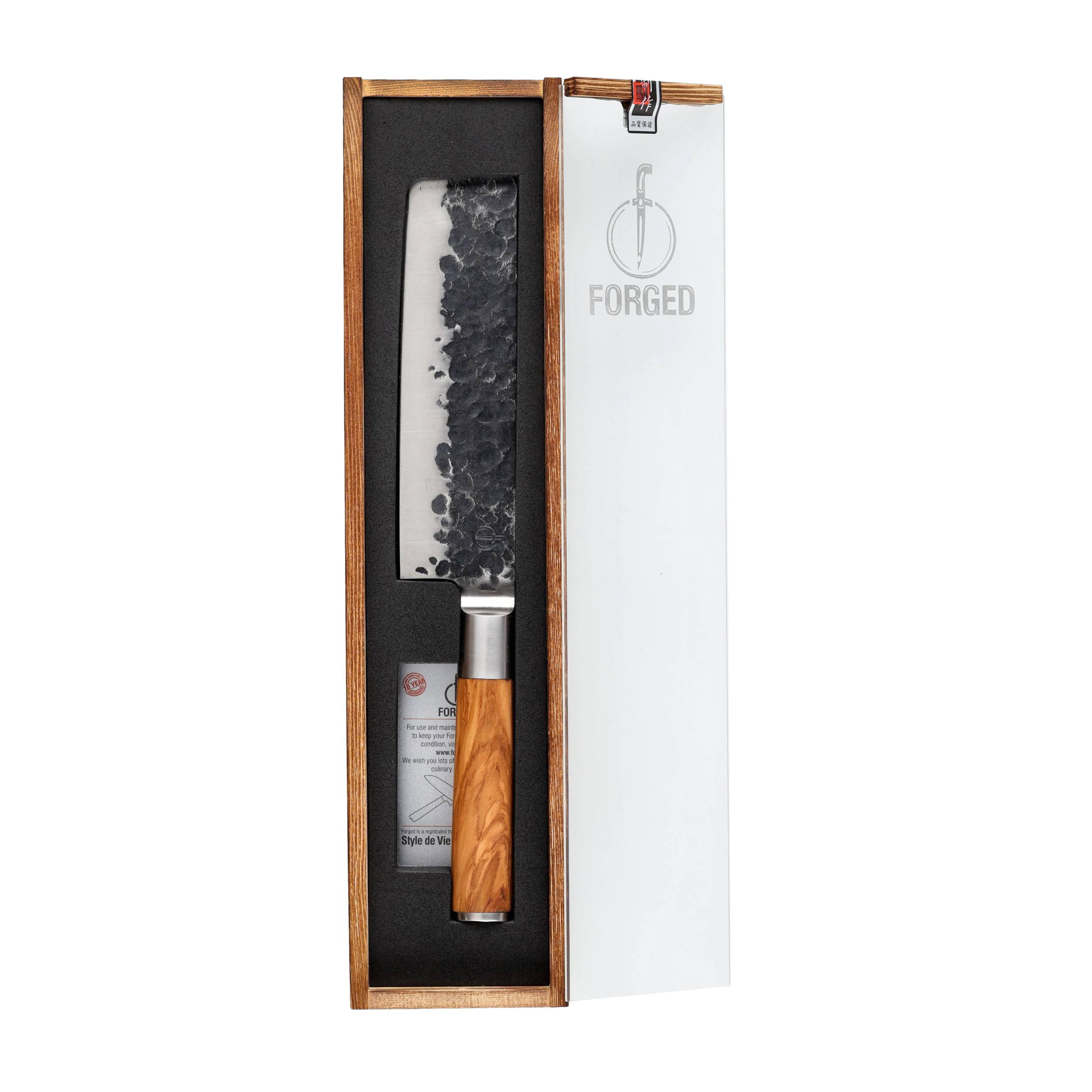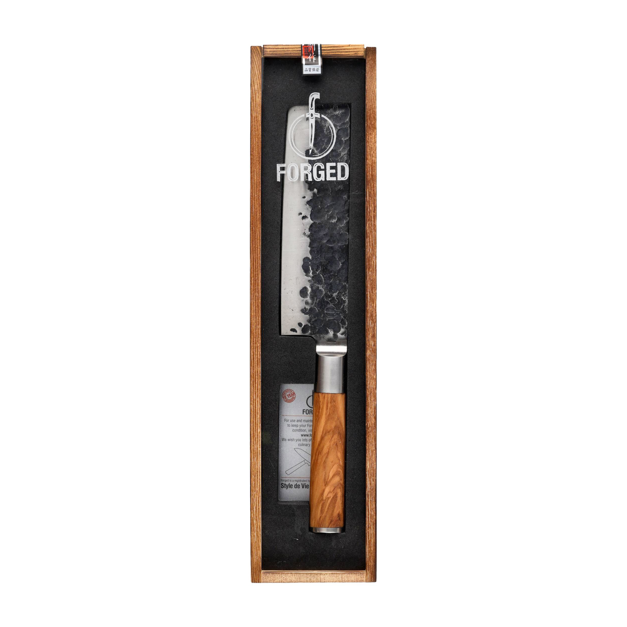 Nóż do warzyw Forged to konstrukcja w stylu nakiri, przeznaczona do dynamicznego siekania, przez co znajdzie zastosowanie przede wszystkim w dłoniach pasjonatów kuchni azjatyckiej. Umiarkowanie wydatny brzuch oraz duża szerokość głowni sprawiają, że nóż doskonale sprawdzi się przy pracy z warzywami oraz ziołami. Skuwana japońska stal nierdzewna przekłada się natomiast na odporność noża na kwaśne środowisko tworzone przez niektóre owoce. Model z linii Olive osadzony w rękojeści wykonanej ze wzorzystego drewna oliwnego.