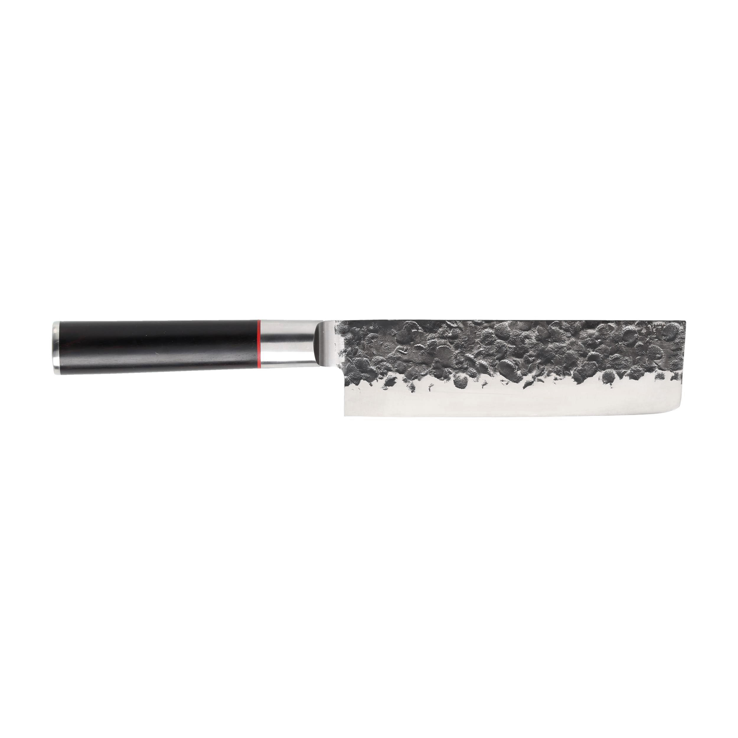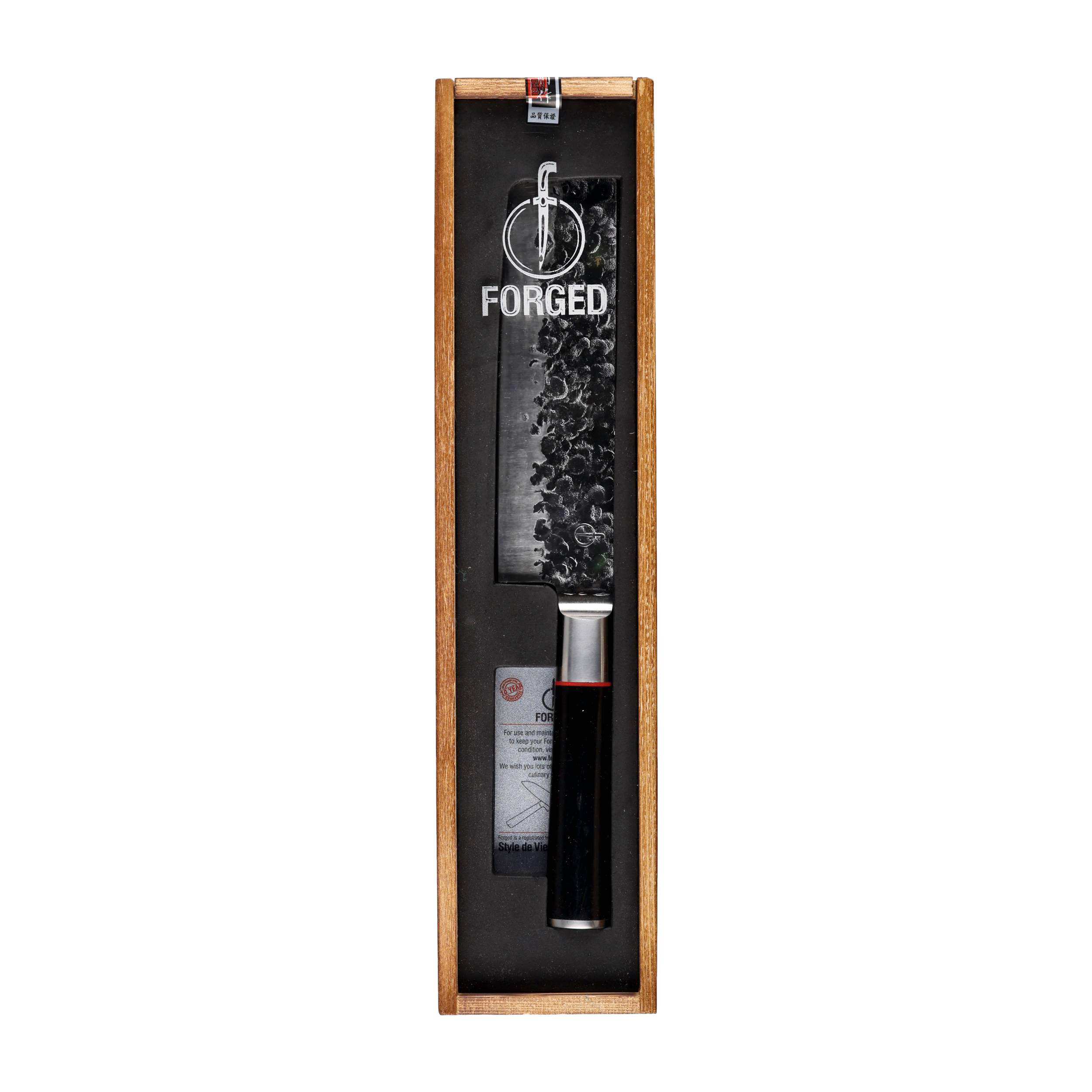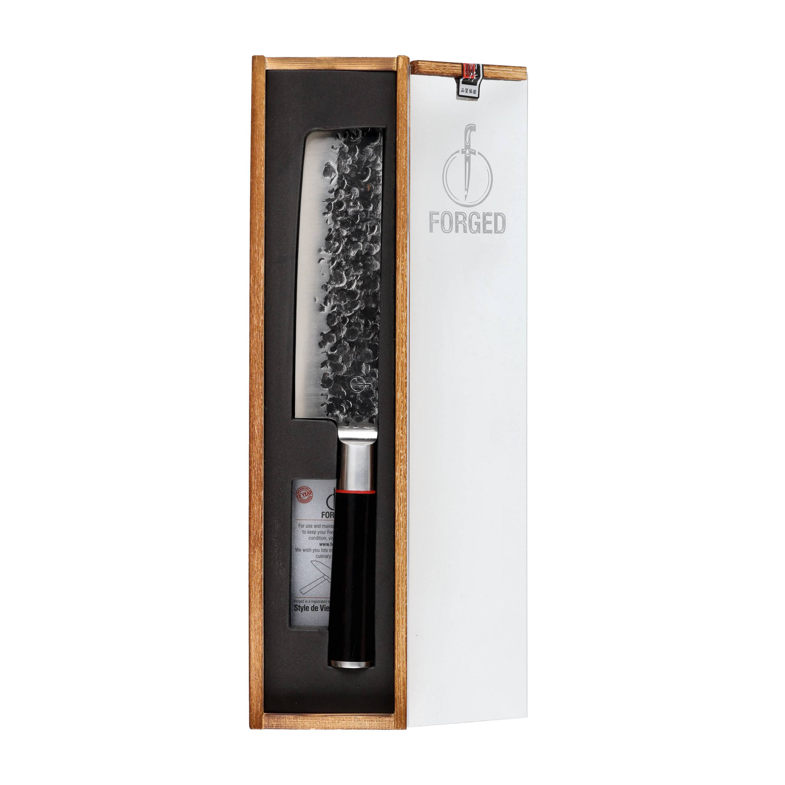 Nóż do warzyw Forged to konstrukcja w stylu nakiri, przeznaczona do dynamicznego siekania, przez co znajdzie zastosowanie przede wszystkim w dłoniach pasjonatów kuchni azjatyckiej. Umiarkowanie wydatny brzuch oraz duża szerokość głowni sprawiają, że nóż doskonale sprawdzi się przy pracy z warzywami oraz ziołami. Skuwana japońska stal nierdzewna przekłada się natomiast na odporność noża na kwaśne środowisko tworzone przez niektóre owoce. Model z linii Sebra osadzony w rękojeści wykonanej ze stylowego drewna zebrano.