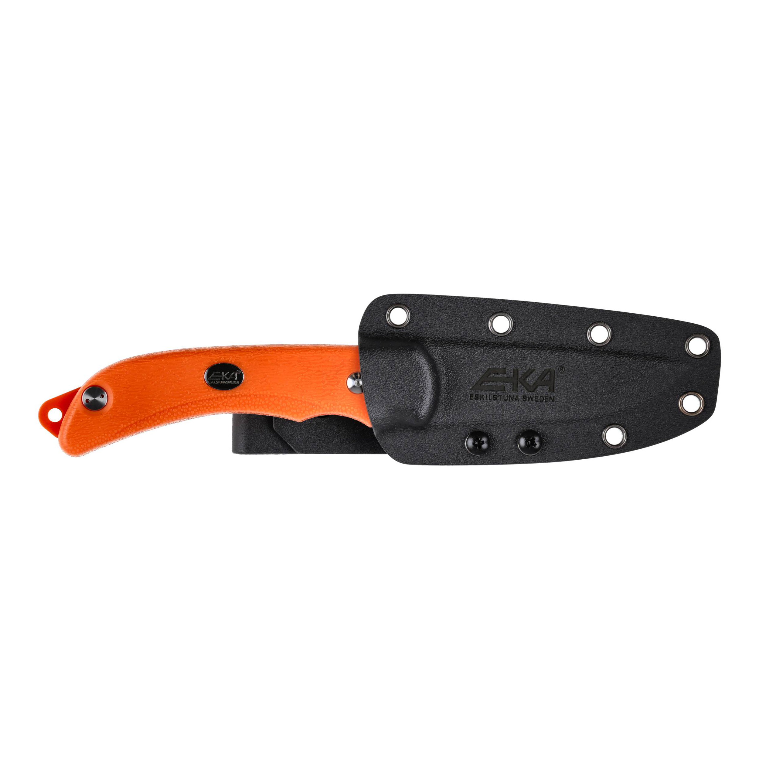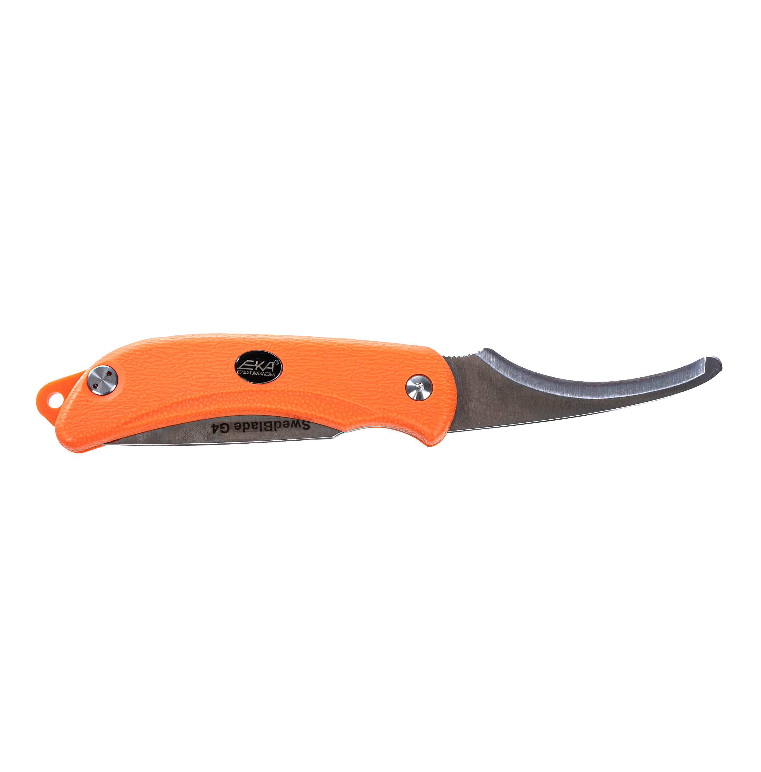 Eka SwedBlade G4 pomarańczowy to innowacyjny nóż myśliwski wyposażony w obrotową głownią z dwoma ostrzami, przeznaczony do sprawiania zwierzyny.