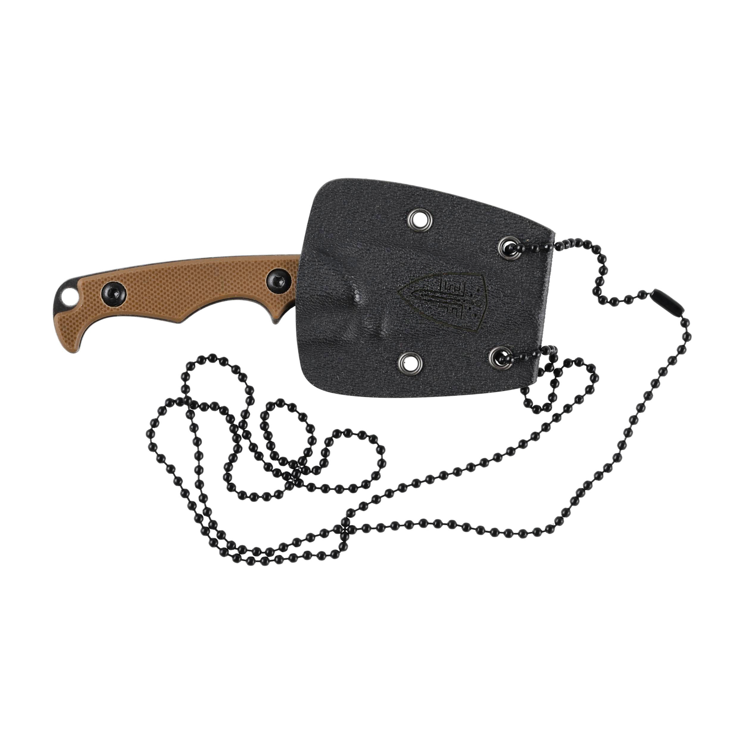 Do przenoszenia noża otrzymujemy kydexową pochewkę z łańcuszkiem kulkowym, pozwalającym na zawieszenie noża na szyi od razu po wyjęciu z pudełka.