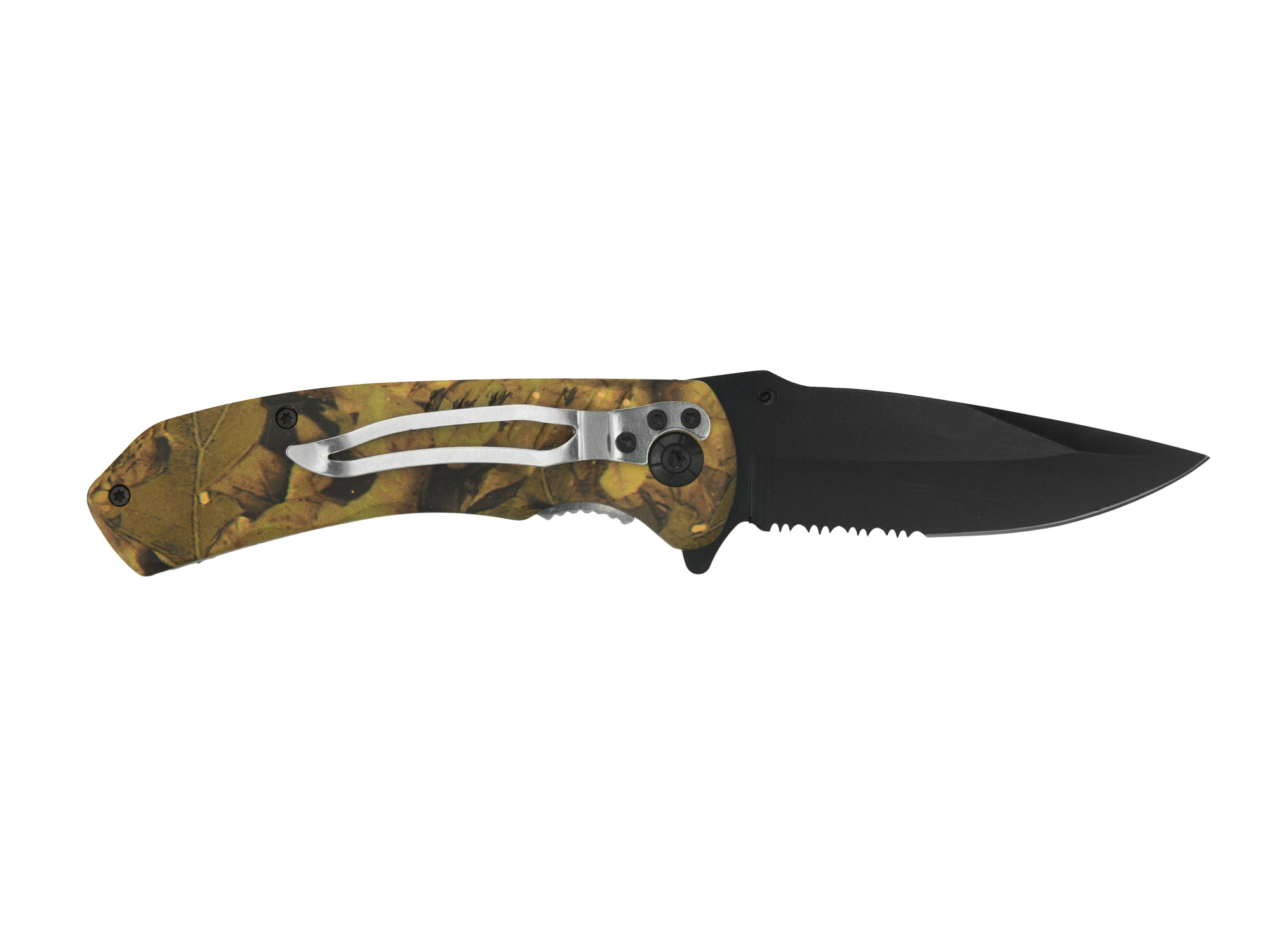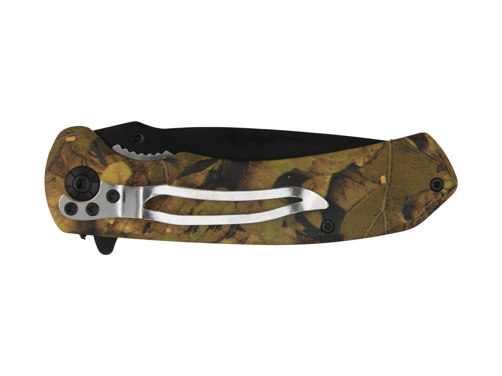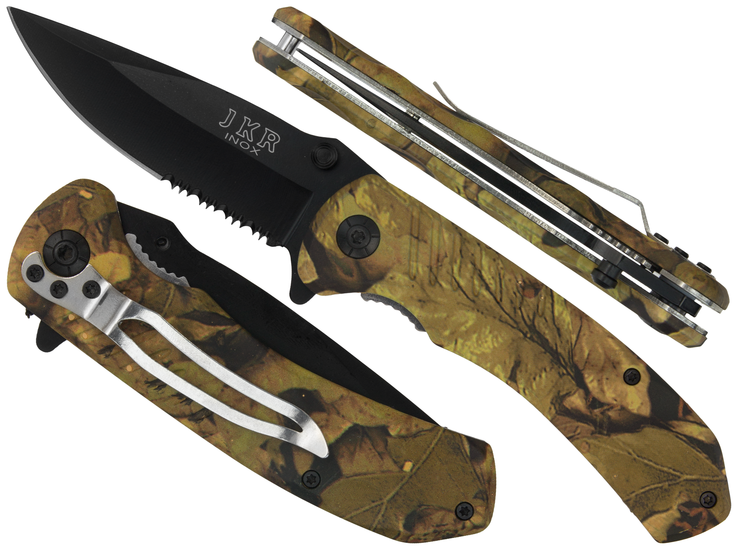Mamy do zaoferowania fabrycznie nowy, wysokiej jakości nóż hiszpańskiej marki Joker znanej na całym świecie ze swoich doskonałych wyrobów. Jest to uniwersalny, składany nóż w całości wykonany z mocnej stali nierdzewnej. Rękojeść wykonana jest z wytrzymałego metalu o ciekawym wzornictwie z gumowanymi okładzinami w kolorze leśnego kamuflażu. Nóż wyposażony jest w fliper który umożliwa szybkie i bezproblemowe otwarcie noża. Pewna i skuteczna blokada noża typu Liner Lock zapewni pewne zabezpieczenie przed niekontrolowanym złożeniem noża. Nóż posiada klips umożliwiający przypęcie do pasa czy też schowania do kieszeni. Ostrze noża wyposażone jest w powierzchnie ząbkowaną.