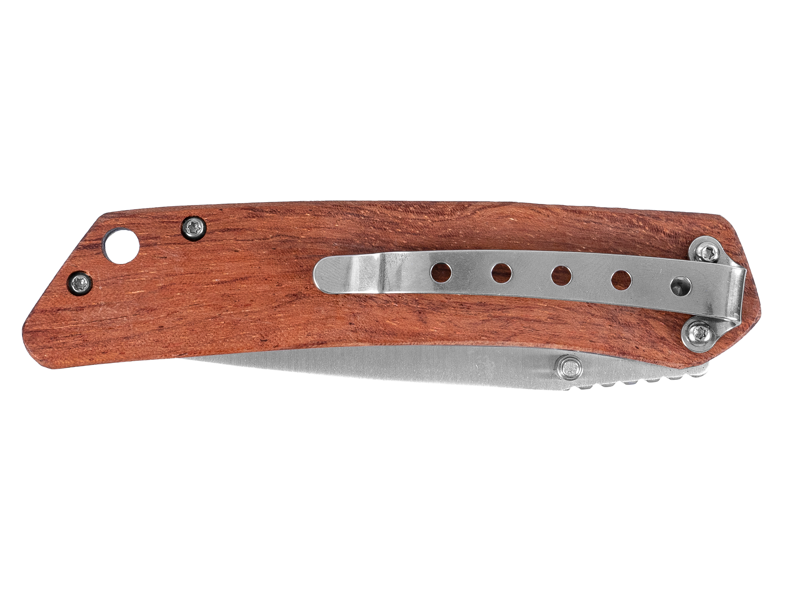 Codzienne przenoszenie noża w kieszeni umożliwia standardowy klips, montowany wyłącznie w jednej pozycji. W tylnej części noża znajduje się otwór na linkę lub rzemień.