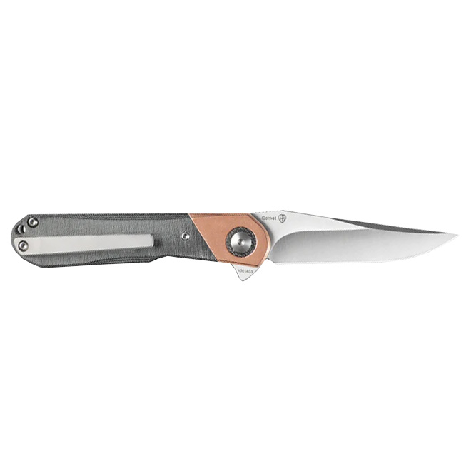 Składany nóż Comet od firmy Kizer należy do serii Vanguard, która zachowuje bardzo dobrą jakość materiałów w przystępnej cenie. Nóż Comet został zaprojektowany przez Paula Munko, a okładziny powstałe z połączenia mosiądzu i Micarty nadają mu charakterystycznego wyglądu dla "dżentelmen folder".