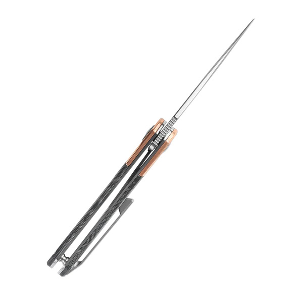 Składany nóż Kizer Comet wyposażono w wytrzymałe okładziny wykonane z połączenia czarnej Mircarty z mosiądzem. Mosiądz charakteryzuje się właściowściami antybakteryjnymi, który z biegiem czasu może pokyć się patyną zyskując w ten sposób unikatowy wygląd. Okładziny mają gładkie krawędzie, zapewniając komfortowy chwyt nawet podczas dłuższej pracy.