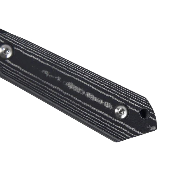 Rękojeść noża tworzą okładziny z mikarty mocowane do trzpienia śrubami. Mikarta to kompozyt produkowany z termoutwardzalnego tworzywa i płótna. Mikarta jest lekka, cechuje się dużą wytrzymałością mechaniczną, odpornością na wilgoć, temperaturę oraz działanie wielu rozpuszczalników i kwasów. Na zakończeniu rękojeści znajduje się otwór na paracord lub rzemień. Codzienne przenoszenie noża przy pasie lub sprzęcie ułatwia pochewka z kydexu wyposażona w obustronne szlufki zapinane na metalowe napy.