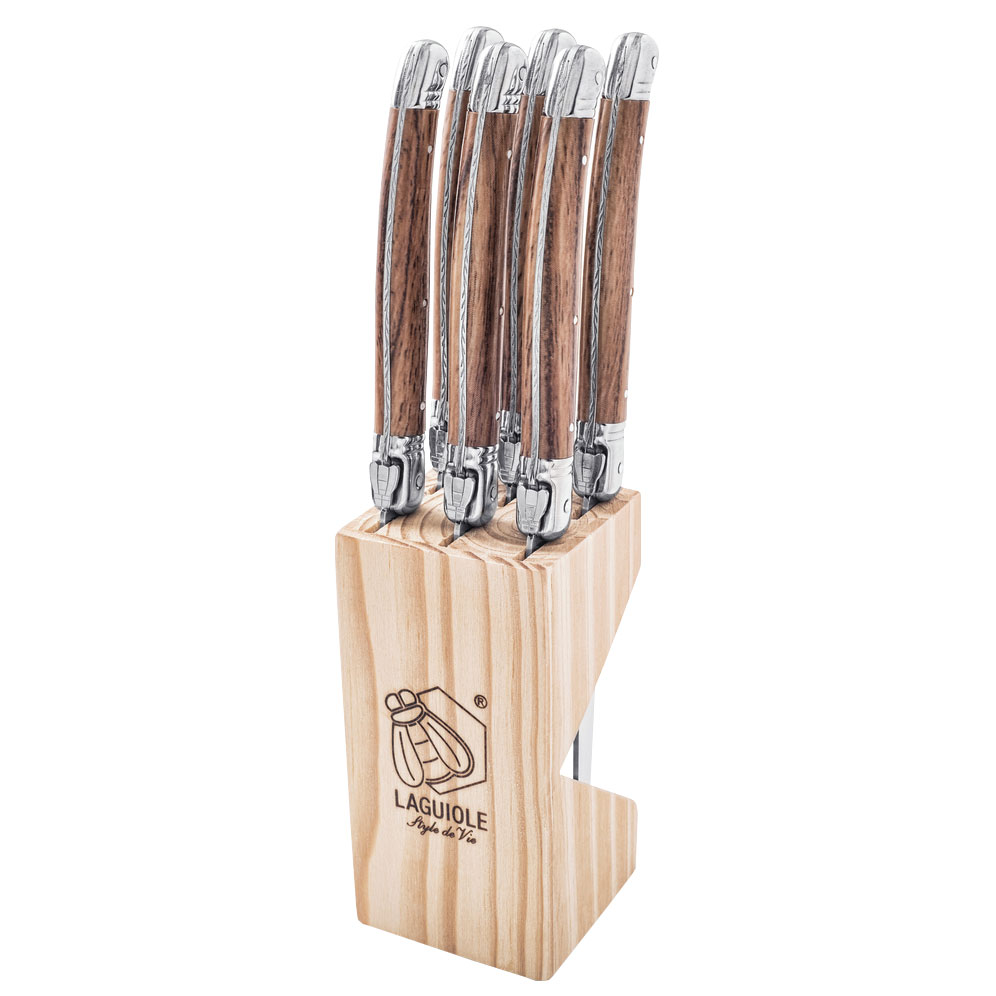 Zestaw noży do steków Laguiole Style de Vie oferuje użytkownikowi:Marka Laguiole Style de Vie wywodzi się z miasta uznawanego za francuską kolebkę wyrobu noży. Tworzone przez producenta projekty nawiązują do tradycyjnej, prowansalskiej estetyki, dzięki czemu są niezwykle eleganckie i doskonale wpiszą się w gust osób doceniających klasyczne wzornictwo. Zastosowanie dobrze odwzorującego drewno polimeru do oprawy noży sprawia, że nie tylko sprawiają świetne wrażenie, ale również są dostosowane do mycia w zmywarce.