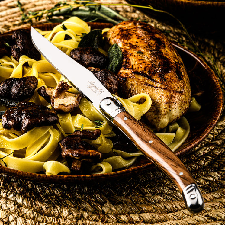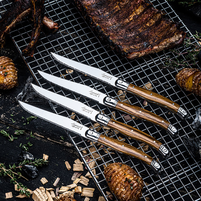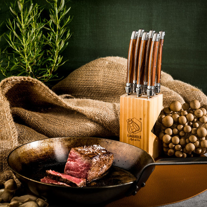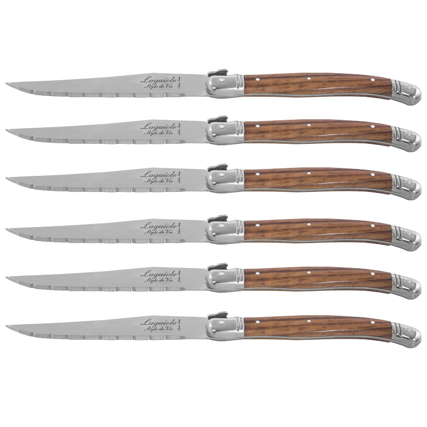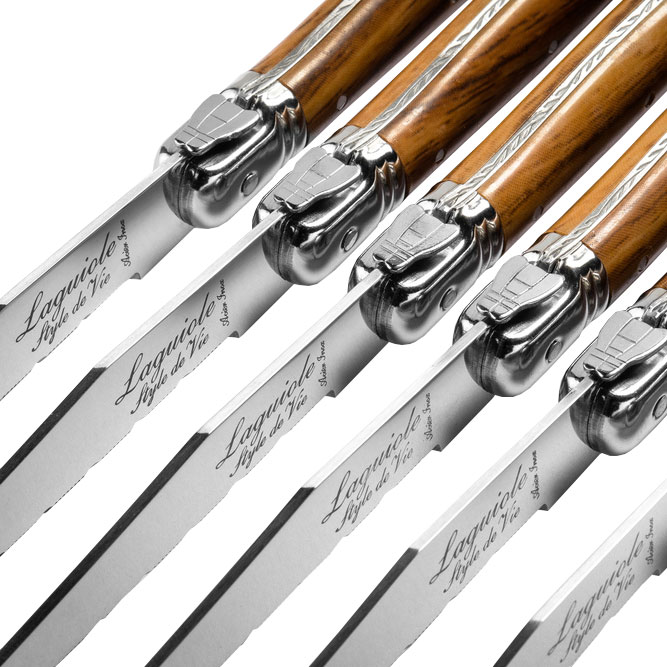 Komplet przeznaczonych do steków noży kuchennych marki Laguiole Style de Vie, gwarantujący komfort krojenia tej niekiedy wymagającej potrawy. Ząbkowana głownia pozwoli nam poradzić sobie z mniej delikatnymi wykrojami, a stylowy projekt noża doskonale wpisze się w estetykę kuchni w tradycyjnym stylu. Konstrukcja swoim wzornictwem nawiązuje do tradycyjnych prowansalskich noży składanych, których korzenie sięgają początków XIX wieku.